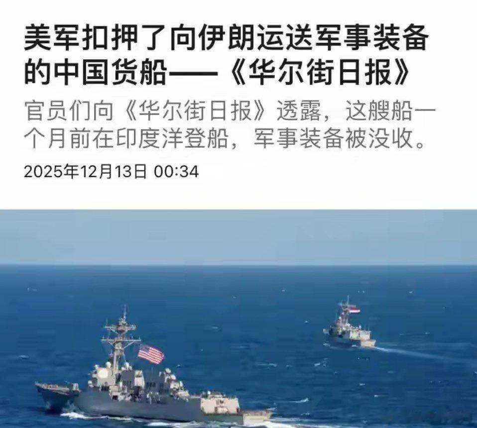 出事了,美军突袭中国船只,销毁货物扬长而去,外媒:一月前干的一波未平,一波又起,在中日纷争没有落下帷幕之前,为什么在国家公祭日的当天,美国媒体会突然报导,美军突袭中国船只,销毁船上货物后扬长而去,这起事件又意味着什么?为什么会在这个时间节点报道出来呢?下面就让我们一起来解读一下该世界。12月12日《华尔街日报》报道,在上个月的时候美军在距离斯里兰卡海岸数百英里的印度洋上,强行截停一艘从中国驶向伊朗的船只,随后一支美国特种作战兵小组登上了中国船只,查封里边的货物,之后对船只进行了放行。接受采访的一名美国官员表示说,被截获的货物包含可能用于军民两用的常规武器部件,他们在得到密报之后进行了查封,目前这批货物目前已被美国当局销毁。随后有记者联系了美国印太司令部进行询问,作为当事方的美国印太司令部,表示对该事件不予置评。此事的发生,可以从侧面反映出特朗普在面对伊朗问题的强硬作风,以至于连中美关系都不顾及也要搜船。同时,也让人联想到1993年的“银河号事件”,不过相比于银河号也略有不同,那就是搜查之后立马放行。但是也让人觉得略微有点奇怪,事情发生在上个月,但是中外媒体却一直没有报导,为什么偏偏选择在今天报道出来的,有可能可以下的局势有着很大的关系。1、伊朗明确表态支持委内瑞拉,谴责美国对委内瑞拉的军事行动,同时伊朗还谴责美国限制伊朗外交官在纽约的活动范围阻止他们在美国使用银行账户限制他们日常购买东西,还对伊朗外交官正常履职进行阻挠。此举引发了美国的不悦,所以选择将新闻报道出来,进一步孤立伊朗2、美国对华鹰派人物施压,鲁比奥和中央情报局局长拉特克利夫,要求调查中国公司自9月下旬以来向伊朗交付2000吨高氯酸钠,他们称中国陆续向伊朗运送了10到12船的化学物品,可以让伊朗快速制作高达500枚的中程导弹填补库存空虚。五角大楼顶不住国会的压力。所以才有了此次突袭的事情发生。3、和目前的中日局势有关系,美国想借助该事件,在国际层面杀一杀中方的威风综上所述,印度洋属于国际公共海域,不管船上用的是什么样的物资,美国这种在公海强制登检他国商船的行为,都属于严重违反《联合国海洋法公约》,侵犯船旗国的主权和航行自由。想必中方必定不会对该事件坐视不理,将会在外交层面解决该事件。就让我们继续关注该事件的最新进展。