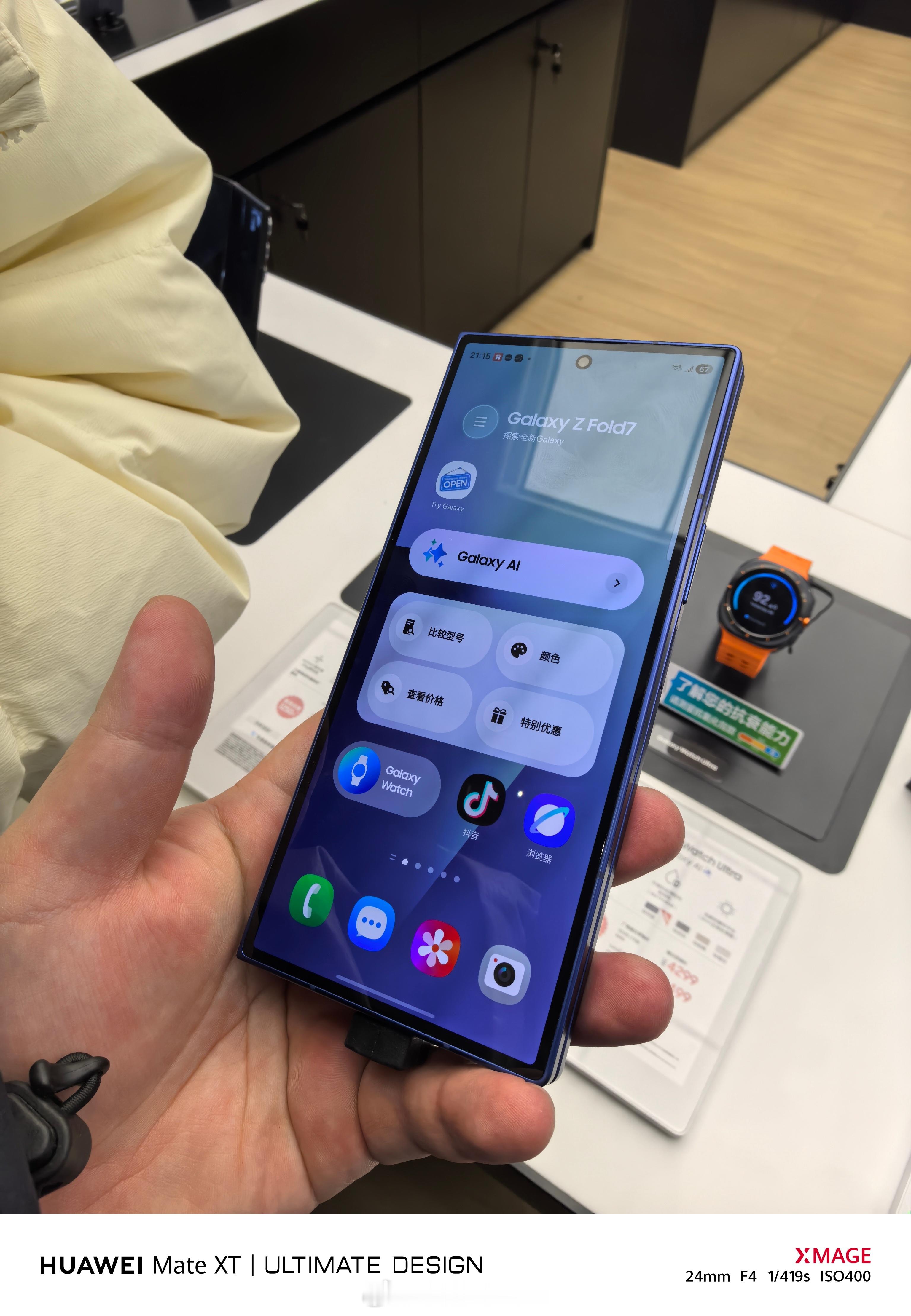 三星的折叠屏是真的超级无敌精致。尤其合并起来严时,外框严丝合缝的并在一起,太有感觉了。我觉得华为的外观对我这个岁数来说还是老登味过重了。但三星的三折叠开合方式太过抽象,而且缺失了两折叠的状态,难以接受。属于外观夯,实用性拉完了。唯一的优势可能是和三星双折比起来没加价多少。