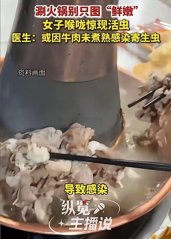 “太吓人了!”近日,湖北襄阳,一女子吃火锅时,觉得牛肉煮太久了不新鲜,于是在锅内涮了几秒就拿出来吃,吃完后,觉得嗓子不太舒服,还有刺痛感,于是去医院检查,没想到结果显示她喉咙里面竟然有一条活虫!网友:再也不吃三分熟了!天气变冷后,不少人喜欢去店里面吃火锅,不仅暖和还能涮肉吃,简直是享受,不过有些人为了追求鲜嫩口感,经常在肉下锅还没一会时就开始食用,完全不管它熟没熟。据媒体12月13日报道,马女士和朋友一起去吃火锅,在吃牛肉卷时,为了保证它的嫩滑口感,于是拿起来在锅里面仅仅停留了几秒就开始吃,十分享受。可吃完后没多久,马女士就感觉喉咙不对劲,感觉里面有东西在爬,而且还有刺痛感,她刚开始以为是吃了火锅上火,没想到后面异物感越来越强烈,这让她不得不去医院看一下。医生检查后也惊呆了,因为马女士的喉咙里面竟然有一条活虫,而且正在蠕动!得知这一结果的马女士可吓坏了,还感觉有一点恶心,随后医生将虫取出来,发现这是一条阔盘吸虫。这种虫通常在牛羊身上,人体内很少见,马女士这才反应过来,肯定是自己吃火锅时肉没有煮熟导致的,好在这个虫只在咽喉部位活动,没有对身体器官造成伤害。在涮煮肉类食品时,应该保证彻底煮熟,不要为了追求口感煮几秒就捞出来,也不要吃生食,夹生肉和吃饭的筷子也不能用同一双,这样才能避免被寄生虫感染。信息来源:《女子吃完火锅后,喉咙有刺痛感,就医后发现喉咙里有一只阔盘吸虫成虫。》纵览新闻