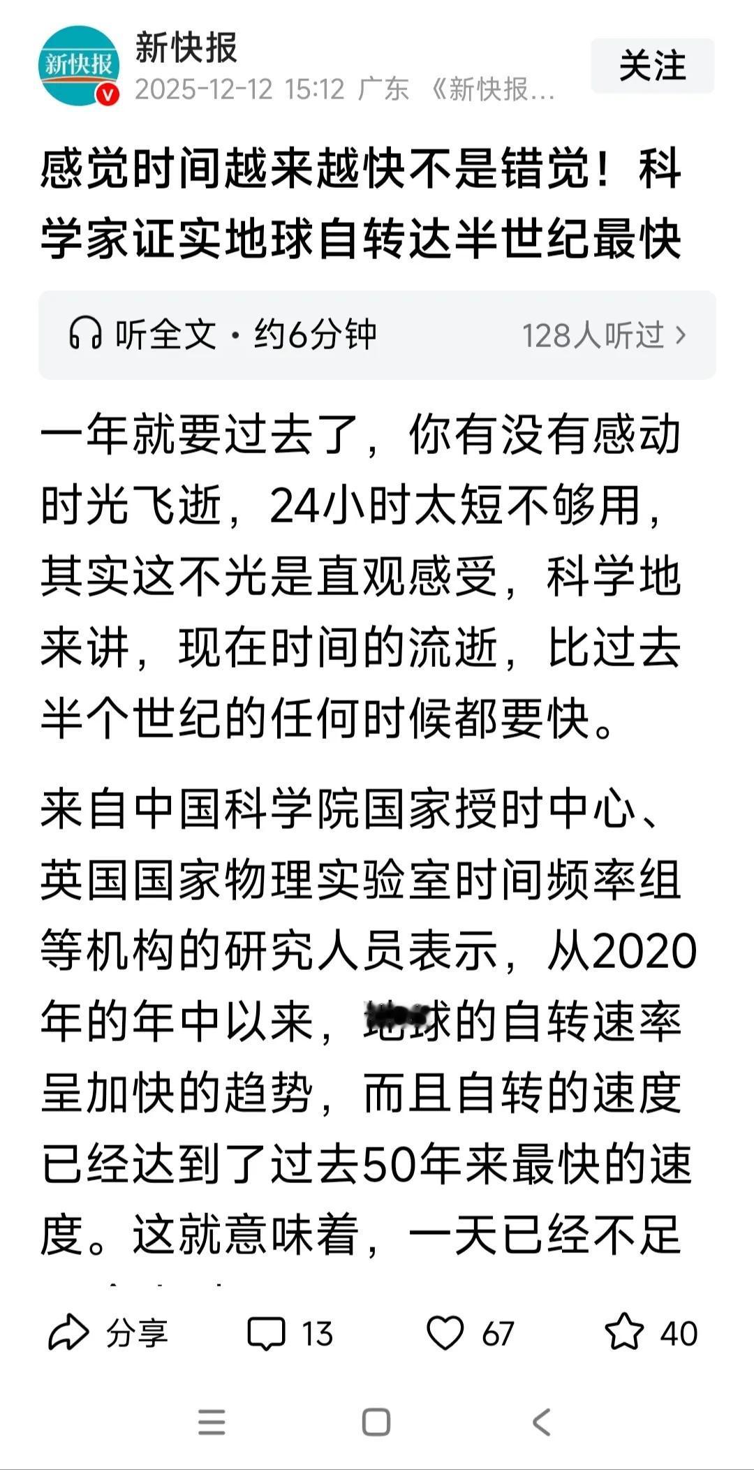 感觉时间过得快,原来是真的,今天看到报道说地球自转速度加快,一天已不足24小时,瞬间惊掉下巴。原来感觉时间过得快不是错觉,从2020年年中以来,地球自转速率就呈加快趋势,现在已经达到过去50年来最快。 想想也是,一年又一年,总觉得时光飞逝,24小时根本不够用。这地球自转加快,可能和表面形态变化有关,就像花样滑冰运动员聚拢身体转得更快。时间都变快了,感觉自己追赶时间都更吃力了,咱也只能在这有限的时间里,更努力地抓住每分每秒了。