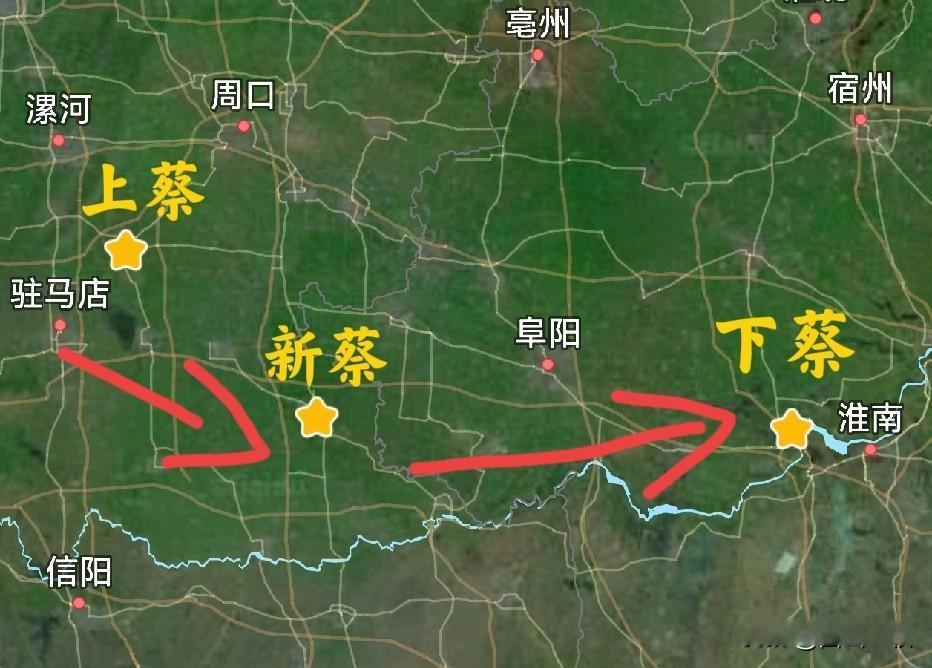 一线排开的三个“蔡”:上蔡、新蔡、下蔡,互相之间有着奇妙的缘份,因为它们有一条共同的根。 —1046年,周武王的弟弟叔度建立蔡国,定都蔡,也就是现在的驻马店上蔡县。当时这一片蔡国地盘都叫蔡,并没有上、下之分。 这样过了500多年,到—529年时,楚国对蔡国威胁越来越大,蔡国于是主动将国都东迁200里,远远避开强楚。新的国都,被命名为新蔡,而原来的蔡,因为在新蔡的西边,古人以西为上,所以叫上蔡。 但是楚国的威胁仍然还在,吴国也强盛起来了,吴楚争霸,蔡国倒向吴国阵营,但地理上处在吴楚交锋的前沿,很危险。于是定都新蔡36年后,公元前493年,吴王夫差让蔡国再次迁都,继续向东400里,迁到了一个叫“州来”的地方(古州来国),也就是今天的安徽淮南凤台县。这里实际上属于吴国的,因为吴国刚刚把州来国给灭了,这块土地就做了顺水人情给了蔡国。蔡国人还是把新都叫做蔡,既然西边有上蔡,东边这个就叫下蔡了。 上蔡、新蔡之名沿用了两千多年,现在都是驻马店下属的县,下蔡作为地名却逐渐退出了历史舞台。明朝初年,朝廷正式废除了下蔡县。清朝又将凤台县治所迁到下蔡,凤台也就取代了下蔡,在这里安家了。如今的凤台县城里,还保留了一条下蔡路,提醒着人们古城曾经的历史。