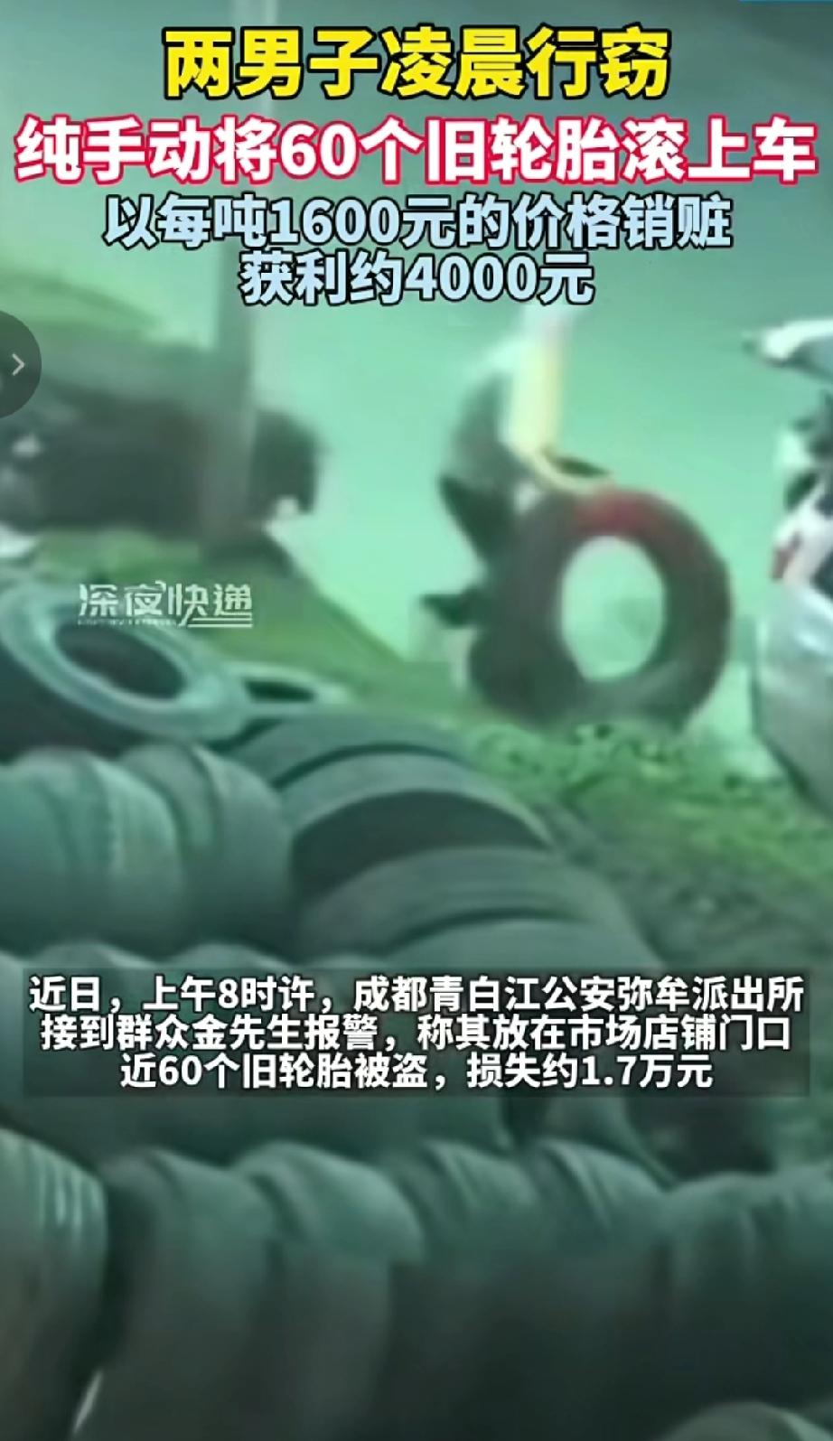 近日,成都青白江的金先生报警称,其放在市场店铺门口的近60个旧轮胎被盗,损失约1.7万元。民警通过监控发现,当日凌晨两名男子驾驶白色越野车,在店铺门口分工协作,多次将路边轮胎滚上车,随后运往附近废品站。两人谎称轮胎是“自家修车换下的旧胎”,以每吨1600元的价格销赃,获利约4000元。目前犯罪嫌疑人曲某、孔某因涉嫌盗窃罪已被公安机关依法刑事拘留,案件正进一步办理中。(来源于@云上深夜快递)