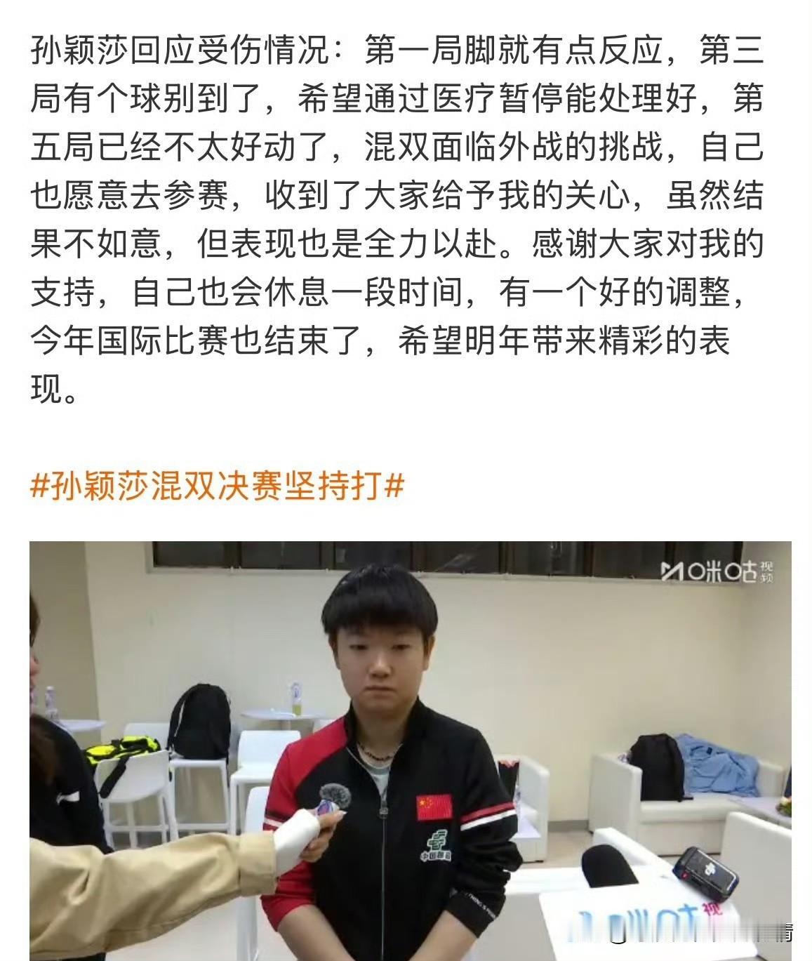 呼吁重视运动员健康,给孙颖莎休整空间 孙颖莎的伤病问题,能否让相关方正视运动员规划,停止对选手身体的过度消耗?作为兼项主力,她已在巴黎奥运周期圆满完成混双重任。2025年她更是国乒唯一不输外协的选手,其健康关乎队伍整体布局。 期待重视梯队建设,不仅要打磨小将技术,更要锤炼品格与责任心,摒弃“兜底论”,责令年轻选手扛起应尽的队伍责任。 强烈呼吁相关方以人为本,批准孙颖莎退出后续赛事,给予其充分的治疗与休整时间。