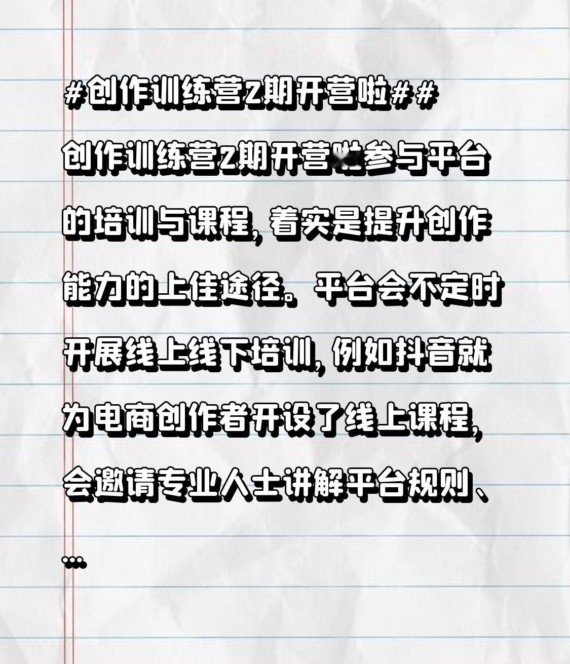参与平台的培训与课程,着实是提升创作能力的上佳途径。平台会不定时开展线上线下培训,例如抖音就为电商创作者开设了线上课程,会邀请专业人士讲解平台规则、推荐机制以及创作技巧,助力电商创作者提升直播带货的推荐量与销售额。 除平台官方培训外,第三方机构和个人开设的课程同样值得学习。他们会结合实际案例,深入解析平台规则,使我们能更清晰地知晓如何创作出更契合平台调性的内容。我报名参加创作训练营2期,正是期望借助这些培训与课程,让自己的创作之路更为顺畅,产出更多优质作品。 此外,创作训练营里还能结识到众多志同道合的伙伴。大家来自不同的领域,有着不一样的创作风格和经验。在交流互动中,能碰撞出思维的火花,为自己的创作带来新灵感。 在训练营里,我们可以互相分享自己创作过程中的酸甜苦辣。有人在文案撰写上得心应手,就能为大家传授遣词造句、情节构思的秘诀;有人擅长视频剪辑,也会毫无保留地分享剪辑技巧和特效运用方法。 我相信,在创作训练营2期的这段时光里,通过系统的学习、和伙伴们的交流,我一定能实现创作能力的大幅提升,在创作道路上越走越远,创作出更多有价值、有影响力的作品,让更多人看到我的创作成果。