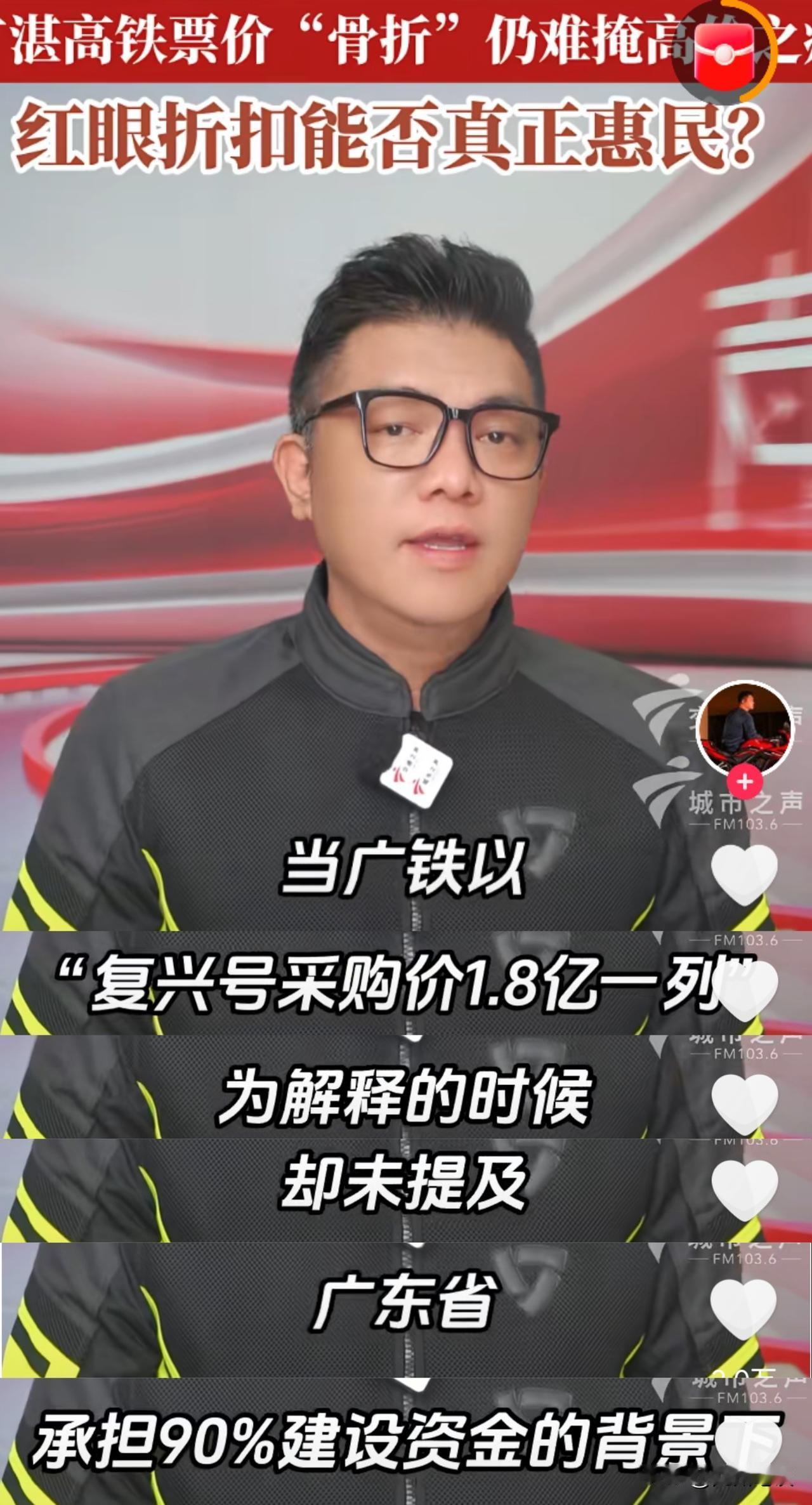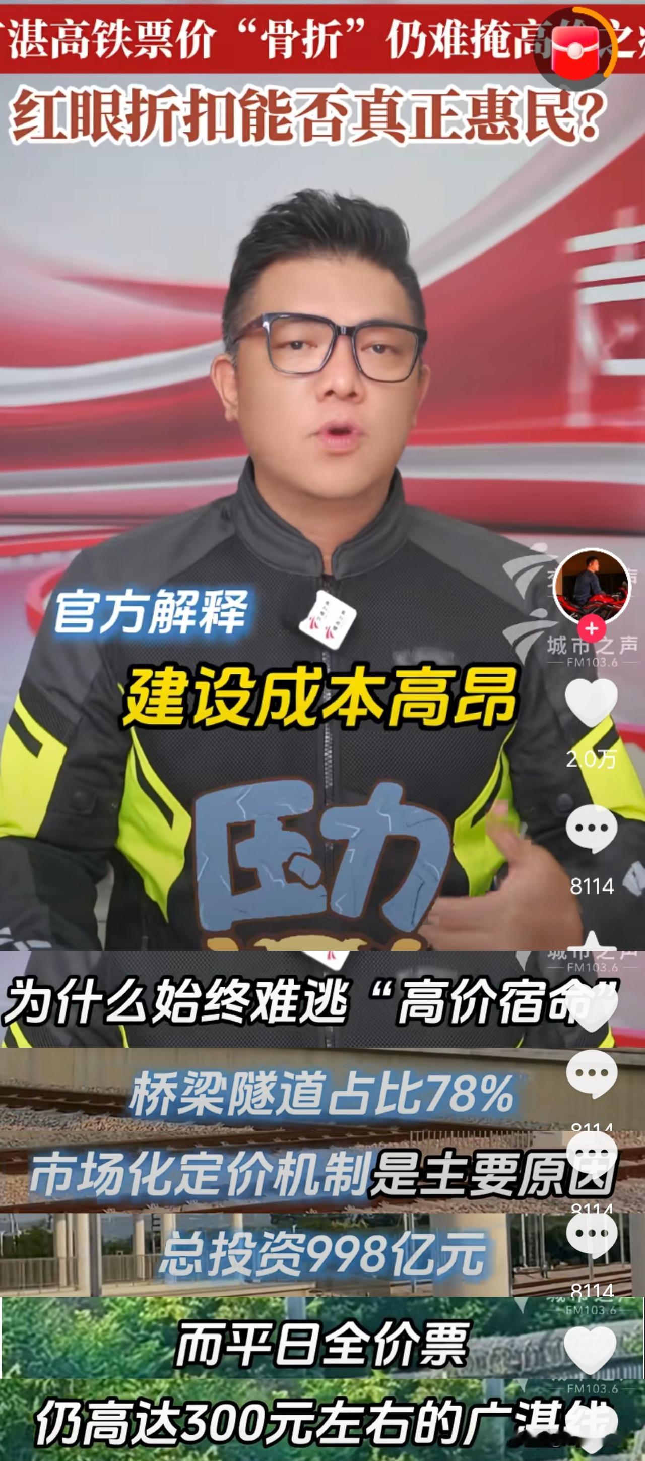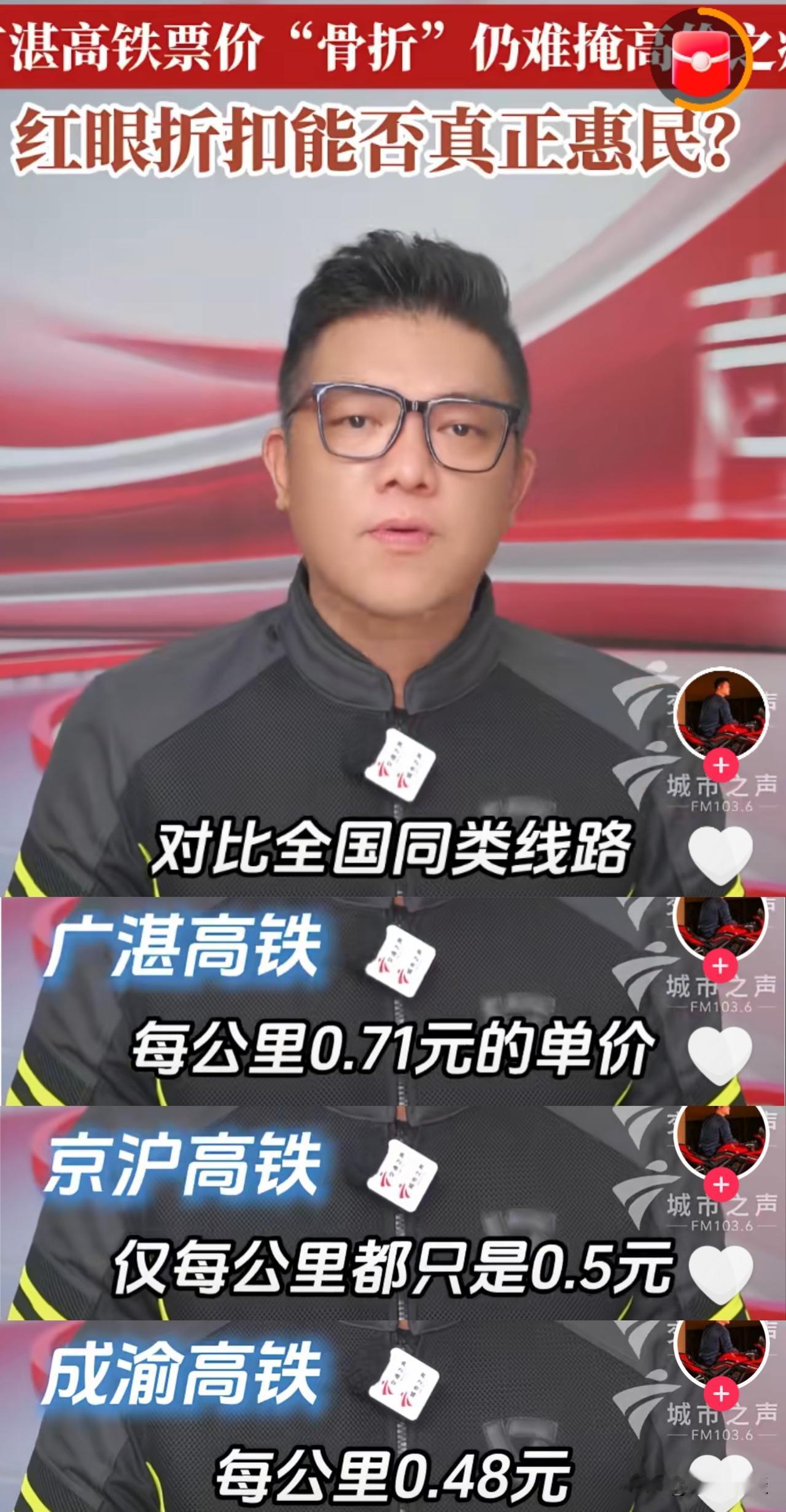 “广东魔咒”,媒体都发出灵魂拷问! 广湛高铁开通在即,票价高达300元左右!舍得坐吗? 广铁管内铁路高票价,“横行”广东,高票价始终萦绕在广东旅客头上挥之不去的魔咒! 例如,广珠城际,全程117公里,收费70元。笔者贡献了超十万元。甚至补票比直接买全票还便宜3元的奇葩定价机制。(先买广州南到小榄的票,再补票到唐家湾票价省5元,加手续费2元后还便宜3元)。 目前,广州北站到湛江西的高铁票价284元,估计广州白云站到湛江西站的新高铁,票价不会低于这个数。 市场化定价机制,看来目前全国只有广铁在实行,其他铁路集团公司的票价考虑了公共交通的惠民性质。广东可能是以尽快收回成本,盈利为主要目标吧? 当然了,你肯定说嫌贵可以不坐,可以坐便宜的慢车。 问题是,高铁又不是只有广东有,全国各省市绝大多数都通高铁。 高铁作为国营为主,远距离交通工具,自然是全国差不多才好,又不是只有你一个。
