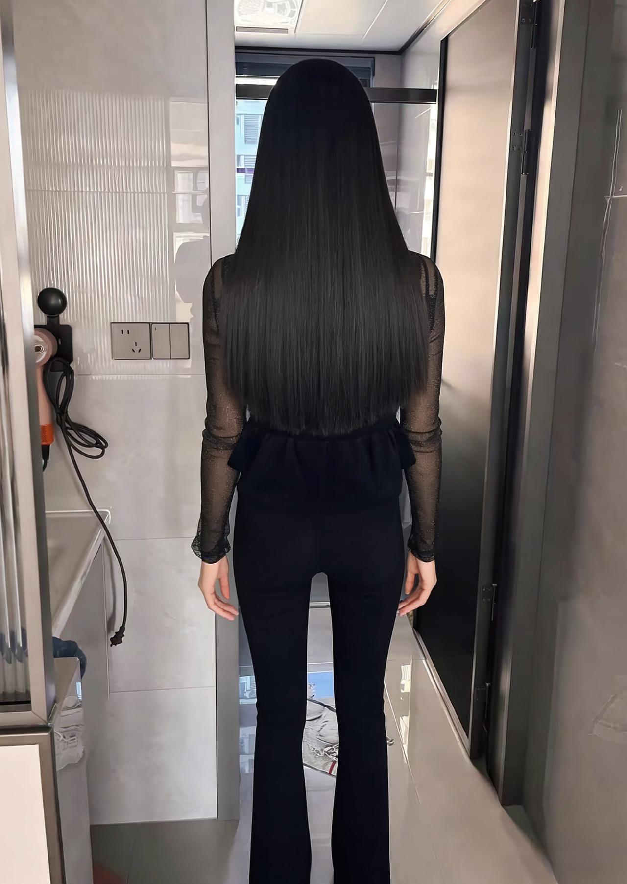 我偏爱于你背过身的时刻 让视线避开所有具象的问询 长发遮住的,不只是后颈的弧度 还有不想被拆解的柔软与坚硬 ~ 黑色蕾丝咬着手腕的骨 裤线笔直,切分走廊的光影 瓷砖反射着半截身影 像被生活剪碎的唯美拼图 ~ 不必回头,不必解释 骨骼的线条自会说话 那些藏在布料下的柔美 是写给自己的秘密诗行 ~ 金属与玻璃的冷意里 长发是唯一的温软 在狭窄的空间里生长 如墨色藤蔓,绕着孤独向上
