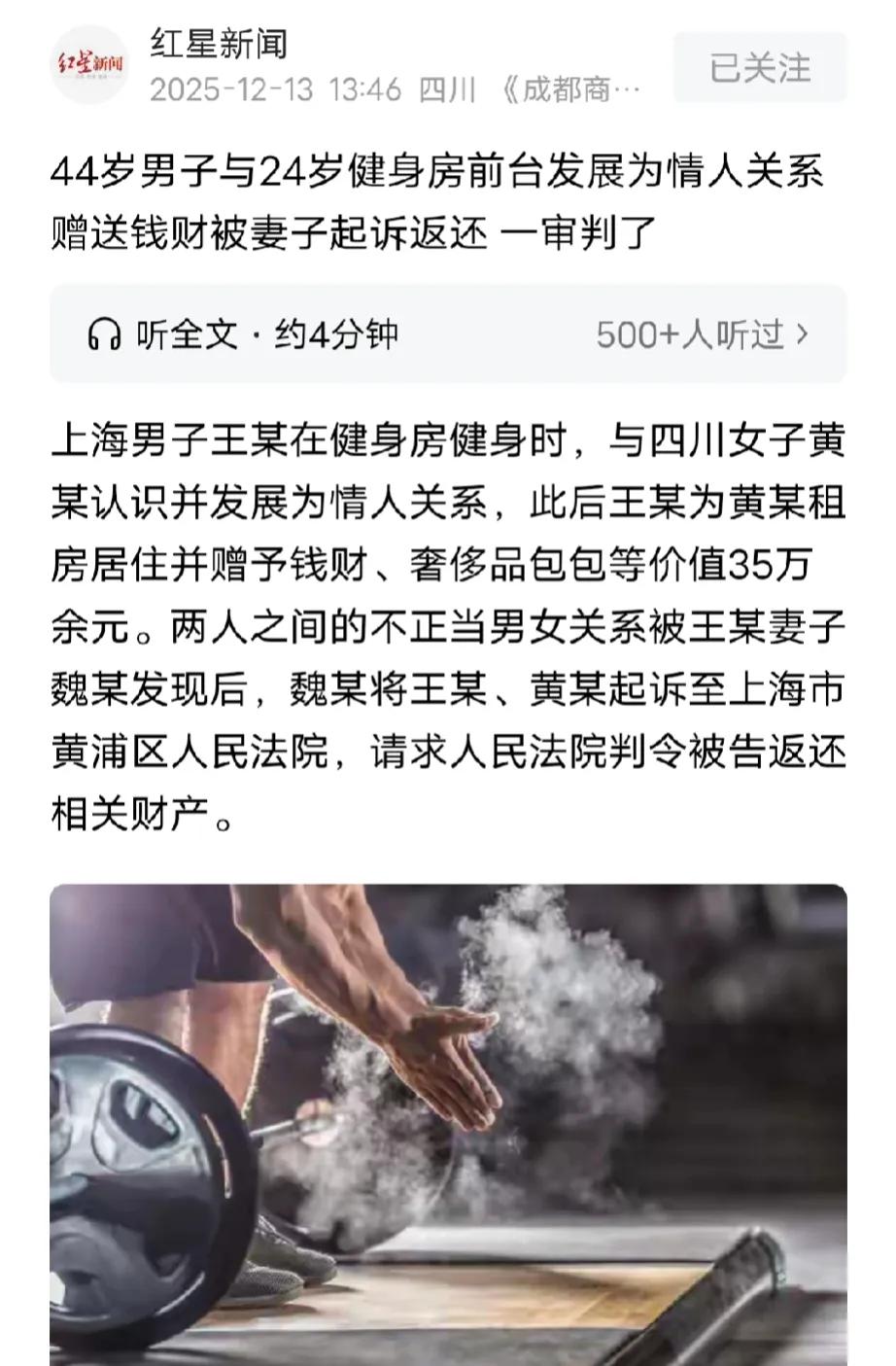 上海, 44岁已婚男子爱上24岁前台小姑娘,为了得到她,男子不惜豪掷40多万去追求,姑娘面对出手阔绰的男子,很快沦陷,两人背着男子妻子偷偷搞到一起,为了方便约会,男子给姑娘在外租房,但,怕被妻子发现,他每天晚上准时准点回家,从不留宿姑娘那。可13个月后,妻子还是发现了,男子秒怂,当起了缩头乌龟,妻子气得告上法庭,要求姑娘返还46万元,法院的判决让姑娘傻了眼。 44岁的王先生原本有一个幸福美满的家庭,妻子贤惠顾家,孩子乖巧懂事,事业方面也小有成就,家庭和事业双丰收。 可他不满足于现状,都说男人有钱就变了,王先生也不例外。 他为了保持身材,去健身房健身,2023年10月份,认识了健身房前台姑娘黄某。 黄某24岁,长得青春靓丽,活泼开朗,笑起来像花一样美。 王先生刚看她第一眼就被吸引住了,之后为了能跟黄某多接触,他去健身房的次数变得多了起来。 黄某也察觉到了王某对她不一样的感觉,她也没有表现出反感的一面。 这让王先生更加大胆,为了追求黄某,王先生给她买名牌包包,漂亮手镯。 黄某没有拒绝,收了王某的礼物,也答应了陪他出去玩。 见黄某没有拒绝,王某更加肆无忌惮,直接表明了自己的想法。 黄某知道王某有老婆孩子,可面对沉甸甸的金钱诱惑,她还是不顾一切跟着王先生。 两人就这样背着王先生的老婆偷偷搞到一起。 得到黄某后,王先生对她更是疼爱有加,为了哄王先生开心,黄某天天地称他为“老公”。 王先生看到这一句“老公”,心里像吃了蜜糖一样甜,也对黄某自称自己为她的“老公”。 并对黄某说,你想要啥,跟你老公我说,只要你开心,你老公我百分百满足。 黄某想买名牌包包、时尚鞋子、漂亮手镯,还有各种时髦衣服,王先生都毫不吝啬地给她刷卡。 黄某说没钱用了,王先生就给她转账,甚至为了方便两人幽会,王先生给黄某在外租了大房子。 两人就像恩爱的小夫妻,你侬我侬,不过王先生为了不让妻子魏某发现,每天晚上都准时准点回家。 王先生和黄某就这样甜蜜地处了一年多,他们以为他们做得密不透风,王先生总想着大家小家都兼顾,两边享受。 不料,13个月后,也就是今年3月份,魏某还是发现了。 起初她悲痛欲绝,每天以泪洗面,但是冷静下来后,她告诉自己,绝不能便宜了他俩,就算离婚,也要把钱催回来。 而王先生在被老婆发现后,瞬间就怂了,其实他只想玩玩,不想离婚,更不想失去现在幸福的家庭。 王先生开始有意疏远黄某,电话不接,短信不回,甚至乖乖配合魏某提供他给黄某的转账。 魏某看着那些转账记录,越看越气,自己辛辛苦苦为了家,男人却背着她在外乱搞,还给外面的女人花费那么多钱,她不甘心,把黄某告上法庭,要求她返还467913元。 法院经过调查,审理认为,王先生给黄某的356241元赠与行为无效,最终认定,黄某应返还金额为356241元。黄某得在判决生效后十天内,返还给魏某,还得付利息。 另外这案子的受理费、财产保全费加起来一共11164.66元,其中魏某承担2679.66元,剩下的8485元由黄某承担。 这场闹剧里,王先生的嘴脸实在难看,坐拥贤惠妻子、乖巧孩子,握着旁人羡慕的幸福,却管不住自己的贪念。 他用金钱诱骗年轻姑娘,享受着“家里红旗不倒,外面彩旗飘飘”的虚荣,东窗事发后立刻缩头认怂,把所有责任甩得一干二净。 王先生既辜负了婚姻的忠诚,也践踏了他人的真心,简直自私到了骨子里。 而黄某的遭遇,固然让人唏嘘她一年多的付出最终一场空,落得人财两空的下场。 但她明知对方有家室,却抵不住金钱诱惑踏入这段不伦关系,本身就是对道德底线的漠视。 既想贪图不属于自己的物质,又奢望虚幻的感情,最终自食恶果,也实在怨不得旁人。 说到底,婚姻的忠诚容不得半点亵渎,而捷径从来都暗藏陷阱,无论是背叛家庭的人,还是触碰底线的人,终究都要为自己的选择付出代价。 从法律角度,如何看待这件事呢? 《最高人民法院关于适用〈民法典〉婚姻家庭编的解释(二)》第7条规定,夫妻一方为重婚、与他人同居等违反夫妻忠实义务目的,将夫妻共同财产赠与他人的,另一方主张该行为违背公序良俗无效的,人民法院应予支持。 本案中,王先生在婚姻存续期间,未经妻子魏某同意,为维系与黄某的不正当关系,擅自将夫妻共同财产356241元赠与黄某。 该行为既违反夫妻忠实义务,又违背公序良俗,符合上述法条规定的无效情形,故法院判决黄某返还财产并支付利息,案件相关费用也由其承担主要部分,合法且合理。 最后,婚姻的根基是忠诚,任何逾越底线的选择,终会付出代价,与其追逐虚幻的诱惑,不如珍惜眼前的安稳。 守好内心的分寸,守住做人的底线,才能稳稳握住真正的幸福,别让一时糊涂,毁掉本该拥有的美好。 关注@猫眼学法 品读案例故事,学习法律经验
