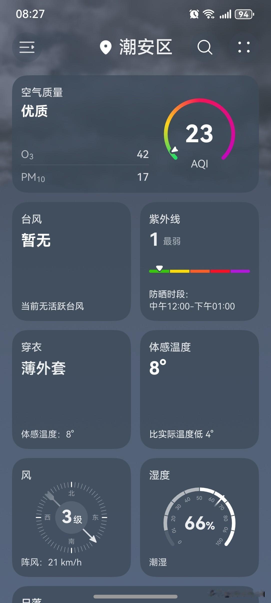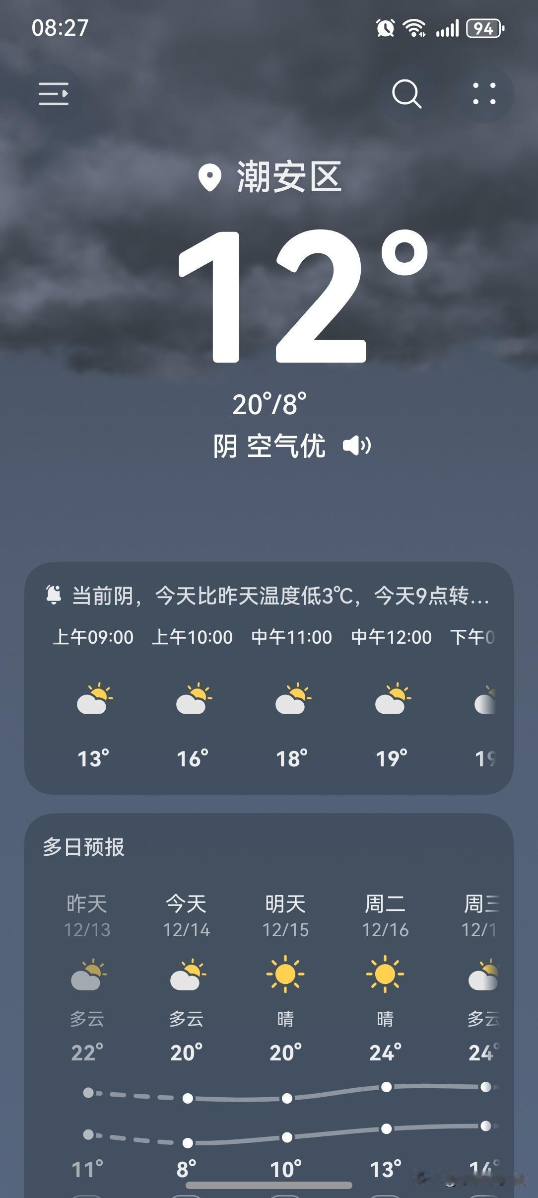冷冷冷!冷空气抵达广东!携风带雨强势登场,全省气温骤降,小伙伴们需要注意添衣保暖! 今天(14日),广东降雨减弱,气温仍然有点低。不过,还不是过程最低气温。 需要注意的是最低气温将出现在14日或15日早晨:粤北和珠三角北部市县3~7℃,部分市县有5℃以下的低温天气,高海拔山区0℃左右,局部有霜(冰)冻,南部市县12~15℃,其余市县8~11℃;15日白天气温逐步回升。 今天(14日),潮州喜提一个阴天,气温8~20℃,此刻气温12℃,体感温度8℃。 今天早上是真的好冷啊!现在虽说气温有12℃,但是体感温度仅剩8℃,还是蛮冷的。 看看今天的天空,云量虽然有点多,但阳光薄弱的地方,依然可见阳光。有了阳光,感觉才没有那么冷。 今天的天气,除了早上有点冷,风有点大,其它的还好吧!给五星好评是不能够的,给个好评吧! 如此天气!元芳,你怎么看? [捂脸][我想静静][笑哭][捂脸][我想静静][笑哭][捂脸][我想静静]