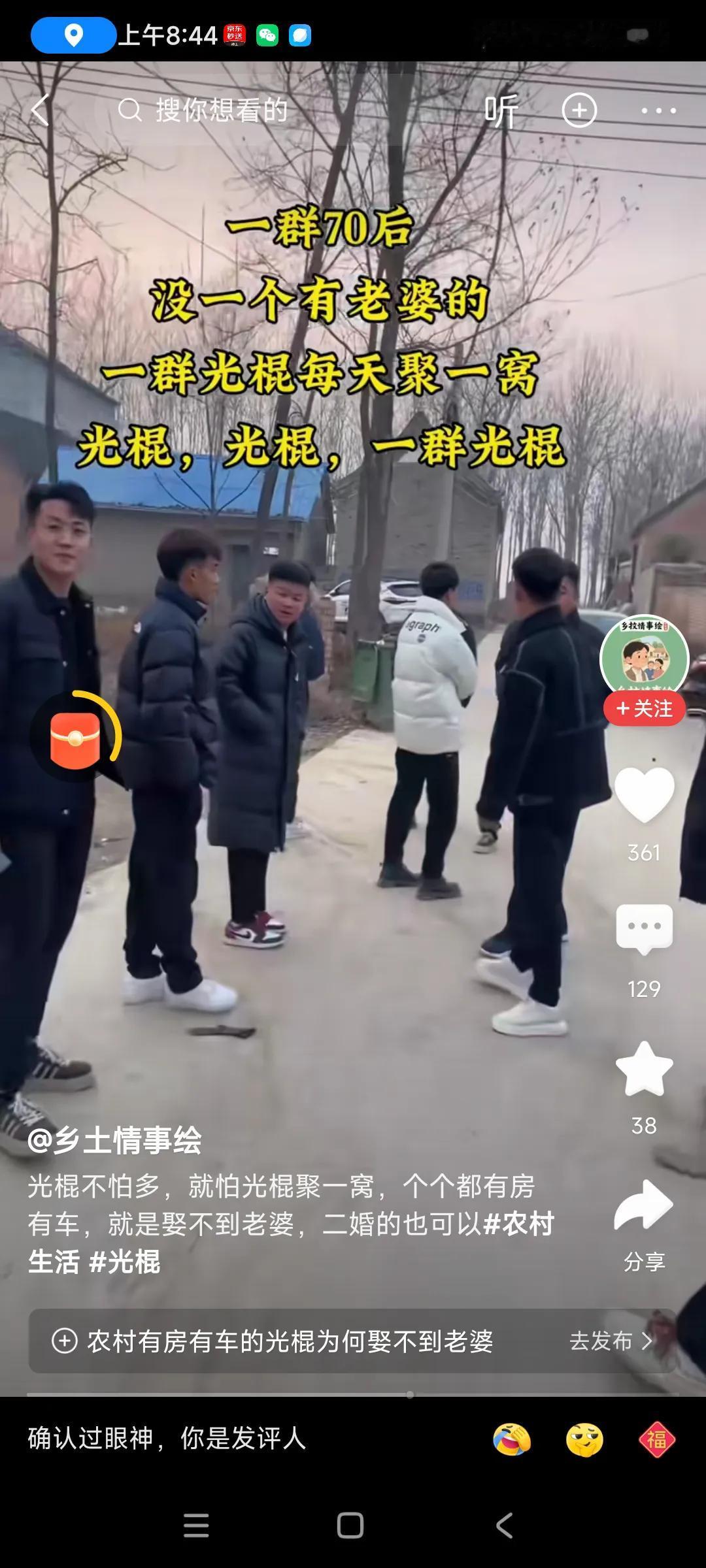 村里光棍十几个,找不到老婆啊,连二婚带孩子的要求也不低,至少一年挣个十几万,有车有房,才会与你见面,[捂脸][捂脸] 我建议这些光棍,国内找老婆难度大,不如去南方打工啊,工厂内女生多,特别是电子厂,百分之八十是女孩子,机会多,,