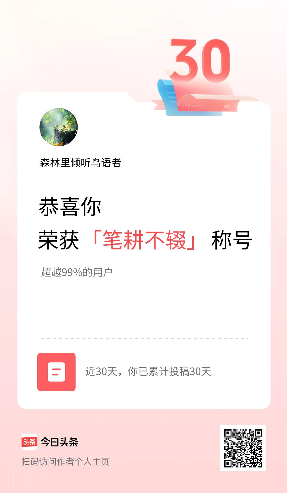 我在头条30天内投稿打卡30天,获得“笔耕不辍”称号