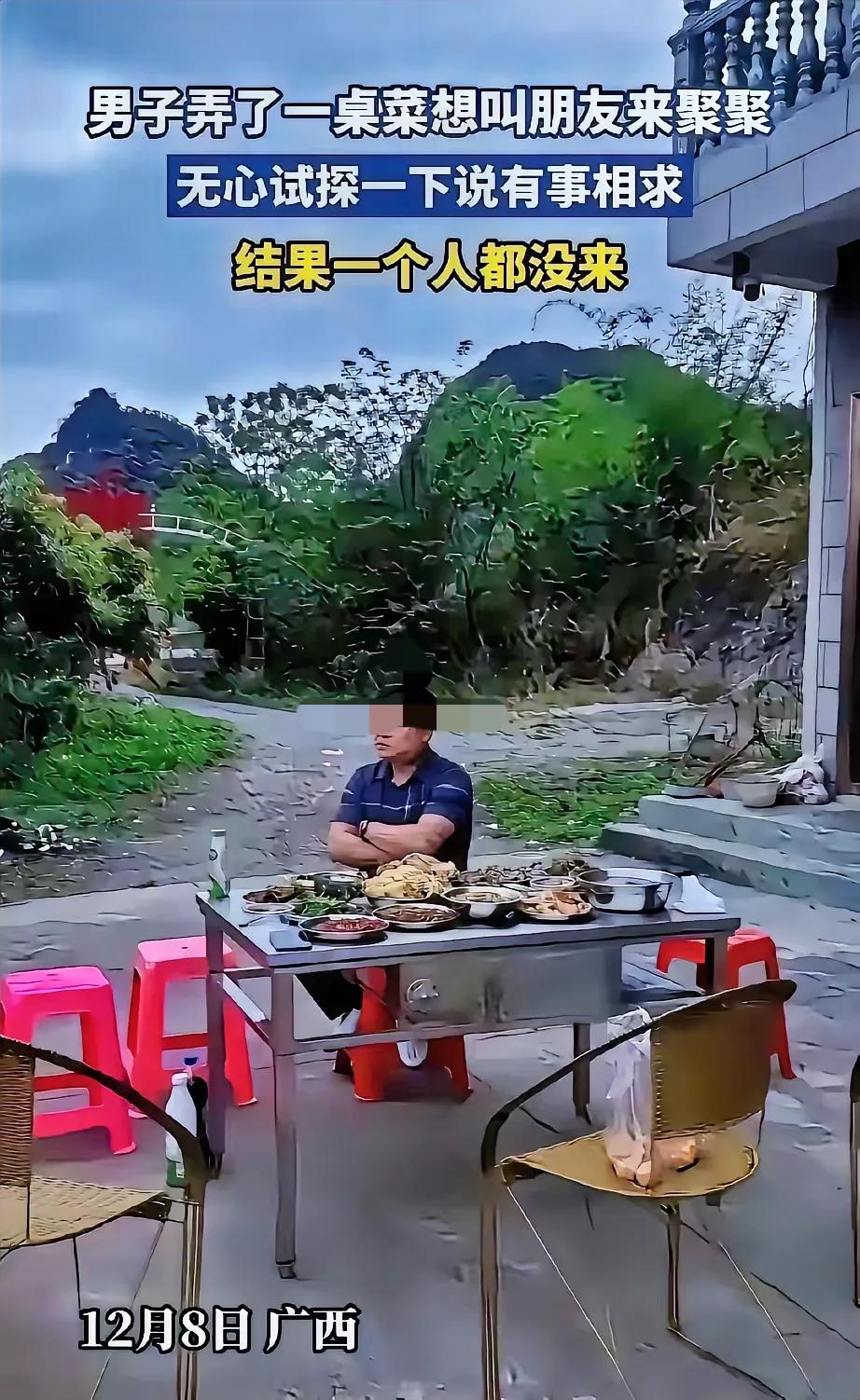 广西一男子难得回来,就弄了一大桌酒菜想叫朋友来聚一聚,无心试探一下说有事相求。结果等了一天,一个人都没来。 这位广西大哥坐在自家院子里的餐桌旁,面前的菜盘里,油焖大虾还泛着亮油油的光泽,炒花甲的汤汁都没凉透,炖得软烂的土鸡在砂锅里飘着香气,可满桌的菜愣是没等来一个碰筷子的人。他胳膊抱在胸前,望着院外那条熟悉的乡间小路,从晌午等到日落,手机安安静静的,连条回复的消息都没有。 大哥说就是随口提了句“有点事想跟大伙唠唠”,压根没真打算求谁帮忙,就是想看看平日里称兄道弟的这帮人,到底有多上心。结果倒好,这句话像块石头扔进了深潭,连个水花也没溅起来。有人说他这是“自讨没趣”,可我倒觉得,这哪是试探,分明是照妖镜,把成年人之间的人情冷暖照得明明白白。 平日里喝酒撸串时,兄弟们拍着胸脯喊“有事尽管说”,酒杯碰得叮当响,话说得比蜜甜。可真到了听见“有事相求”四个字,一个个就跟约好了似的集体消失。是真的忙吗?未必。不过是怕沾上麻烦,怕自己得掏力气、搭人情,甚至出钱财。这种“酒肉朋友”的交情,就像海边的泡沫,看着热闹,风一吹就散了。 在农村也好,在城里也罢,成年人的社交早就掺了太多现实的考量。大家都愿意凑在一块儿分享快乐,却没几个人愿意伸手接住别人的难处。这位大哥摆的这桌菜,成了一场无声的测试,测出了友情的真假,也测出了人性里的趋利避害。其实他心里未必多难过,更多的应该是释然,总算看清了身边人到底谁是真心,谁只是逢场作戏。 一桌热菜凉了,可人心的温度,比菜凉得更快。真正的朋友,从不会因为你可能有求于他就躲着走,反而会主动问一句“啥事需要帮忙”。那些只愿共享繁华、不愿共担风雨的关系,丢了也不可惜。 各位读者你们怎么看?欢迎在评论区讨论。