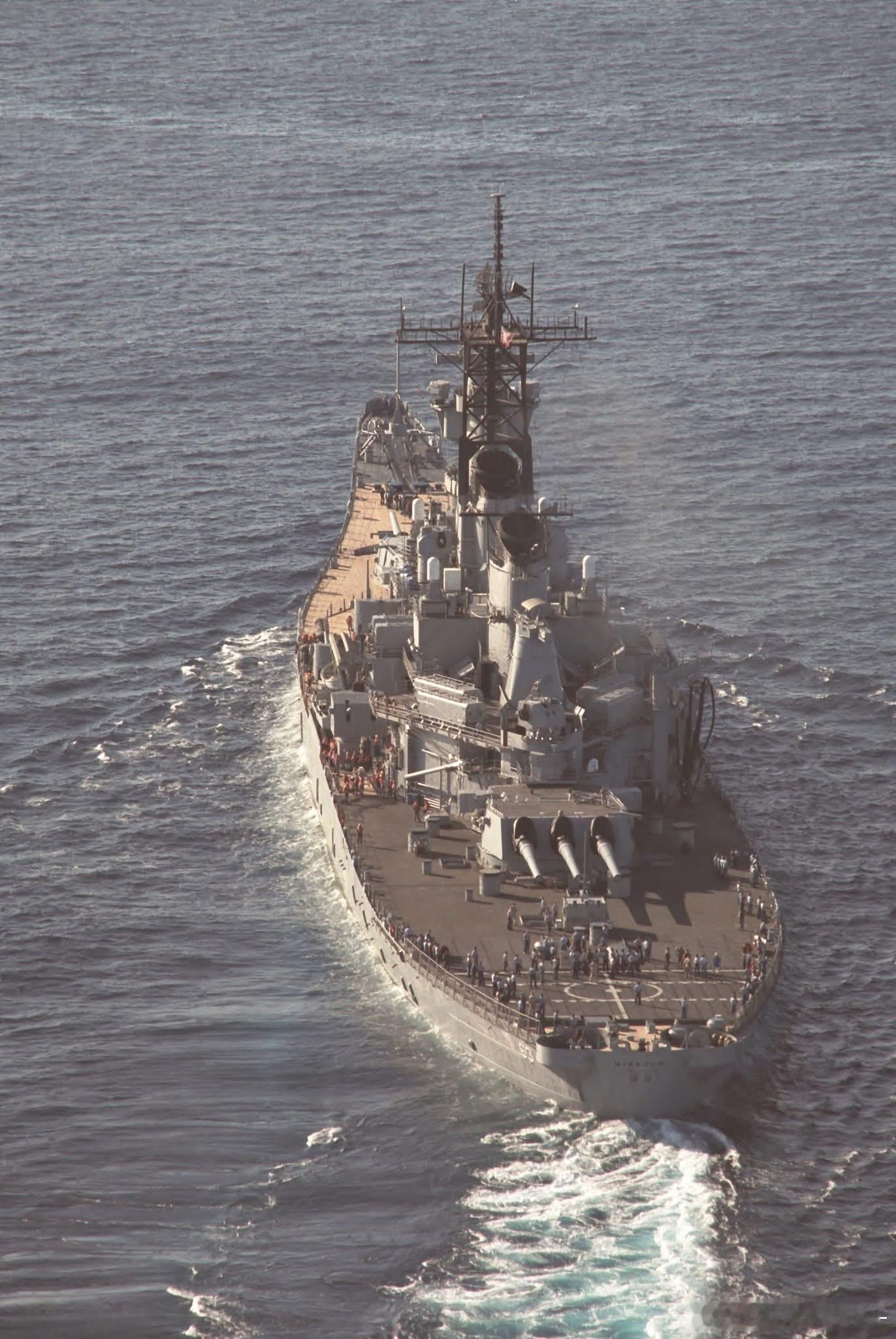 1986年7月时的密苏里号战列舰,可见鸭滑的曲线体型以及加装的战斧巡航导弹发射箱。能携带核弹头的战斧加装到四艘鸭滑上后显著增加的苏联人的盯防难度和工作量兵器影像外军影像中外舰闻