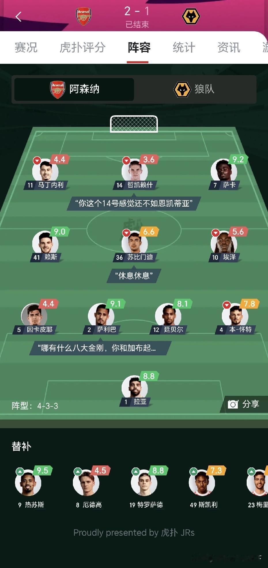 阿森纳又原形毕露了?主场踢狼队居然这么狼狈,最后靠两乌龙赢了,一个还是越位获利的角球。我就问就这样的状态,圣诞魔鬼赛程能踢得过谁? 不得不说这场枪手踢得真的烂,没有任何借口,前两场还能找找伤病赛程啥的原因,今天这完全就是自己没状态,狼队这么差的表现,看一场看不出有啥优点的队,能踢成这样。也不用给谁开会,全队踢得都不兴奋,浑浑噩噩的。 最近这几场的表现,已经完全是传说中的掉链子状态了,但是运气还行,刚好碰到两真弱队,还赶上世界波对手乌龙啥的。接下来有一周休整时间,要是能找回状态还则罢了,要是不能就等着崩盘吧。