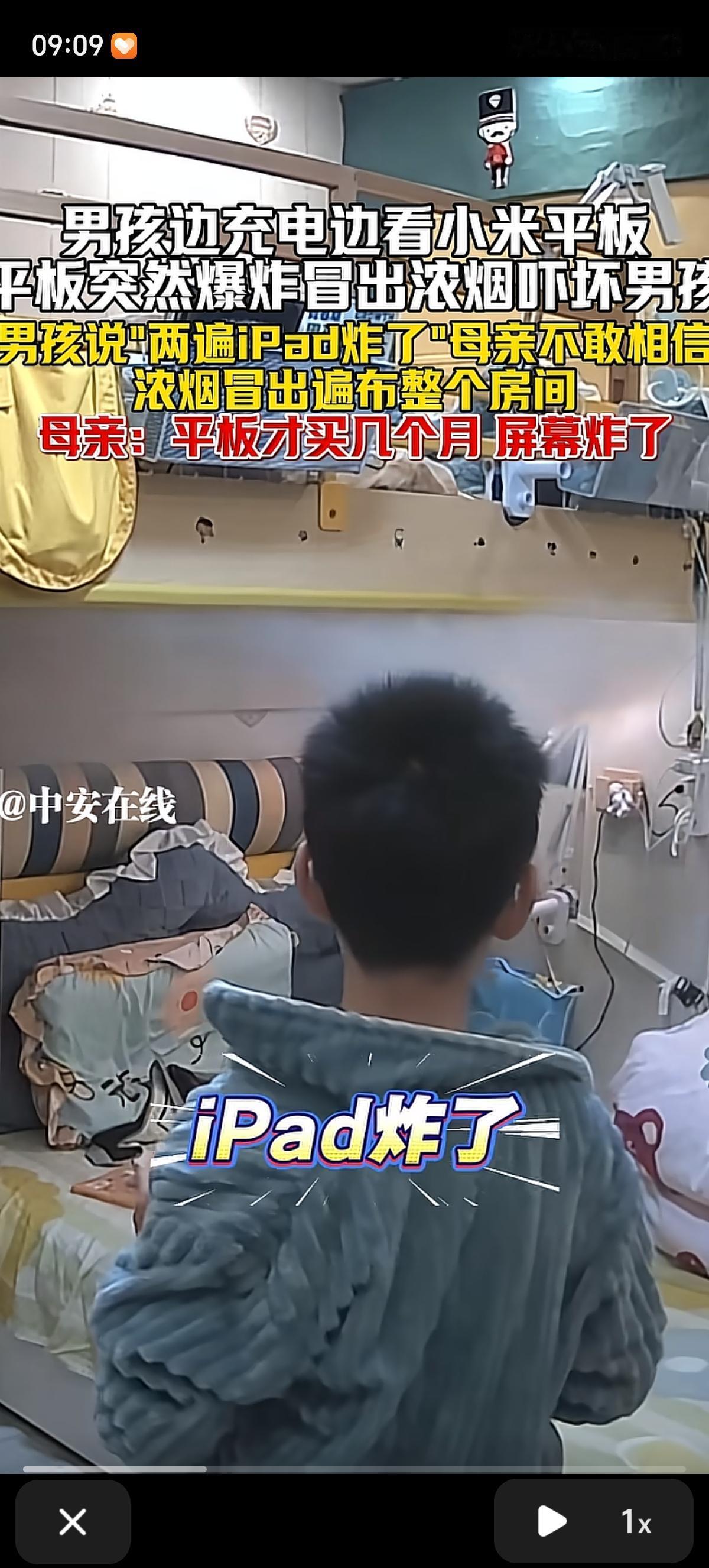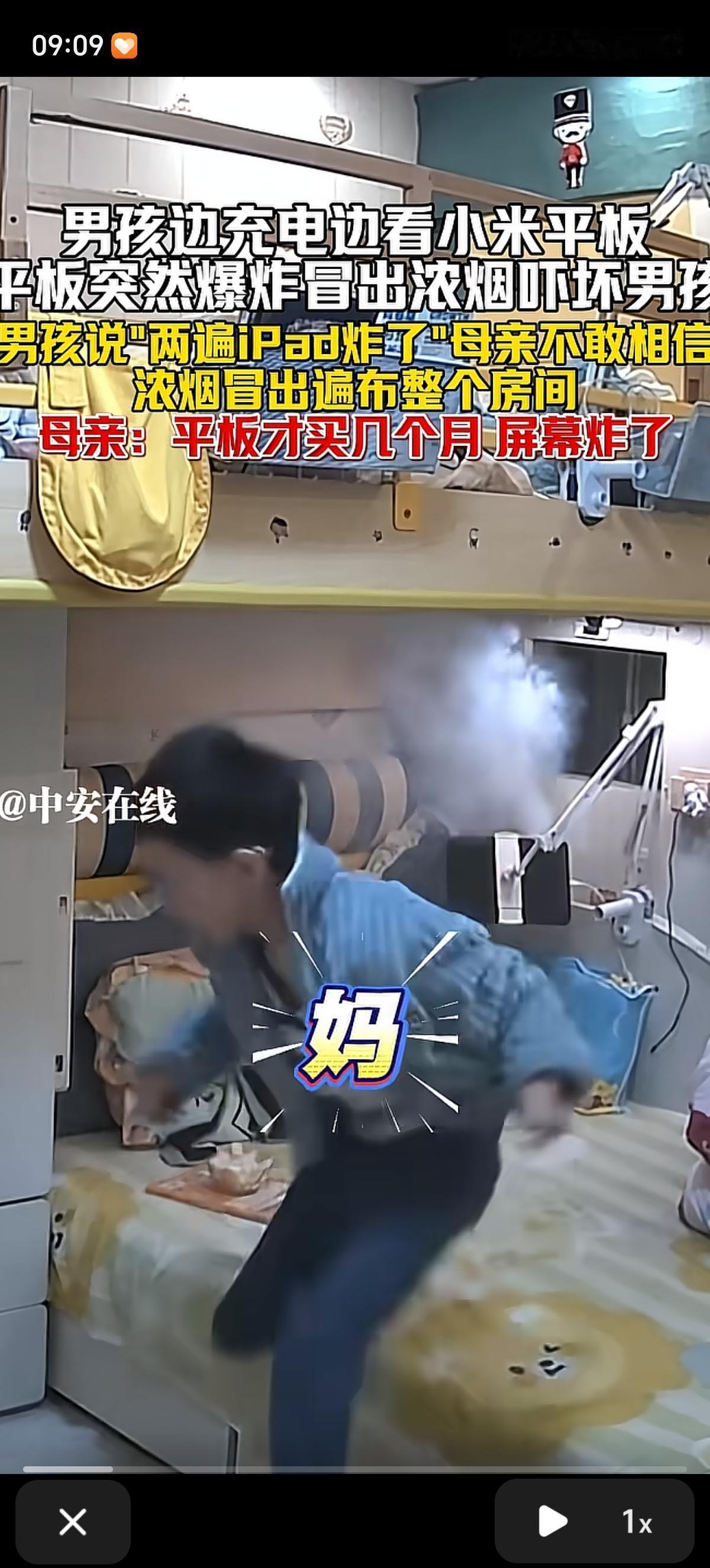北京的一个男孩坐在自己床上边充电边玩小米平板,平板突然就冒烟了,男孩还没反应过来,烟更多了,一激灵,赶紧逃跑,喊妈。 男孩看到妈妈过来查看,赶紧告诉妈妈“iPad炸了”。孩子妈妈表示平板才买了几个月,还在使用的初期呢,屏幕就被炸坏了。 幸好损失的是平板,男孩家里被烟熏一下,没人受伤,后续平板问题是自认倒霉还是厂家赔偿就不得而知了。
