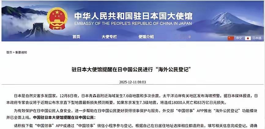 中国开始清点在日华人数量,日本一下子慌了。 12月11日,中国驻日本大使馆发了个通知,让所有在日本的中国公民,都通过“中国领事”APP或者小程序,完成“海外公民登记”。同时还特意提醒,近期尽量别往日本去。本来这就是个很常规的领事保护动作,结果日本那边却反应特别大,不少媒体跟着炒作,政府层面也显得很紧张,甚至有人说日本已经紧急找美国帮忙了。 这份通知的背后,其实是日本近期居高不下的灾害风险。12月8日夜,青森县附近海域突发7.6级地震,太平洋沿岸接连发布海啸预警,余震更是一波接着一波。日本政府自己都预测,要是东京发生7.3级地震,会有上万人遇难,经济损失高达成百上千亿日元。 使馆的登记通知,说白了就是给在日华人上一道安全保险。登记信息里包含居住地址、联系方式这些关键内容,真要是遇上地震海啸,使馆能第一时间推送避难指引,还能精准定位需要帮助的公民,提供领事保护。而且通知里特意强调,登记信息会严格保密,不会索要银行账户这类敏感内容,就是怕大家遇上诈骗。 可日本方面的反应,实在有些反常。不少日本媒体捕风捉影,把正常的公民登记说成是“别有用心”,一些政客也跟着煽风点火,甚至紧急联系美国,摆出一副如临大敌的样子。这种过度解读,让不少在日华人觉得哭笑不得。 明眼人都看得出来,中国使馆的做法,完全是从公民安全角度出发的常规操作。日本与其在那边胡乱猜测、制造紧张气氛,不如把精力放在做好灾害预警和应对工作上。毕竟,保障在日人员的生命安全,才是当下最该做的事。 还有不少网友调侃,日本这是典型的“心里有鬼”。一个简单的领事服务动作,被他们解读出这么多门道,实在是没必要。反观在日华人,大多都很配合登记工作,大家心里都清楚,祖国的这份提醒,是实实在在的关怀。 各位读者你们怎么看?欢迎在评论区讨论。