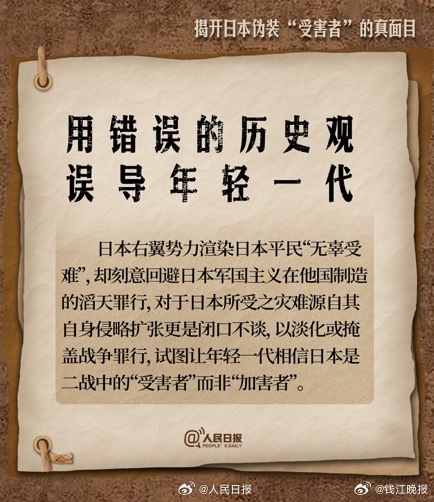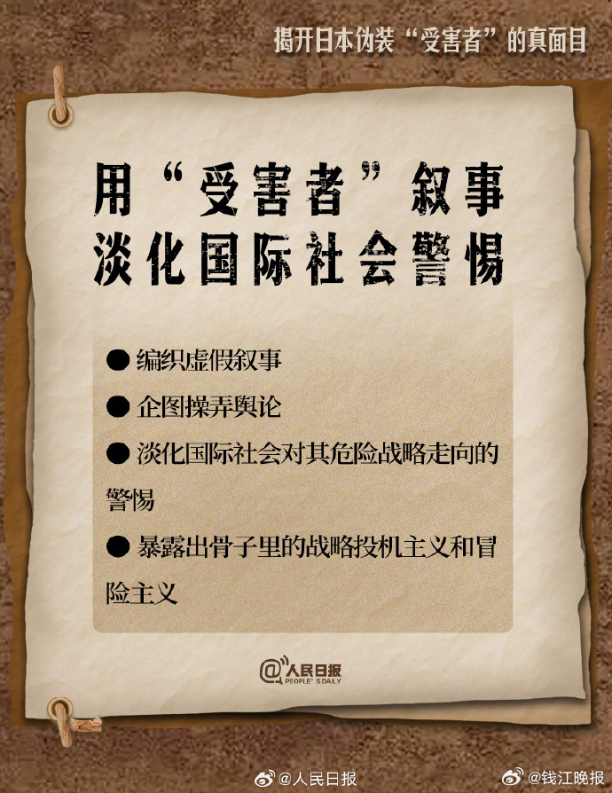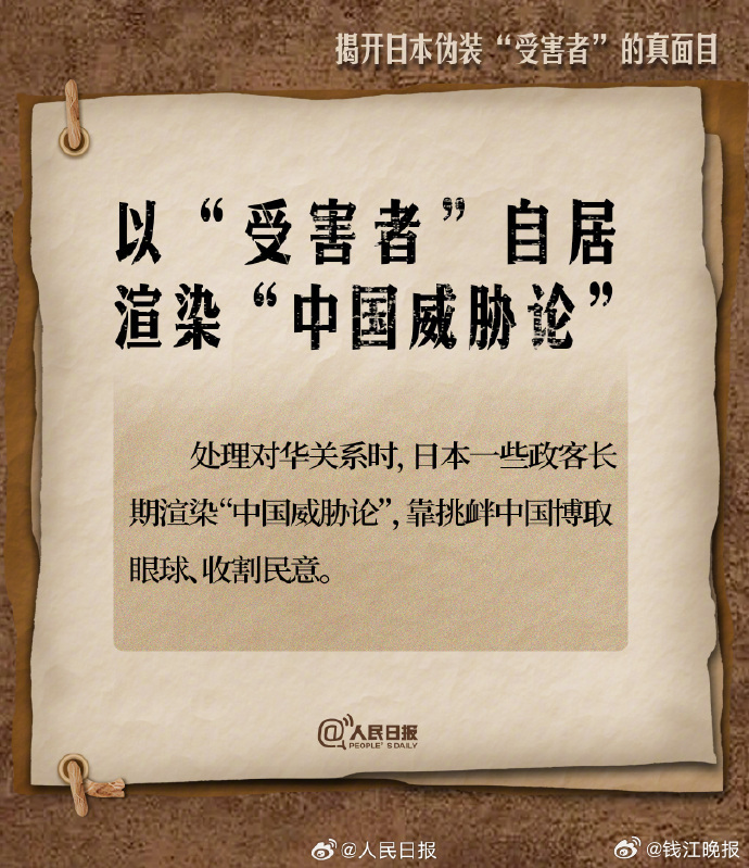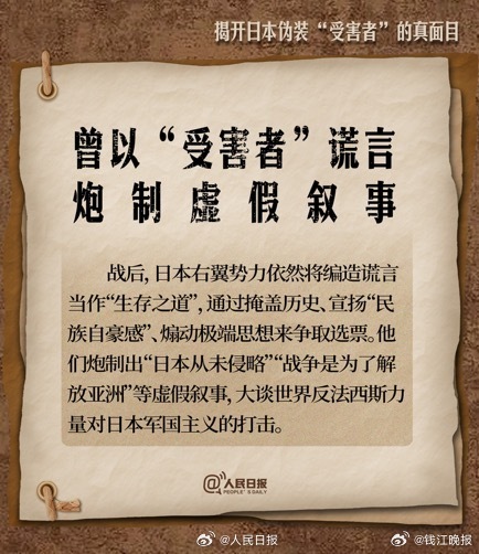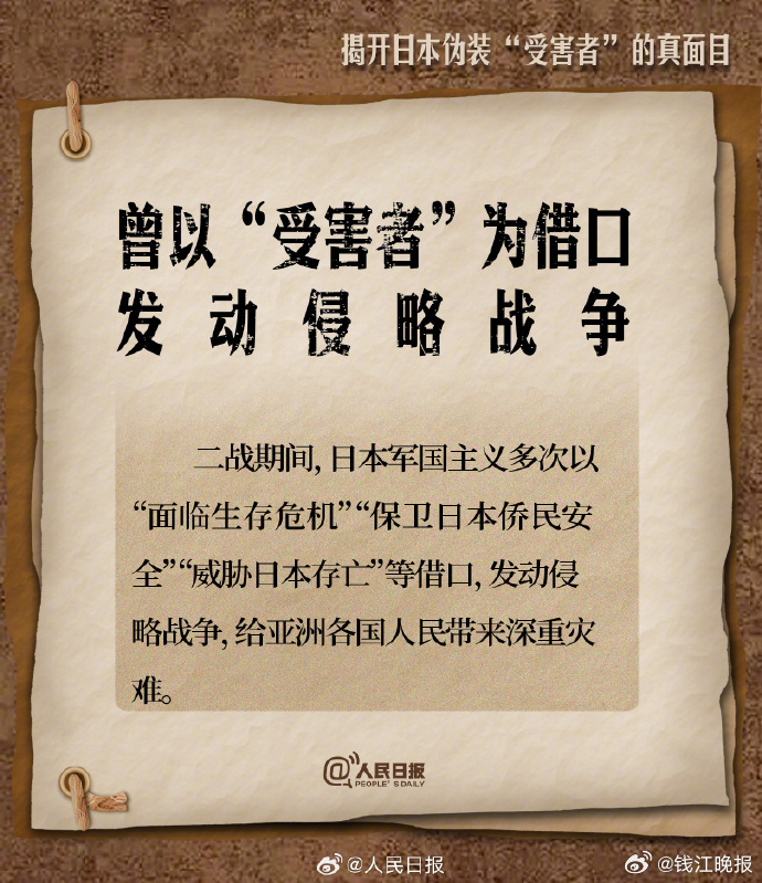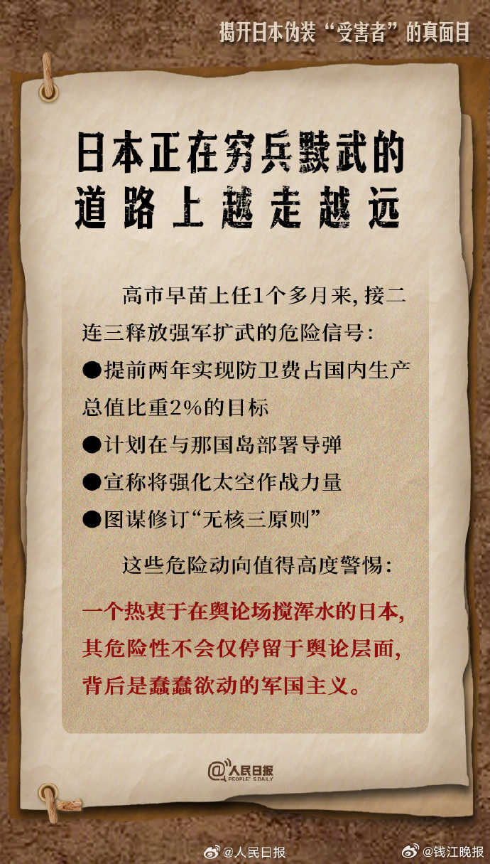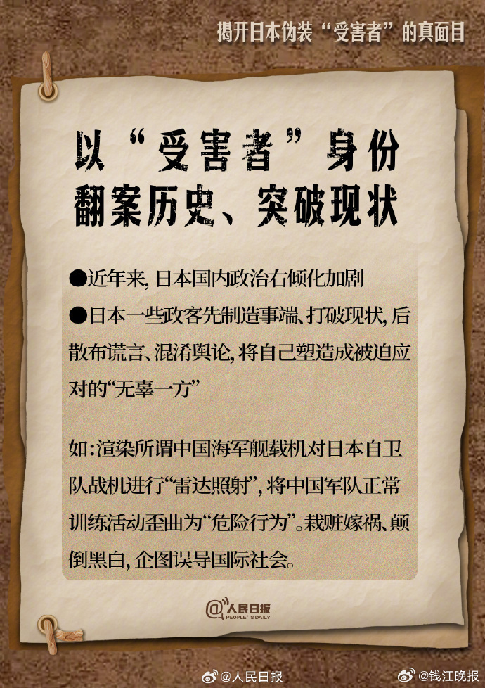 【警惕!#揭开日本伪装受害者的真面目#】以“受害者”为借口发动侵略战争、用“受害者”谎言炮制虚假叙事、以“受害者”身份翻案历史突破现状…日本正在穷兵黩武道路上越走越远,这些危险动向值得高度警惕:一个热衷于在舆论场搅浑水的日本,其危险性不会仅停留于舆论层面,背后是蠢蠢欲动的军国主义。#日本开始军事介入南海# (人民日报)