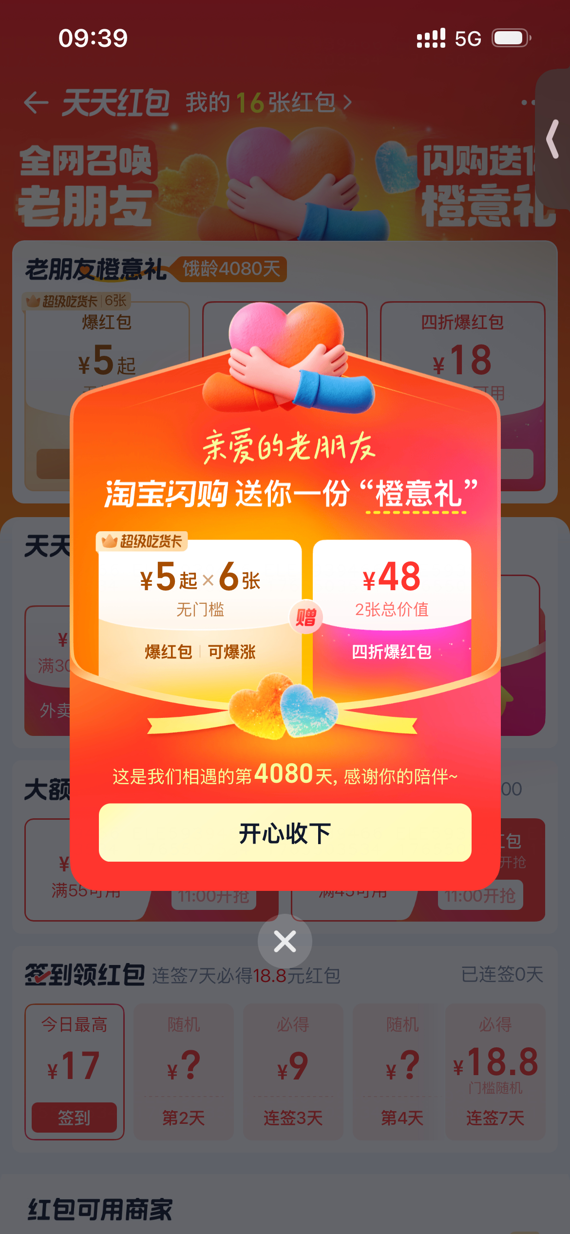李现喊你上淘宝闪购领老朋友福利 这大概就是“时间看得见”的福利吧!老用户们,是时候检验真情时刻了,淘宝闪购全网寻老友!12.12-12.18来淘宝闪购搜【老朋友】,注册时间越久,红包金额越大!至高可领7张免单卡~我的饿龄4080天!快来看看你的饿龄有几天~ 淘宝闪购超级周末 淘宝闪购全网寻老友