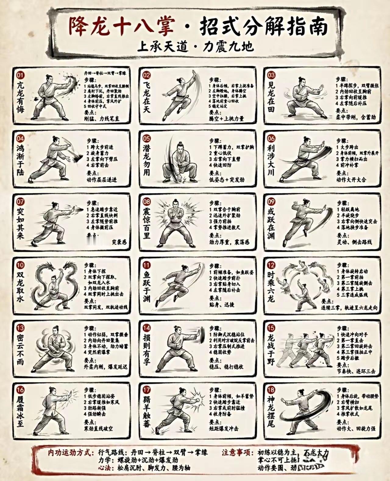 降龙十八掌,招招威力惊人。 “亢龙有悔”,左腿微曲,右臂内弯,双掌划圆推出,像巨龙昂首,发力时气沉丹田贯双足,力出七分留余劲。“飞龙在天”跃起半空,双掌自上而下轰击,与“亢龙有悔”配合,有冲天之势。“见龙在田”震脚下蹲蓄力,刚柔相济。“鸿渐于陆”双掌交替进退,似鸿雁着陆,步步为营。“潜龙勿用”身形速退,气沉丹田,以静制动。“突如其来”近身时突发迅猛掌力制敌。“利涉大川”双掌一明一暗,攻防兼备。“震惊百里”弓步转换,双掌猛击,气势如雷霆。每一招都有其独特的招式和心法,学会了仿佛能称霸武林!祝你早日成才!少林降龙十八掌