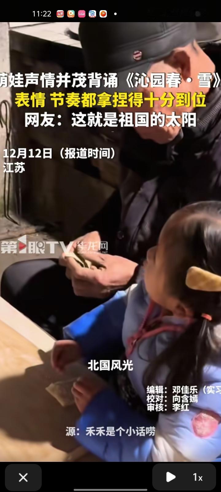 12月9日,宿迁市沭阳县。22年女童声情并茂朗诵《沁园春·雪》,表情、节奏都拿捏的十分到位,网友夸她:这就是祖国的太阳。 孩子妈妈张女士称,当时是外公外婆在包饺子,孩子说“我新学了一首诗想背给外公外婆听”,背的时候她学着大人背诗的样子,把气势和情感带在里面,加上这首诗带有磅礴大气的感觉,孩子模仿起来特别有意思。