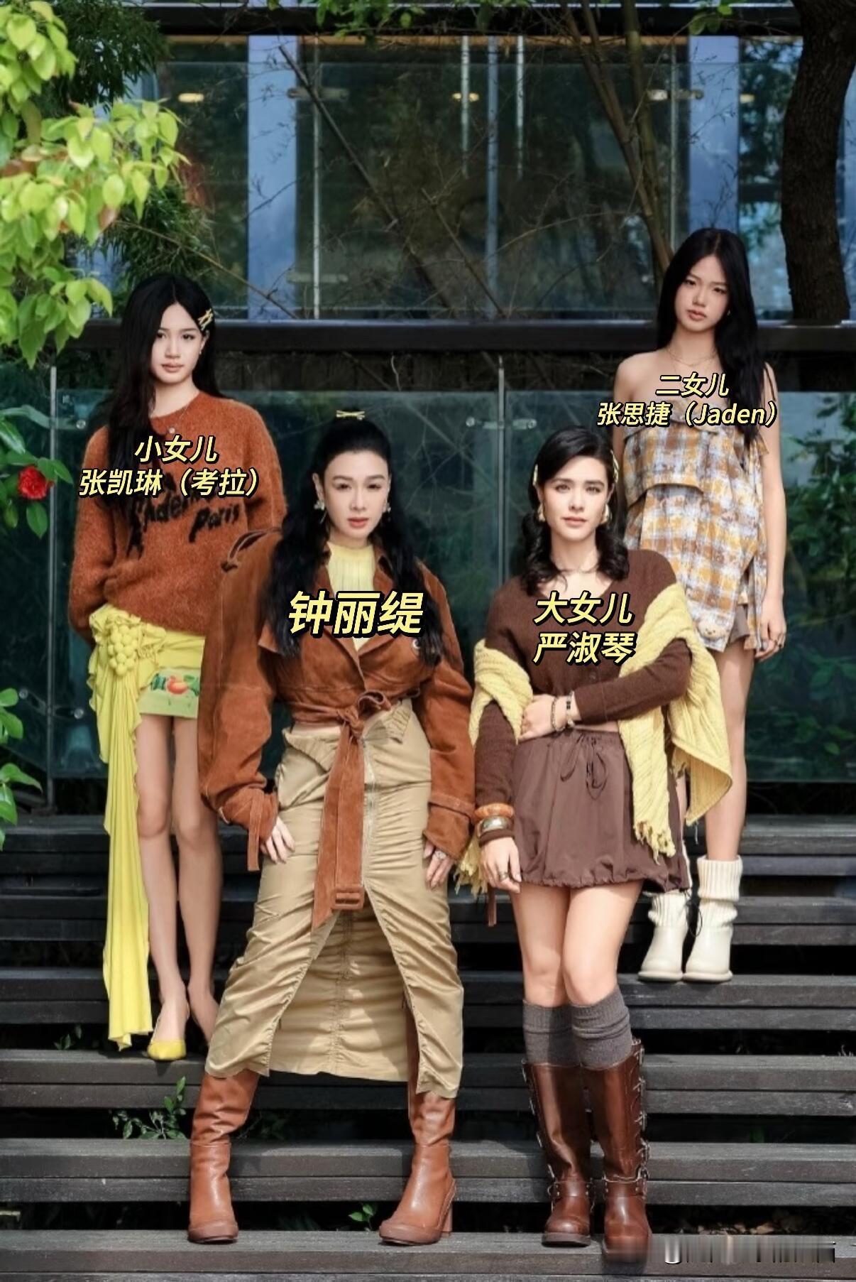 钟丽缇这个50多岁的妈妈平时颜值看着不是特别高,但她和三个女儿的合影里确实是最有气质的一个,辨识度极高,果然还是老法拉利好。 大女儿长相有点偏混血,棱角分明,不够柔美,另外领个女儿留着长发,属于小家碧玉的美,总之一家人颜值都比一般人高 。