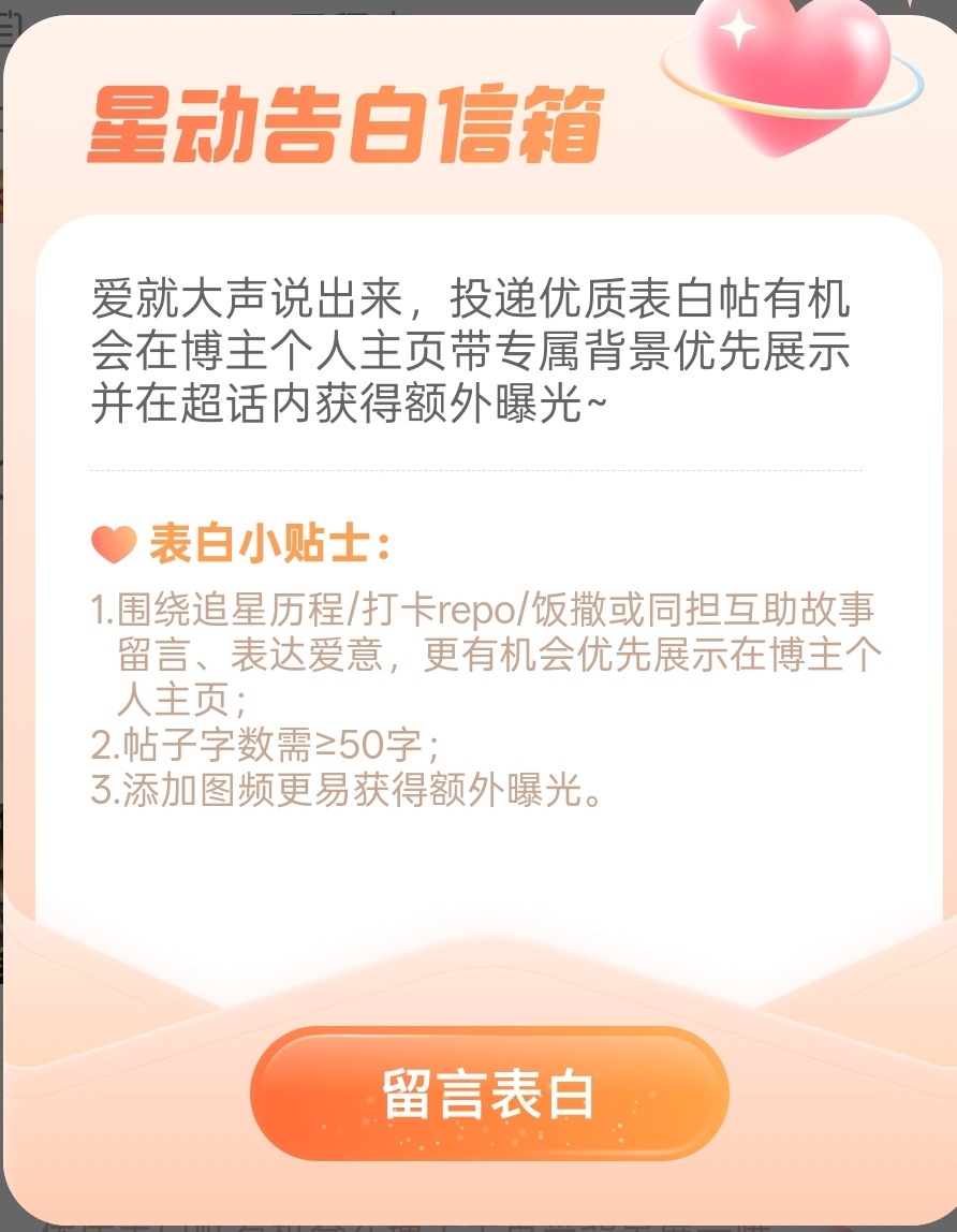 檀健次个人主页点超话,都来表白留言一共2w,目前接近5000,发多少没有限制数达标就可以了,50字以上切记。超星动告白信箱非正式跨年派对
