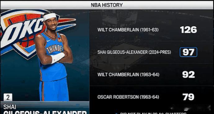 还差三场就满100了!根据NBA官方数据统计,今天雷霆对阵马刺比赛中,亚历山大已经拿到超过20分,这是他连续第97场比赛砍下20+得分排名NBA历史第二位。距离超过第一的张伯伦还差30场,按亚历山大目前状态,本赛季很有可能完成这个任务。