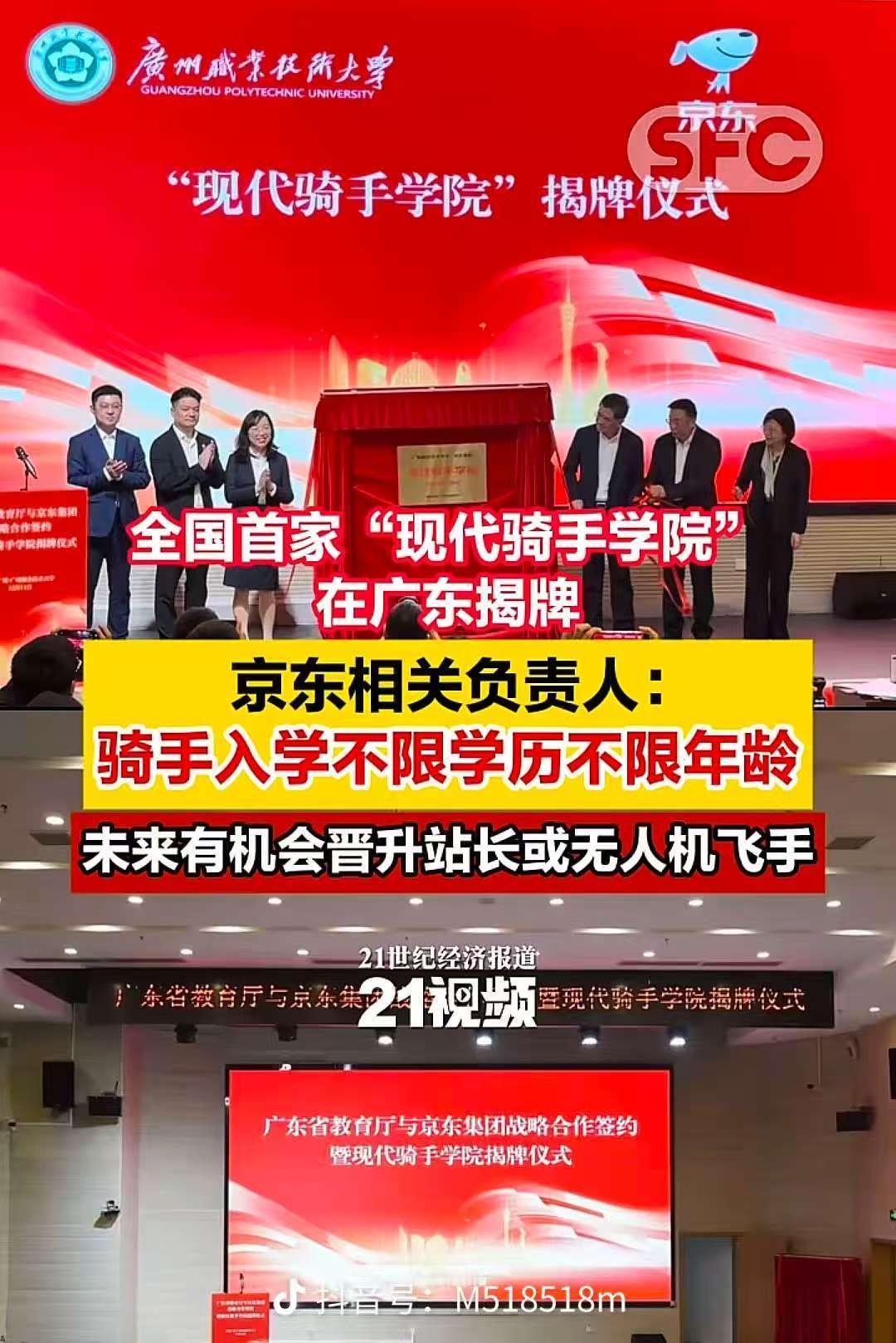全国首家现代骑手学院成立。骑手入学不限学历,不限年龄,未来有机会晋升站长或者无人