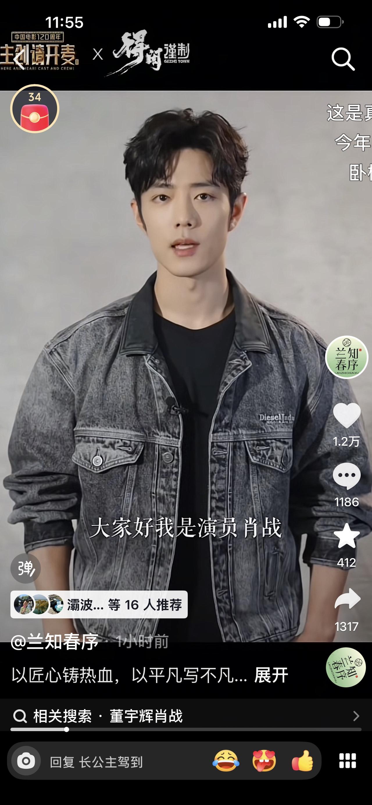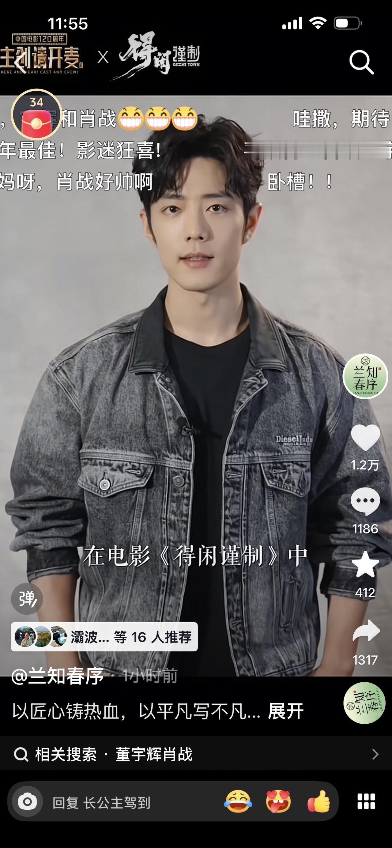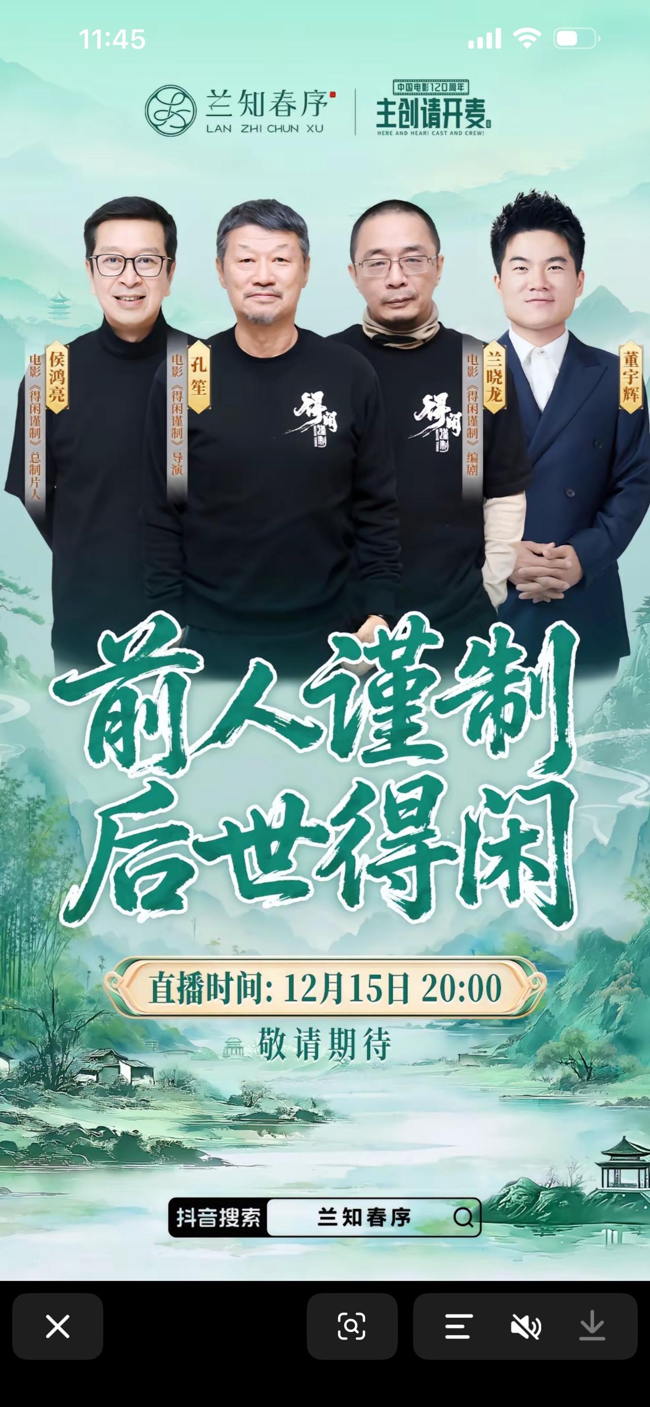 肖战主演的《得闲谨制》剧组, 12月15号晚上八点, 导演制片人编剧都要来“兰知春序”的《主创请开麦》访谈了。 肖战因为档期不能来, 虽然有点遗憾, 但是他也录制了一个视频, 宣传这部电影: “以匠心,铸热血, 以平凡,写不凡。” 虽然肖战来不了, 但是导演孔笙, 编剧兰晓龙, 总制片人侯鸿亮会来到直播间和大家见面。 这部电影我还没看过, 但是看看主演肖战和这几个大咖, 就必须是精品。 虽然我对演艺圈不熟悉, 但是孔笙导演的《闯关东》《生死线》 《战长沙》《北平无战事》《父母爱情》 《琅琊榜》《欢乐颂》 《鬼吹灯之精绝古城》…… 这些我都熟悉。 编剧兰晓龙的《士兵突击》《我的团长我的团》《长津湖》《长津湖之水门桥》都是很出名的, 《长津湖》我带着小丫头是含着热泪看完的。 制片人侯鸿亮的《伪装者》《欢乐颂2》 《知否知否应是绿肥红瘦》 《大江大河》《大江大河2》, 《都挺好》《清平乐》 《乔家的儿女》也都是爆款, 这些我到现在都记忆犹新。 这次的电影访谈太期待了。 这部电影有很多朋友看过了, 都说非常好看。 看过的朋友发了观后感: “《得闲谨制 》是一部“老祖宗希望你铭记, 但又不舍得让你太伤心难过”的抗日电影。 全片充满黑色幽默, 上一秒想哭下一秒又让你笑, 不说教不俗套不老登味, 不刻意煽情, 雅俗共赏, 允许人胆小懦弱也允许人勇敢, “胆大的上去拼, 胆小的掉头跑”, 很多人都说强烈推荐。 明天晚上八点, 兰知春序直播间不见不散。 散会! 董宇辉 兰知春序 肖战