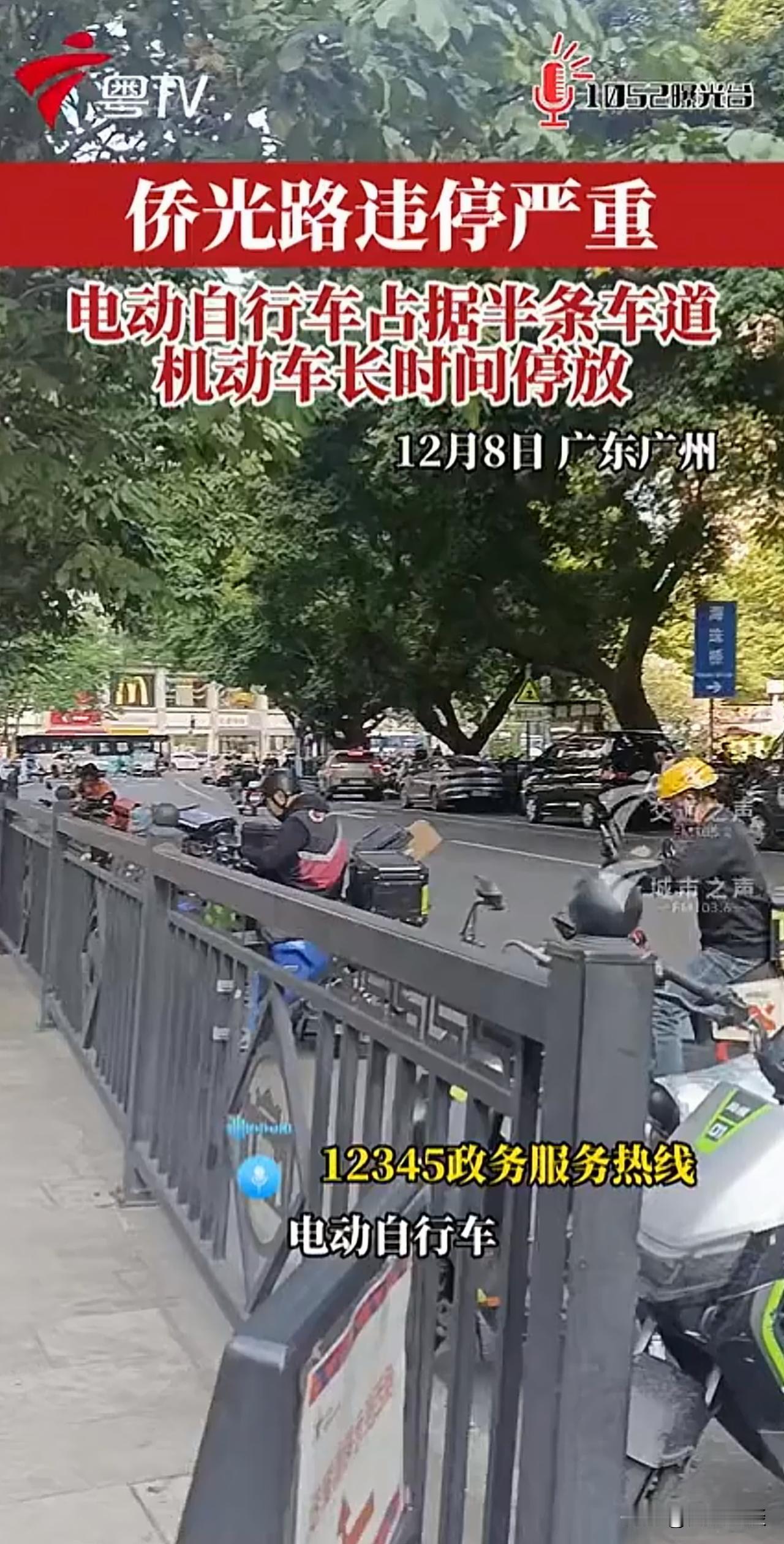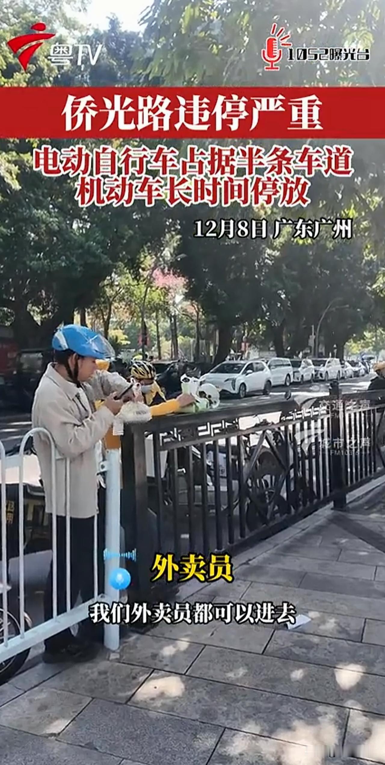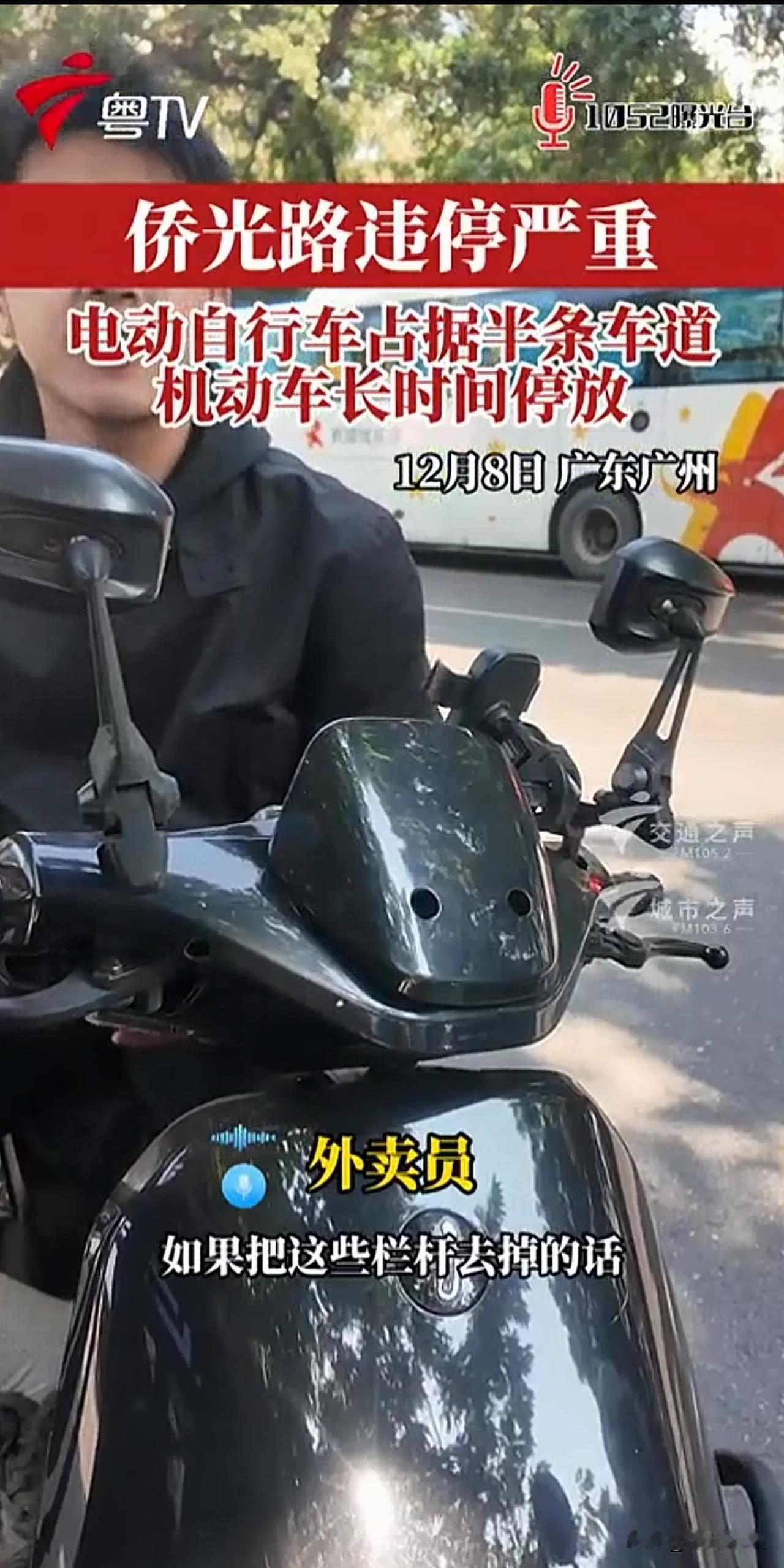 广州一核心区域重点道路违停严重,市民吐槽通行困难,机动车违停占据一条车道,电动车违停占据半条车道。 外卖骑手建议去掉机动车道与人行道之间的栏杆,减少违停,改善拥堵现象。 那么,广州人行道与马路之间的栏杆有必要存在吗? 究竟是好处多,还是坏处多呢? 广州大部分马路与人行道之间都设置了栏杆,导致非机动车只能从人行道两端上人行道停车、充电,外卖取餐等,造成人行道电动车不断。 或许拆掉栏杆,像深圳那样改造一下,可以好很多,至少可以减少人行道上的电动车,对行人来说,是好事,不用时时刻刻担心被电鸡撞到。
