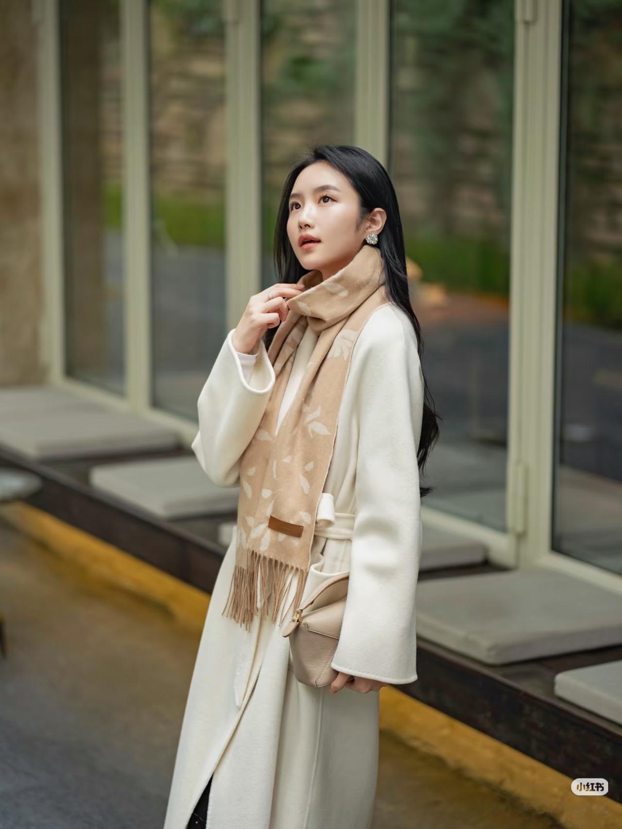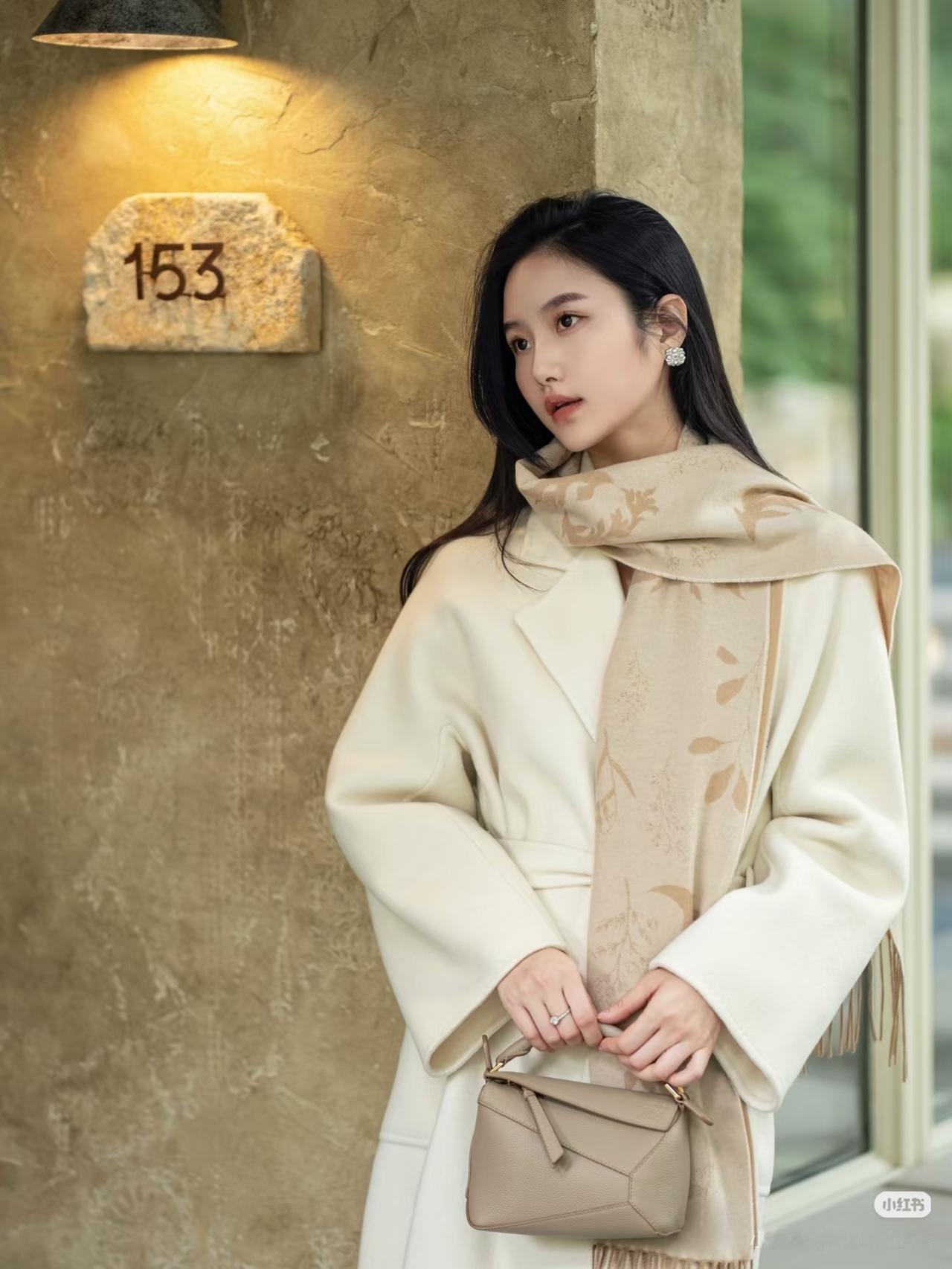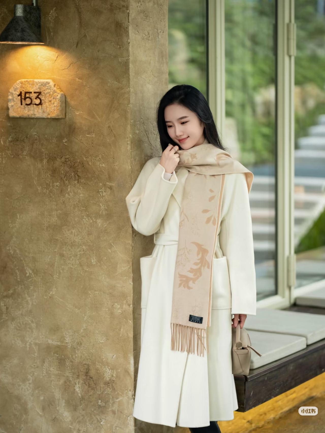 优雅的白色大衣,搭配复古的白色帽子,在古老的建筑前,尽显时尚与古典的完美融合。