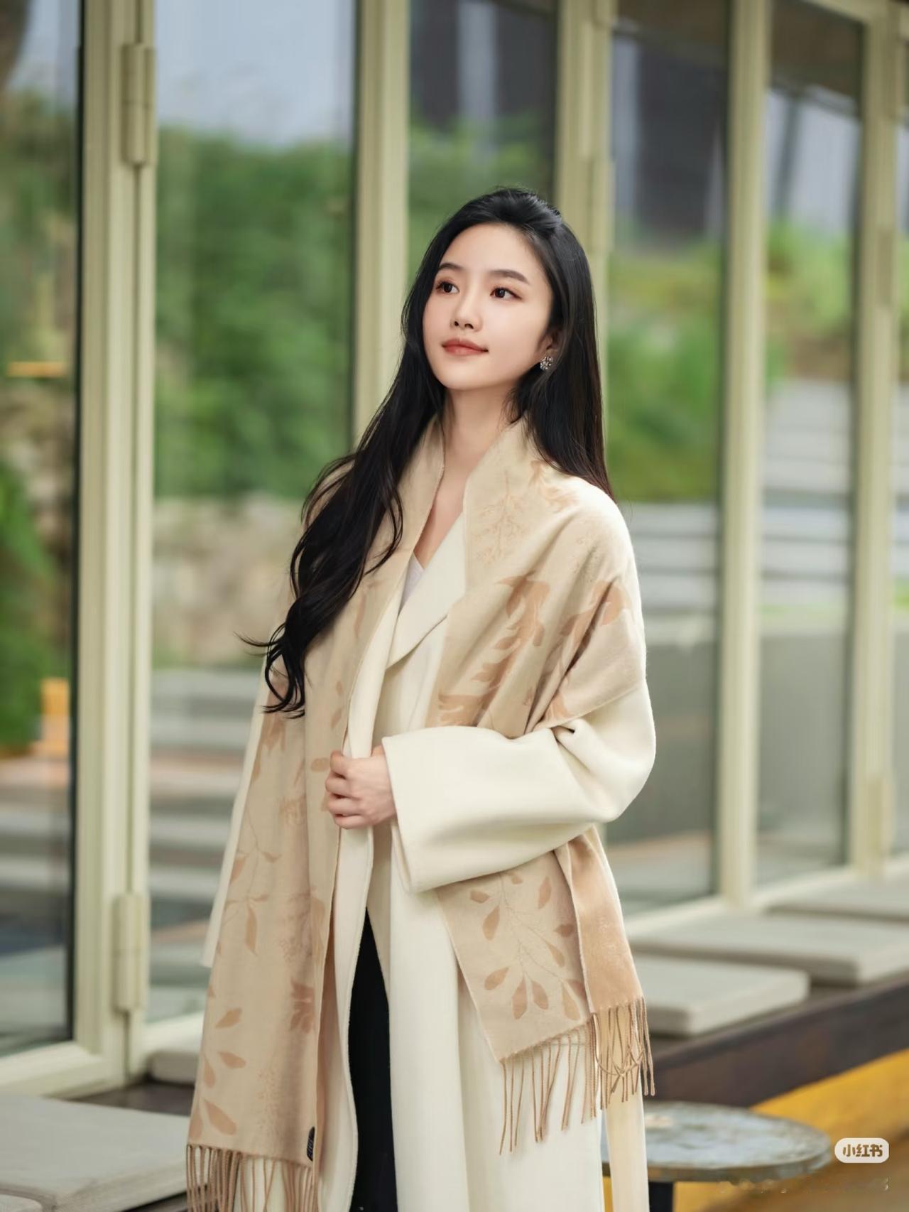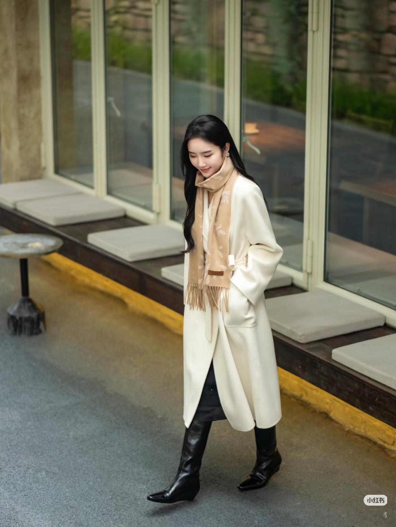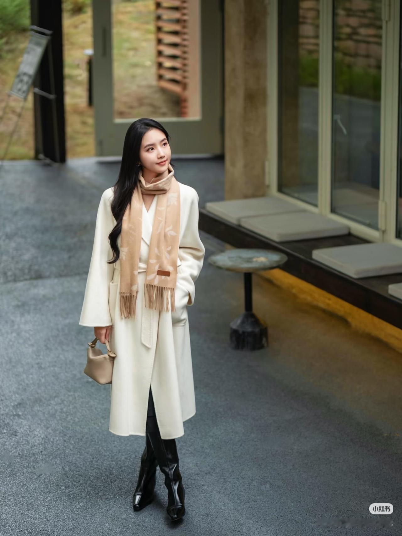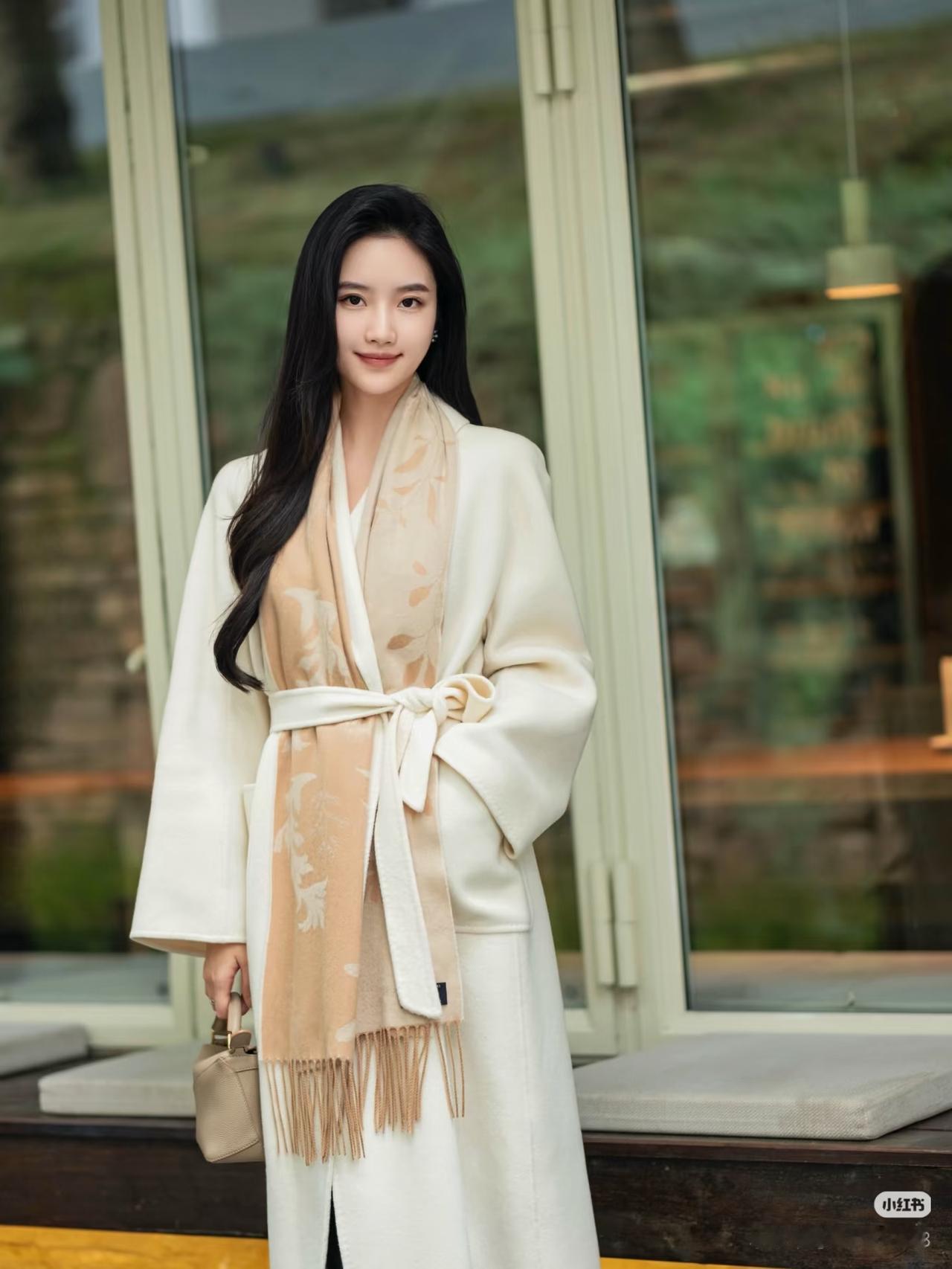 优雅的白色大衣,搭配复古的白色帽子,在古老的建筑前,尽显时尚与古典的完美融合。