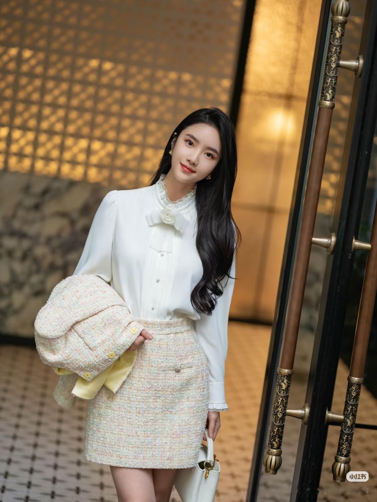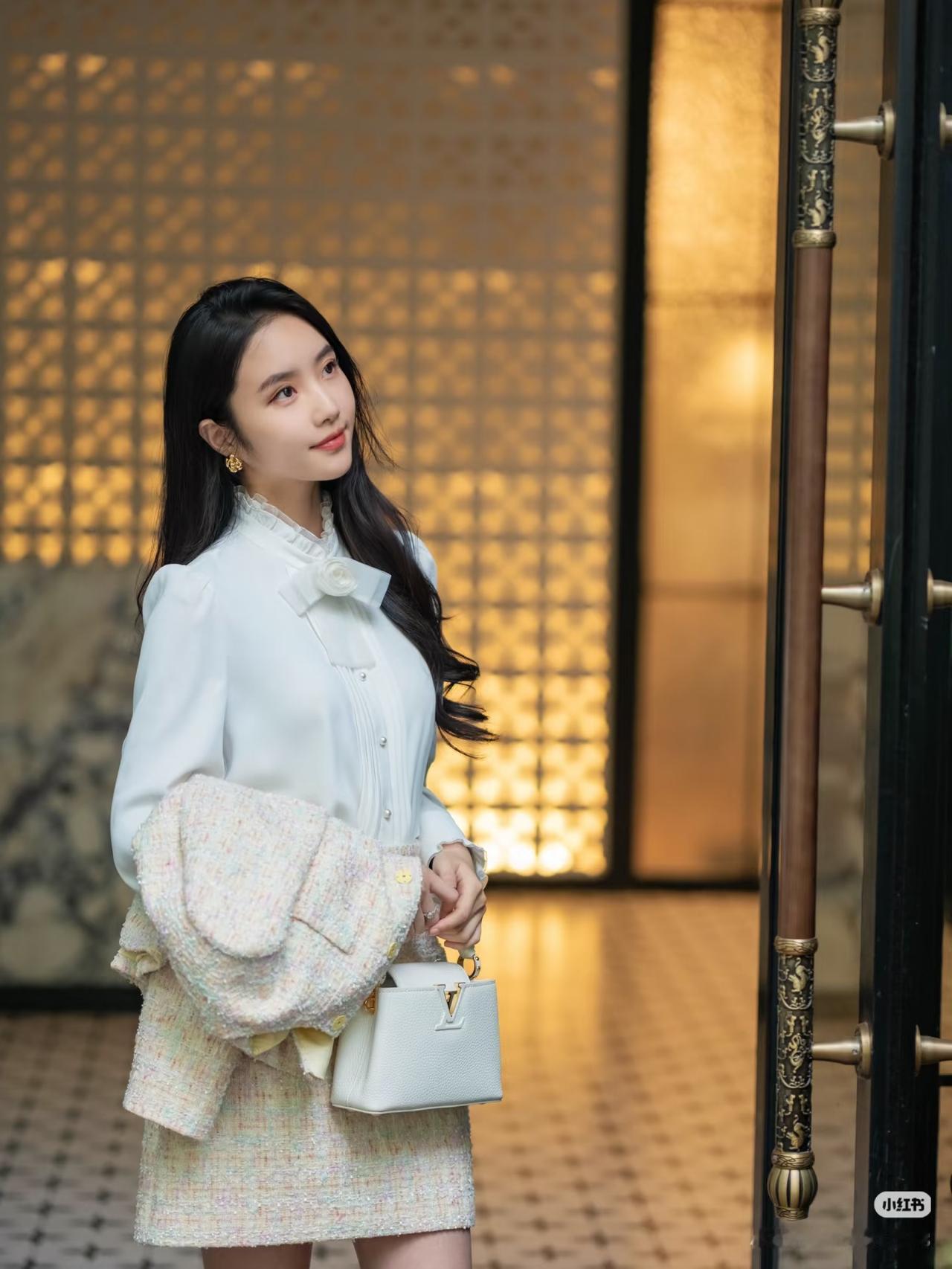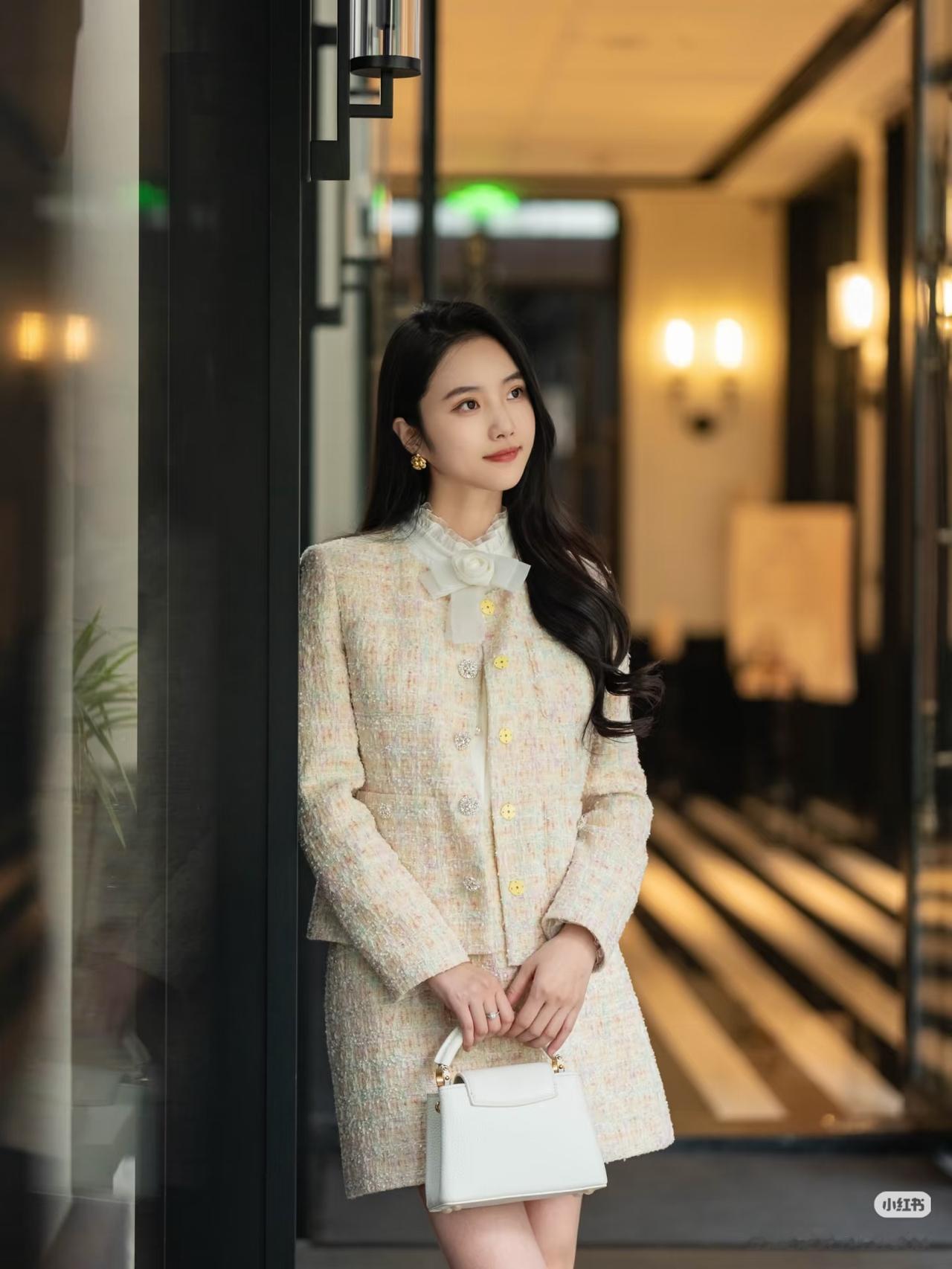 优雅的白色大衣,搭配复古的白色帽子,在古老的建筑前,尽显时尚与古典的完美融合。
