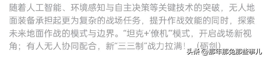 起猛了,看见坦克里突然飞出无人机…… 坦克开着开着,居然从里面放出无人机了,这可不是拍科幻片,老的三三制战术现在结合了无人装备,坦克搭配无人机当“眼睛”,无人战车还能冲在前头探路、诱敌,乘员甚至不用待在坦克里,下车遥控就能打仗。 现在无人战车靠油电混合能跑200多公里,无人机还能把操控距离拉到25公里外,这些技术一落地,地面打仗的方式真的变成了智能化的战场。 【新“三三制”战术】编队包含VU-T10无人坦克、新型VT4主战坦克、VN20步战车,分别承担侦察诱敌、攻坚核心、支援清扫的角色。