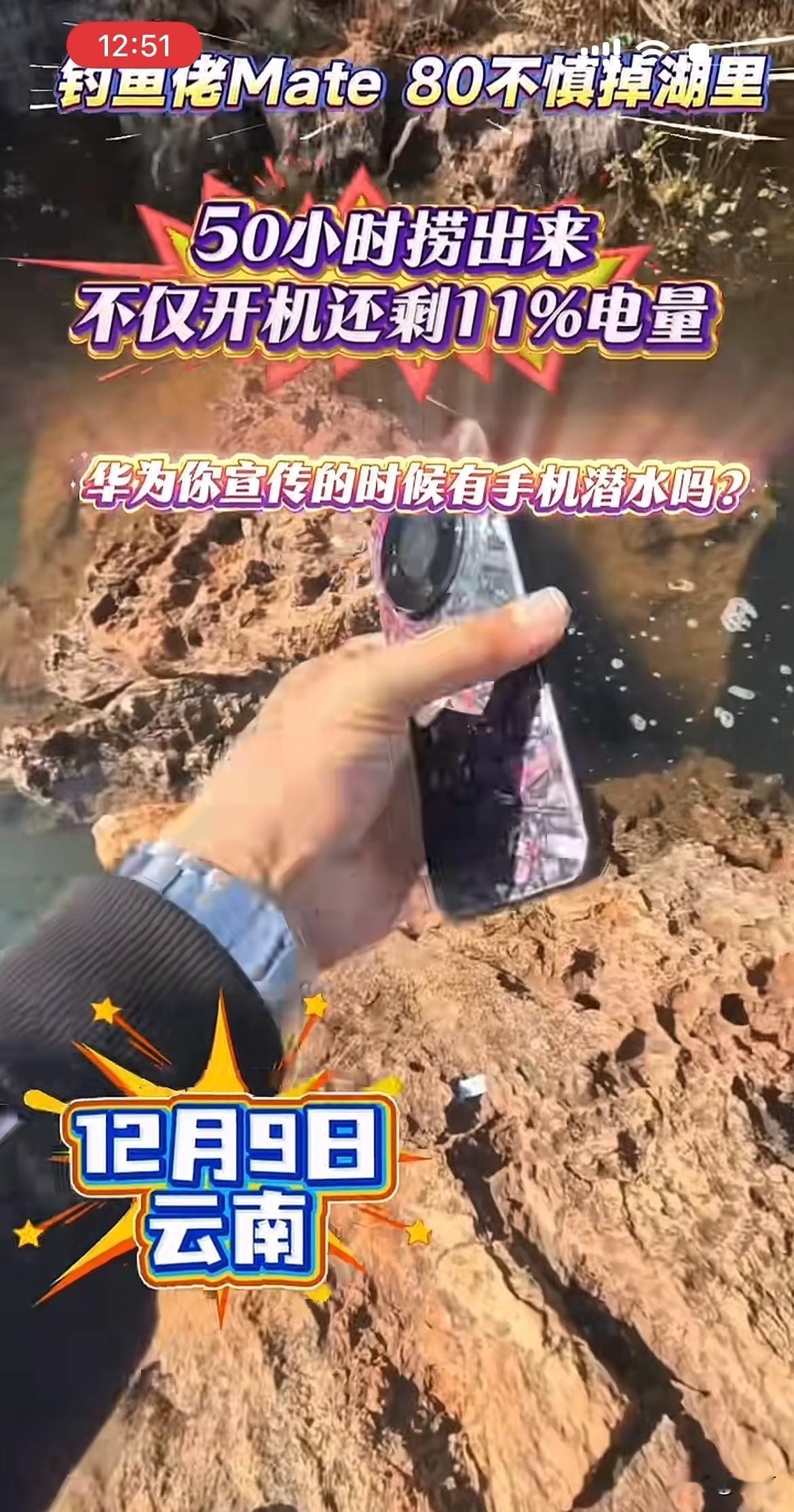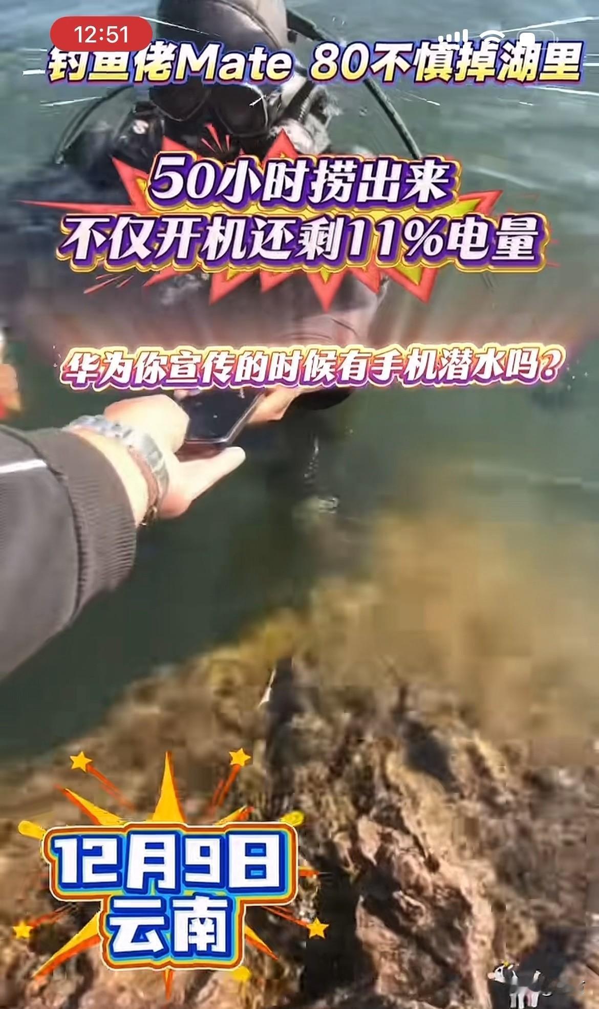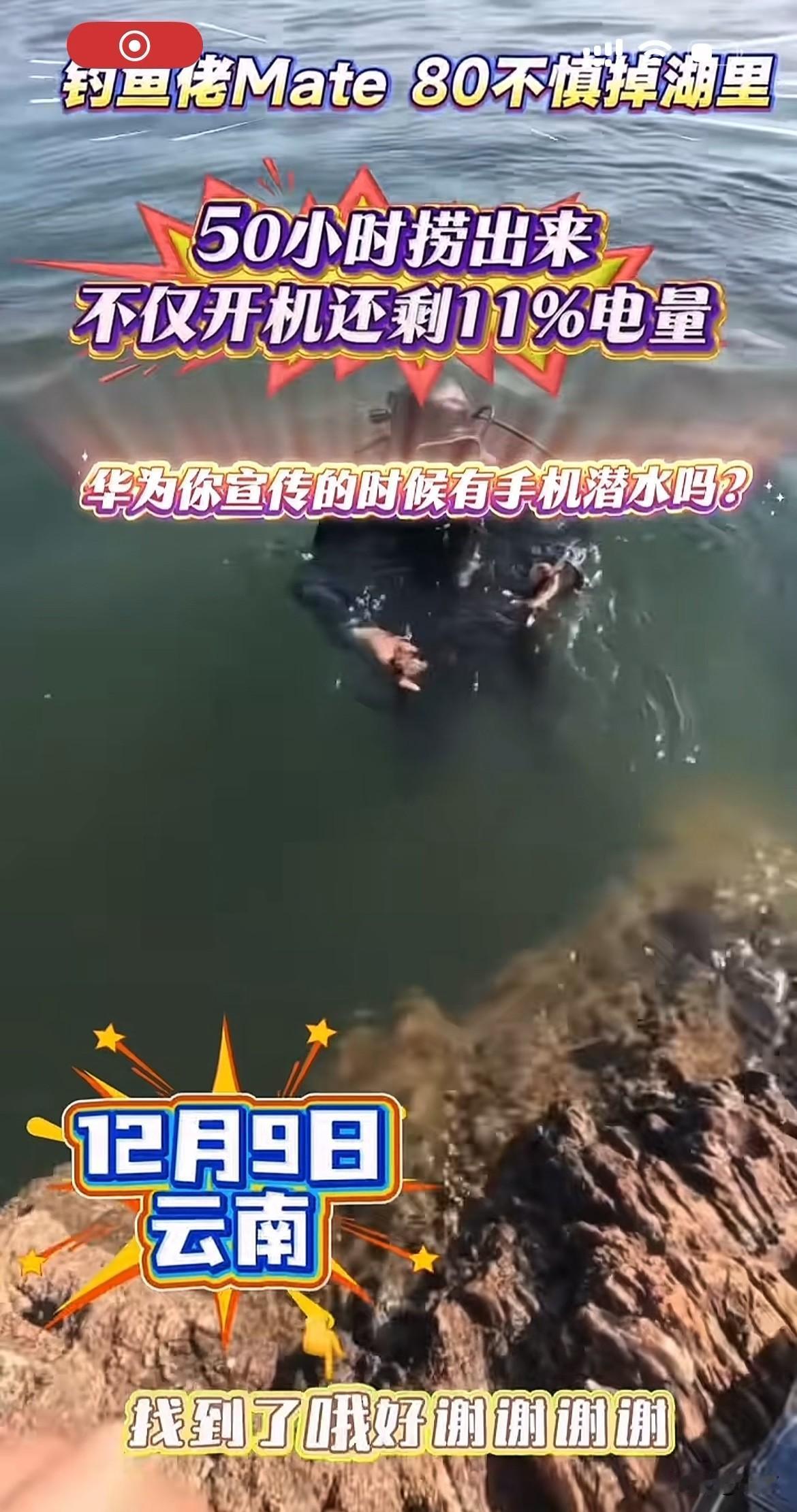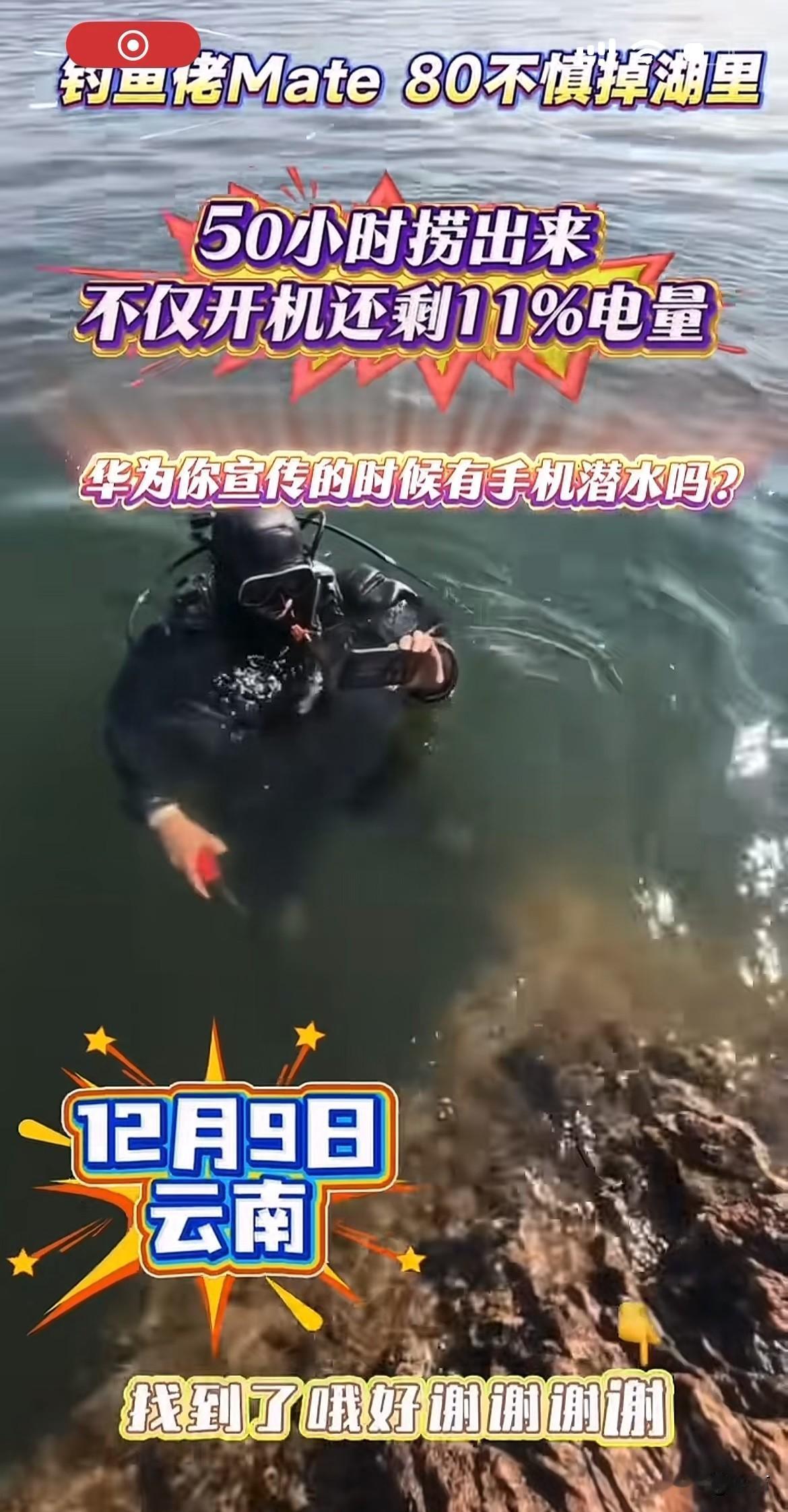 硬核:云南钓友的华为Mate80,掉湖里51小时捞起还能用[捂脸] 就在刚才,有朋友在社交网络发了一段视频,当中说话的男子听声音好像是一名中年大叔,根据他发的这个视频位置来看,应该是在云南的阳宗海[捂脸] 这位钓友不知道是不是在甩杆的时候,不小心手机从口袋里面滑出去了,看到这个样子,应该是因为资深的钓友,估计这种事情在他的钓鱼生涯中不是头一回遇到,所以这种场面当时他根本没有慌! 当然,慌也没有用,因为这里水深在3米以上掉下去了,用其他工具根本捞不起来。所以第二天他就来了专业的人员,带着专业的潜水设备,专门潜下去给他捞起来了,没想到捞起来的时候,手机不但没有进水,而且和平时一样正常的亮着。 根据他发这个视频来看,应该是前几天掉了到湖里面去的,可能是因为当时天气的视线不是很好,或者实在没办法[捂脸]所以他隔了几天才来打捞上来。 从他把手机拿上来的这个爱惜程度就能看到,他应该还是十分喜欢华为这个手机的,毕竟他已经贴了膜,还用了保护壳,捞起来之后,他的心情快乐指数咔咔的往上升,嘎嘎的说了几个牛x[捂脸]只是不知道回去了,会不会被老婆说!