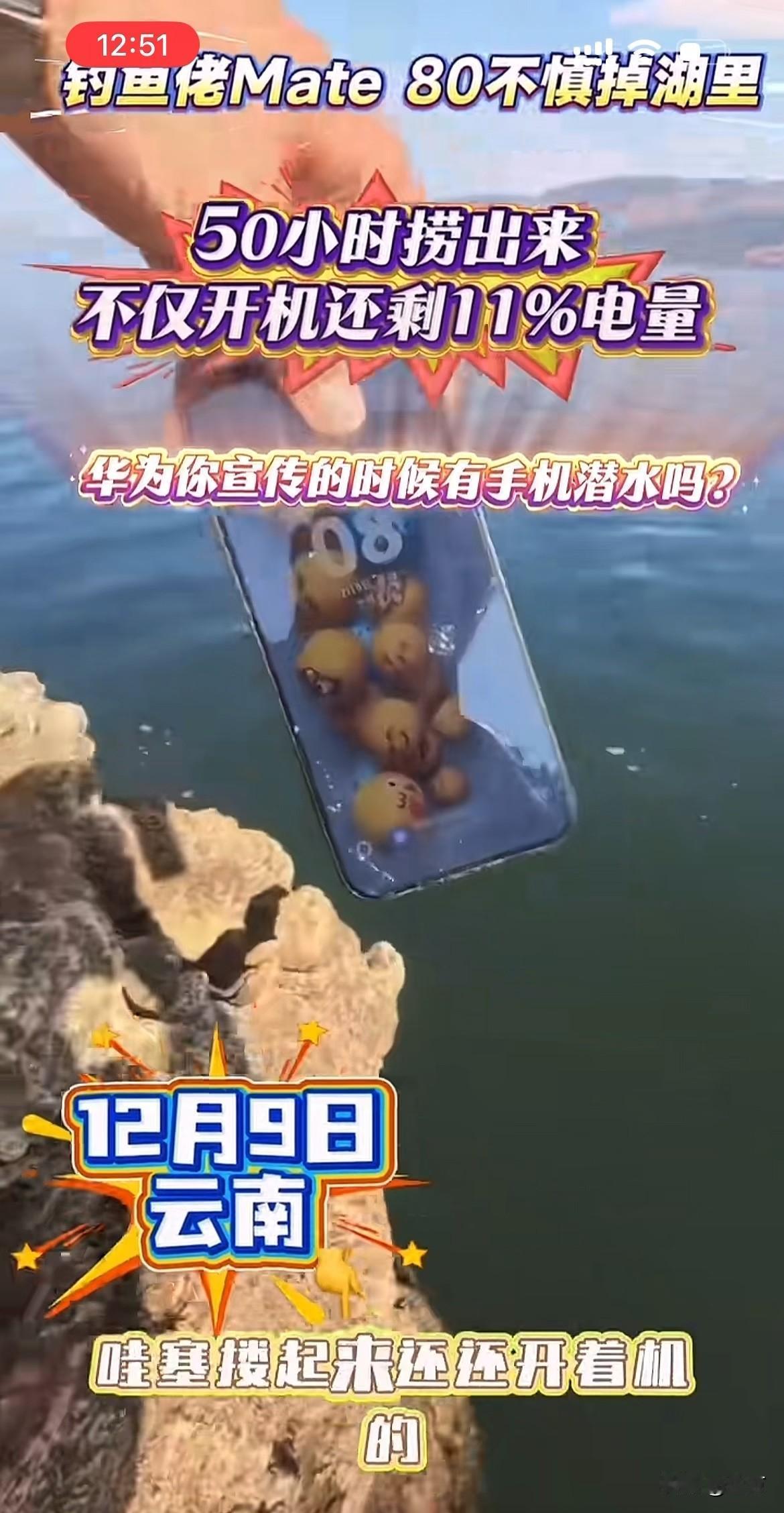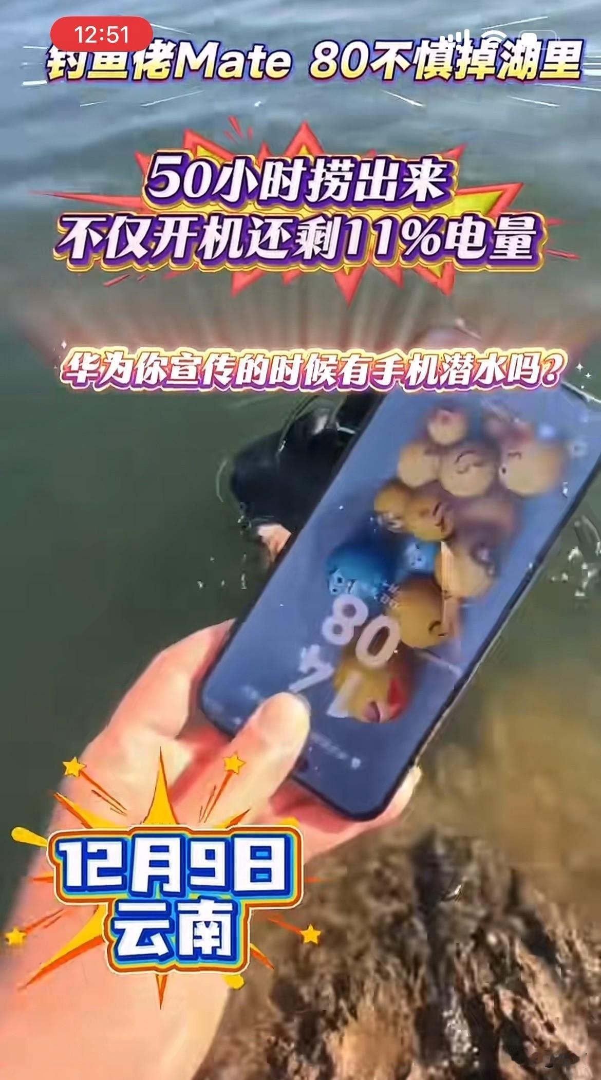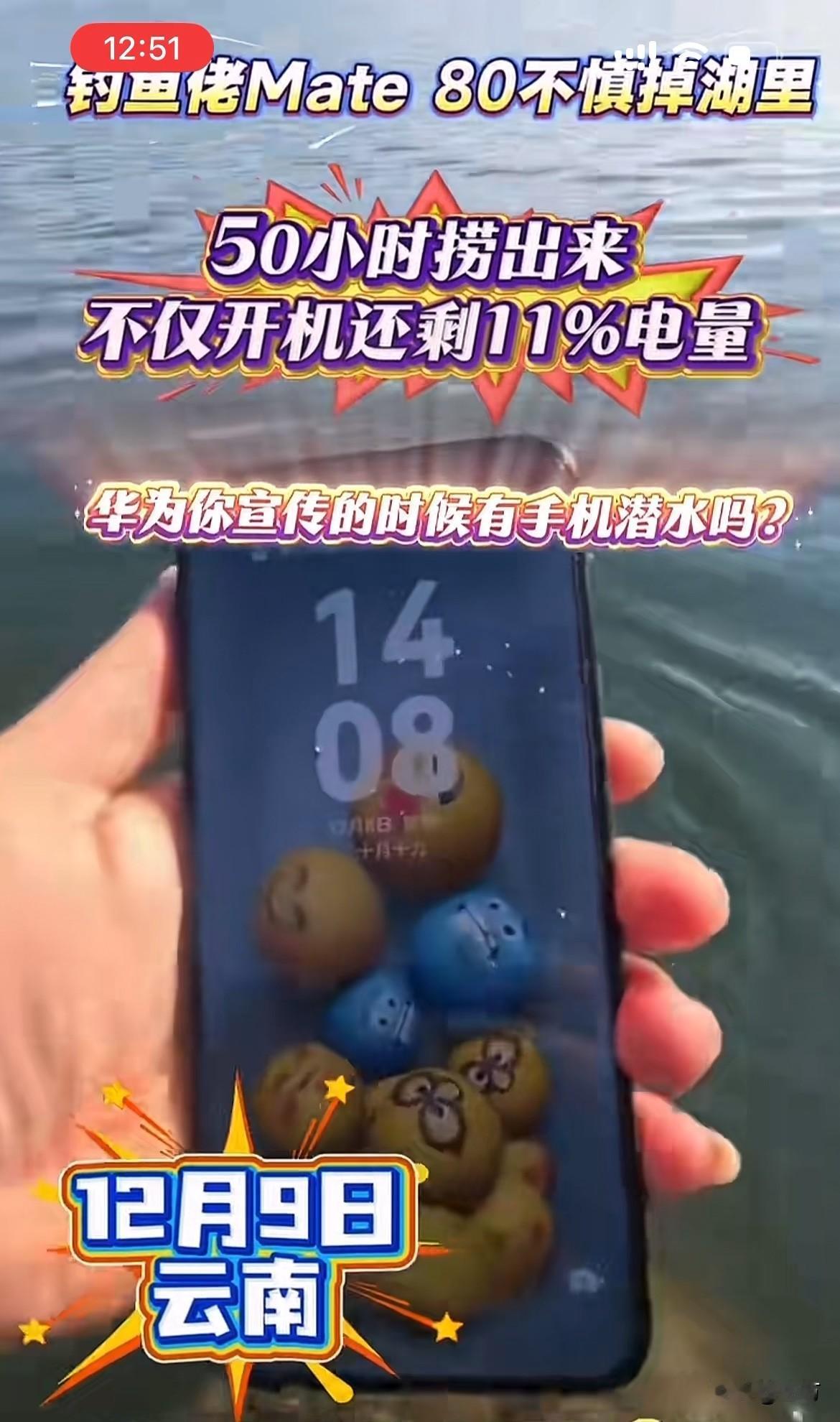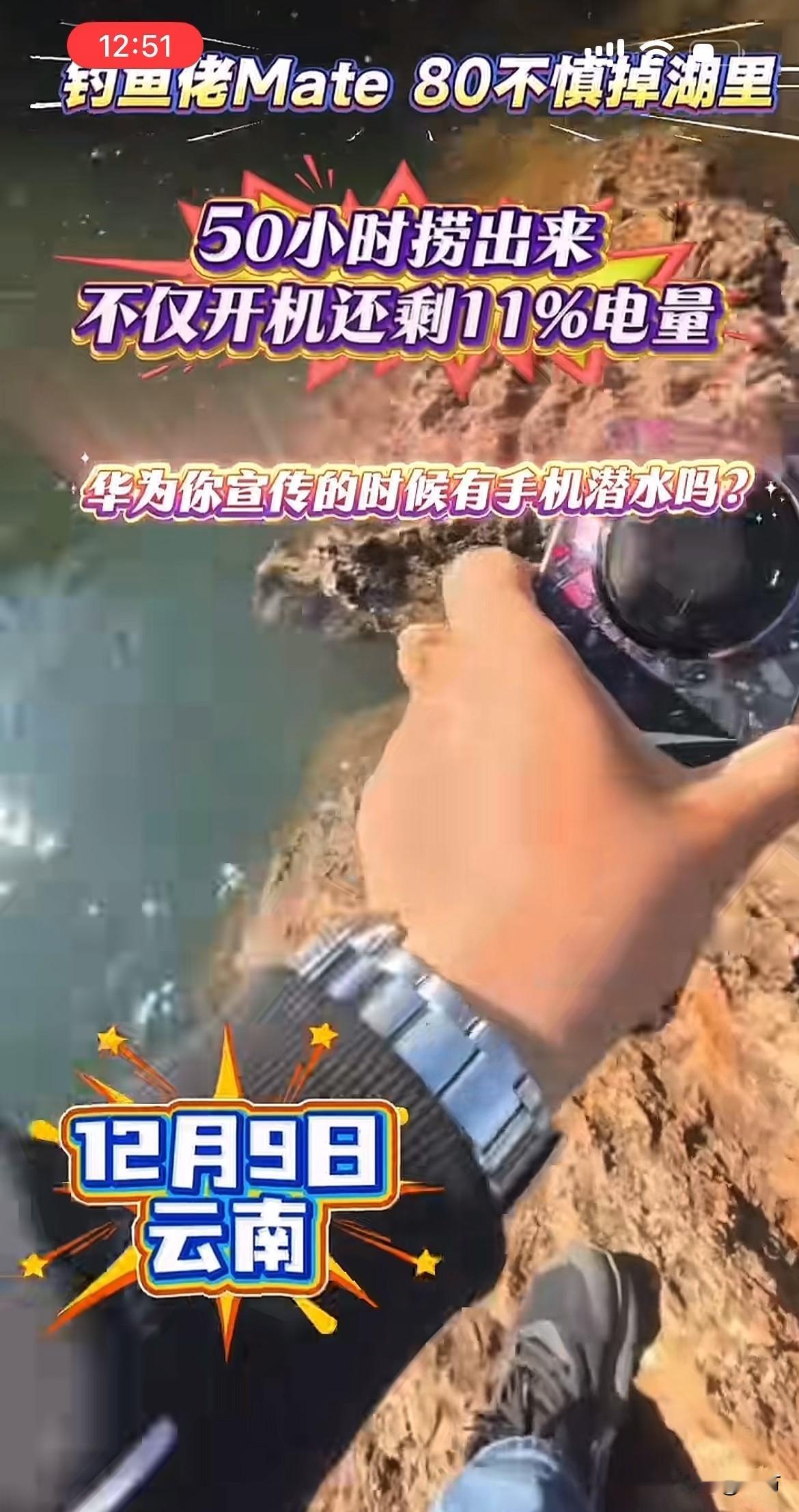 硬核:云南钓友的华为Mate80,掉湖里51小时捞起还能用[捂脸] 就在刚才,有朋友在社交网络发了一段视频,当中说话的男子听声音好像是一名中年大叔,根据他发的这个视频位置来看,应该是在云南的阳宗海[捂脸] 这位钓友不知道是不是在甩杆的时候,不小心手机从口袋里面滑出去了,看到这个样子,应该是因为资深的钓友,估计这种事情在他的钓鱼生涯中不是头一回遇到,所以这种场面当时他根本没有慌! 当然,慌也没有用,因为这里水深在3米以上掉下去了,用其他工具根本捞不起来。所以第二天他就来了专业的人员,带着专业的潜水设备,专门潜下去给他捞起来了,没想到捞起来的时候,手机不但没有进水,而且和平时一样正常的亮着。 根据他发这个视频来看,应该是前几天掉了到湖里面去的,可能是因为当时天气的视线不是很好,或者实在没办法[捂脸]所以他隔了几天才来打捞上来。 从他把手机拿上来的这个爱惜程度就能看到,他应该还是十分喜欢华为这个手机的,毕竟他已经贴了膜,还用了保护壳,捞起来之后,他的心情快乐指数咔咔的往上升,嘎嘎的说了几个牛x[捂脸]只是不知道回去了,会不会被老婆说!