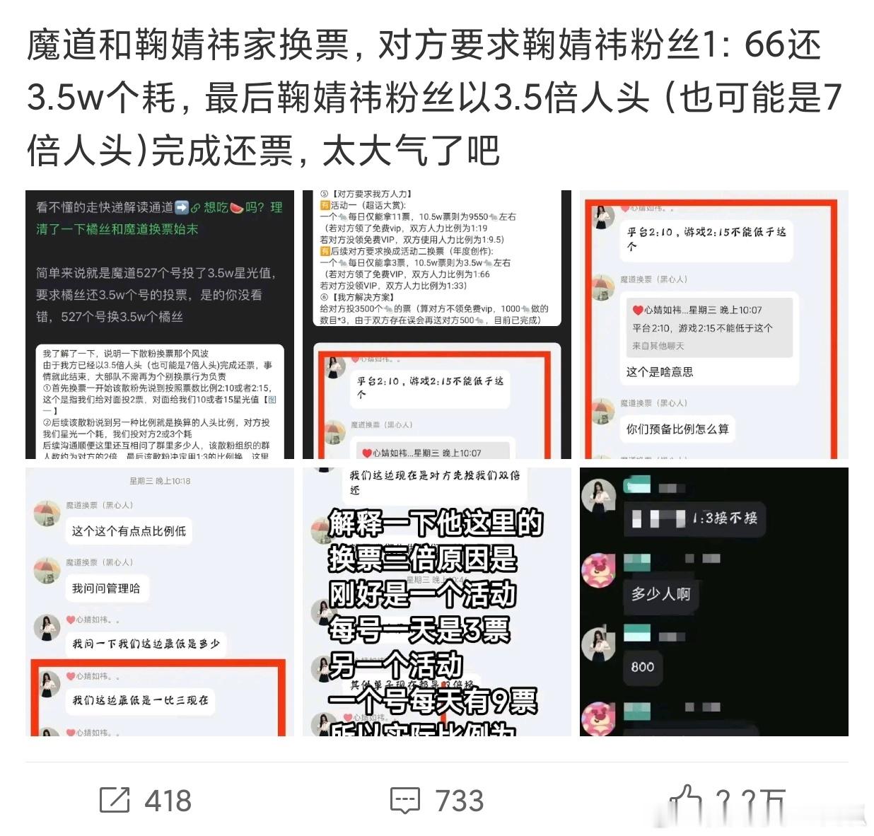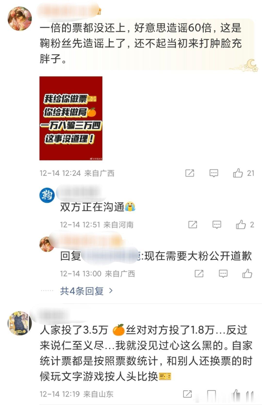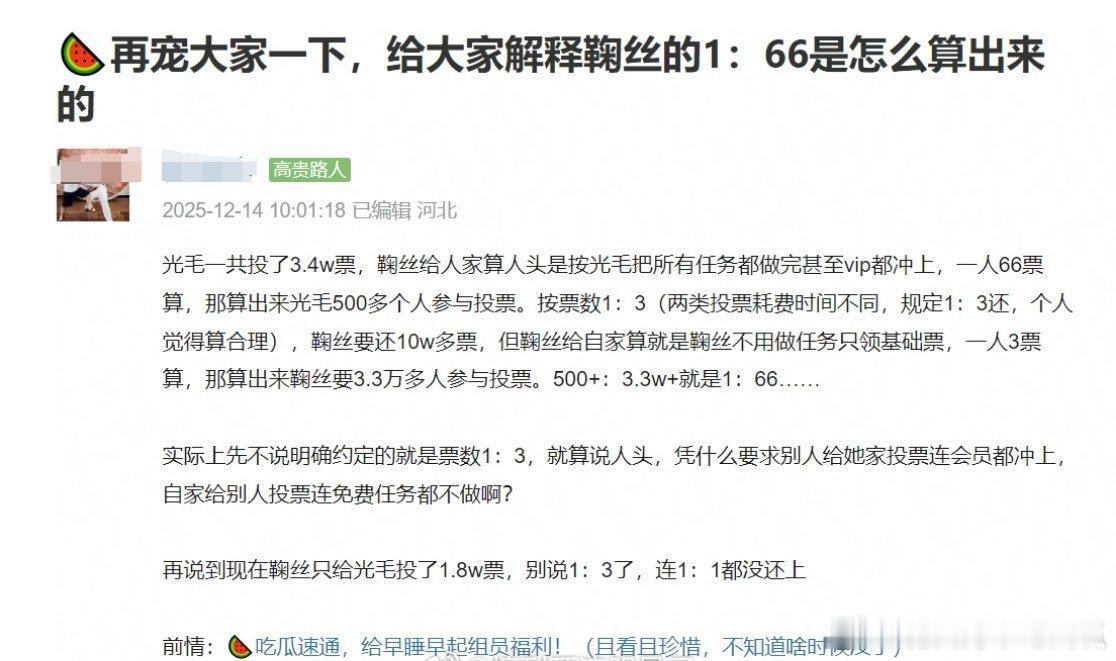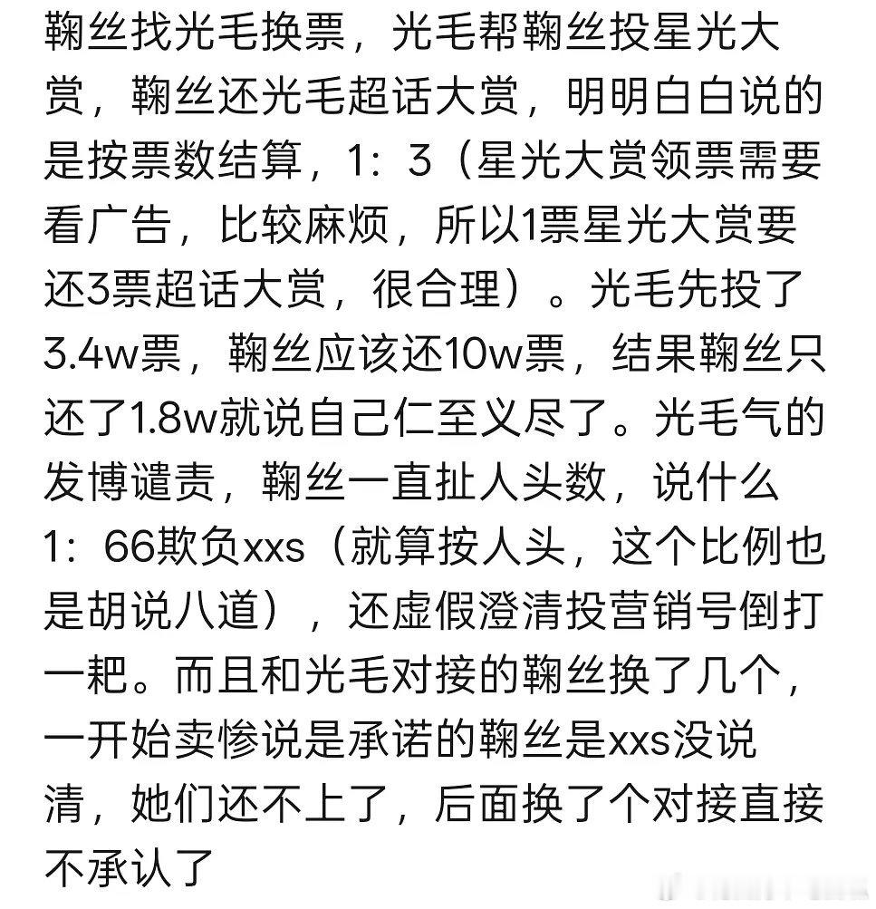 围观鞠婧祎粉丝跟《魔道祖师》粉的换票🍉光毛这边给🍊投了近3.5w🎫,最后🍊丝只投了1.8w,连1:1都没还完,就敢吹仁至义尽7倍人头了、、、这算赖票吗?按🍊丝的计算比例,光毛投星光大赏是要充会 员的,🍊丝只要免费就可以,现在被网友锐评零元购了😅鞠婧祎星光值排第一星光大赏数据异常报告