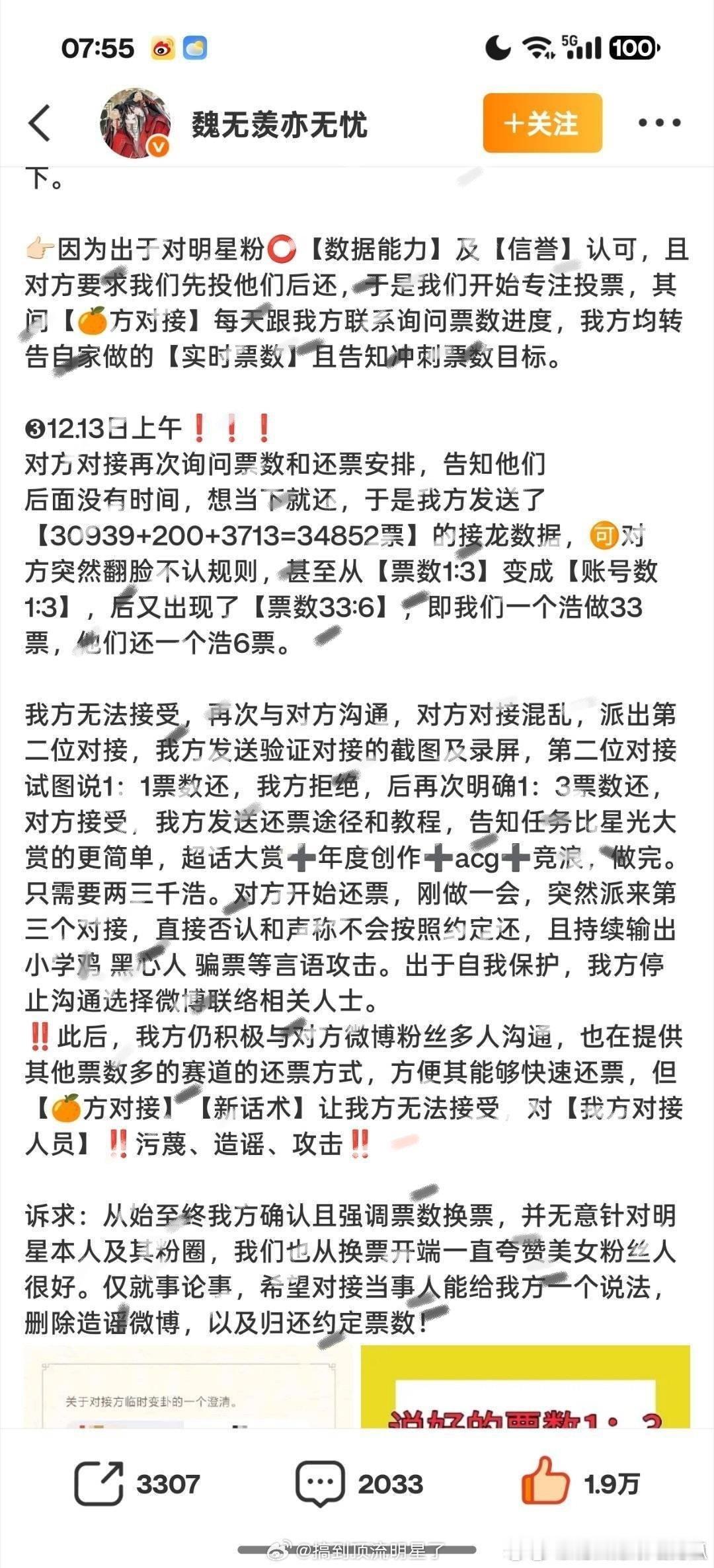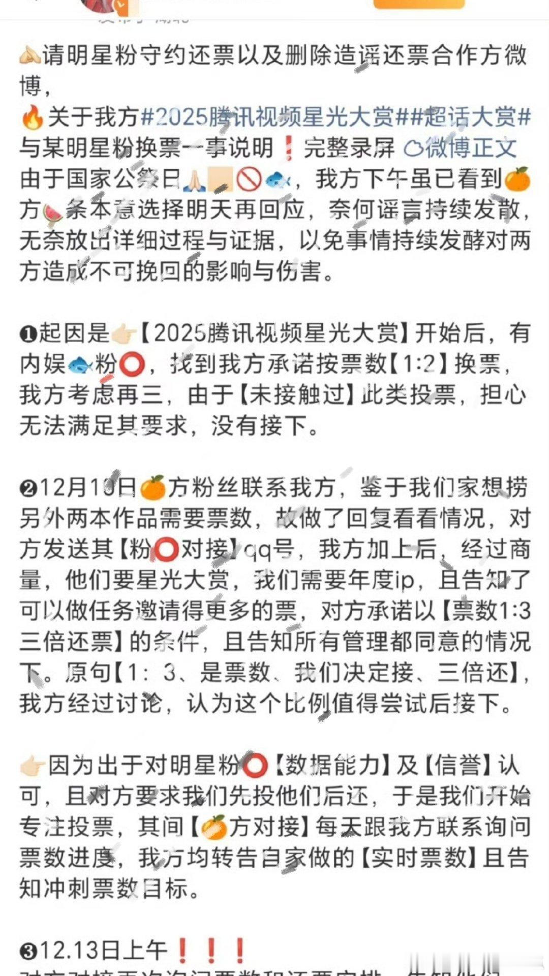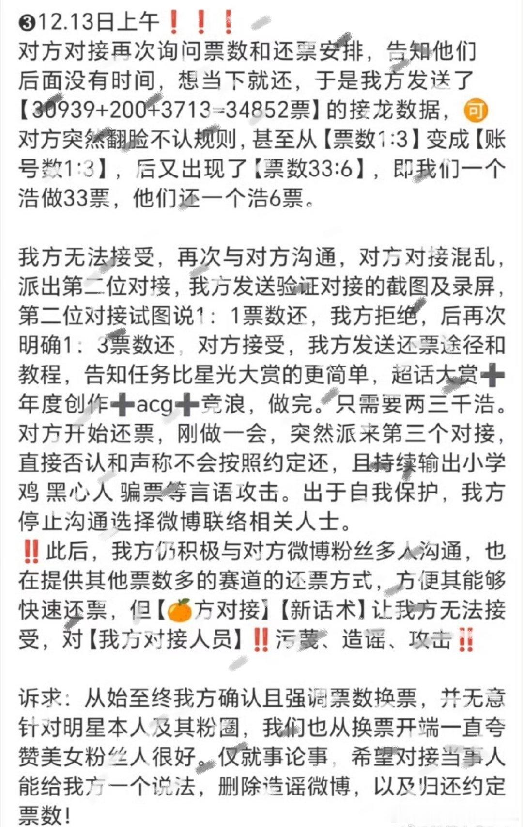 围观鞠婧祎粉丝跟《魔道祖师》粉的换票🍉光毛这边给🍊投了近3.5w🎫,最后🍊丝只投了1.8w,连1:1都没还完,就敢吹仁至义尽7倍人头了、、、这算赖票吗?按🍊丝的计算比例,光毛投星光大赏是要充会 员的,🍊丝只要免费就可以,现在被网友锐评零元购了😅鞠婧祎星光值排第一星光大赏数据异常报告
