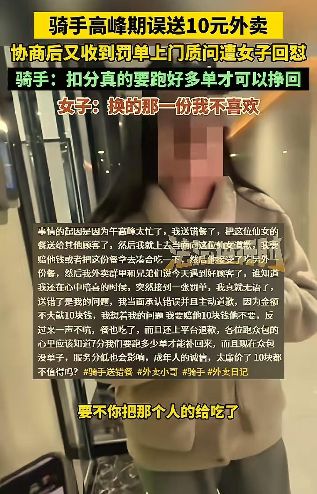 安徽,一骑手给女顾客送错了餐,他向女顾客道歉,并给出两个解决的方案,一是把送错的餐留下吃了。二是他把餐带走,赔钱给女顾客或者重新给女顾客买一份。女顾客选择留下送错的餐,可是吃了以后却选择投诉,让骑手气炸了! 中午送餐高峰期,骑手不小心把女顾客的餐送给了别人,等他给女顾客送的时候才发现送错了。 骑手赶忙向女顾客诚恳道歉,还贴心地给出了两个解决方案。他跟女顾客说:“要不您就把这送错的餐留下吃了或者我把这餐带走,赔您钱,或者我重新给您买一份您点的餐。” 女顾客思索了一番,选择留下送错的餐,也没让骑手赔钱。骑手当时心里还一阵暖乎,觉得自己运气好,遇到了一位通情达理的好人,还兴奋地在外卖群里对女顾客大加表扬。 可谁能想到,这表扬的话刚说出去没多久,骑手就收到了系统提示,显示女顾客投诉了他,一下子扣了他7分! 这可把骑手给整懵了,心里那叫一个无语。女顾客订的外卖才10块钱,就算赔钱他也不觉得有什么大不了的,但这扣分可就严重了。这分数直接影响到他接单,现在单子本来就少,这分一扣,他心里实在憋不下这口气。 于是,骑手直接找到女顾客,质问她:“您怎么能出尔反尔呢?明明当时您都同意我的解决方案了,怎么还在平台申请退款,害我被扣分啊?” 女顾客却不紧不慢地说:“你给我送的是别人的那份,我吃了一口发现根本不喜欢。” 骑手一听,火气“噌”地就上来了,大声说道:“那您这不是白吃了那份外卖,然后又把原本该付的钱退回来了吗?” 女顾客却理直气壮地回应:“这本来就是你的错!我在公司上班,你送错了,我就没时间下去买饭了。” 骑手说:“那我送到的时候不是和你说了,我可以赔你钱,要不你吃下别人那份外卖,或者我下楼重新给你买一份都可以,你当时也接受了方案,为什么还要投诉我!” 女顾客却满不在乎地说:“我不喜欢那个菜,我就扔掉了!” 骑手气得直跺脚:“你不喜欢,你开始就可以不接受啊!你直接给我打个电话,说那个菜你不喜欢,我再给你送一份过来都可以啊,你为什么要投诉我?” 女顾客还强词夺理道:“退的钱是你的吗?我向平台投诉的啊!” 骑手无奈地喊道:“你投诉平台扣的还是我的钱,钱无所谓啊,主要是扣分啊,扣了我7分,你知道我要跑多少外卖才能把这分跑回来吗?你接受了我的方案,为什么还要投诉!” 之后,骑手越想越气,就把这事情发到了网上,想让广大网友来评评理。 有网友说,我觉得女人也没什么错,这种事我也碰到过,骑手送错餐,我好心算了,但是真难吃呀,比我点的烂多了,那我还不能投诉了?你一句轻飘飘,我给你在点一份就完事了。我还要挨饿等一个小时。本就是你的失误, 也有网友说,、退款退货给差评都没毛病,但明明同意协商好了,却退款给差评,餐还留下来吃,做人就太缺德了! 还有网友说,如果遇到狠人,她后悔都没有机会。不是危言耸听,而是现实中确实发生过。 我认为,根本问题在平台。送错了,送迟了,小哥和客户协商一致的行为就应该是解决问题的正规途径,应该留痕且不允许扣积分。平台拼命压时间、压运费,美其名曰接受客户投诉,然后就扣小哥的钱和分,这实在不像话! 另外,在这场风波中,我们看到了人性的复杂。有的人,就像这位女顾客,抓着别人的过失,甚至是利用别人的过失,无限度地放大自己那点权利,把别人往死里整,把老祖宗的美德丢得一干二净,把人性的“坏”发挥到了极致。 而平台呢,在这其中也扮演了一个不太光彩的角色,没有建立起合理的纠纷解决机制,一味地把责任往骑手身上推。这不仅仅是一个送错餐的小事,它反映出了当下社会人与人之间信任的缺失、道德的滑坡以及平台规则的不合理。 如果我们不能正视这些问题,任由这种情况发展下去,那我们的社会将会变得越来越冷漠,人与人之间的关系也会变得越来越紧张。 所以,是时候反思了,我们每个人都应该从自身做起,多一些理解和包容,少一些计较和算计,让社会重新充满温暖和善意。