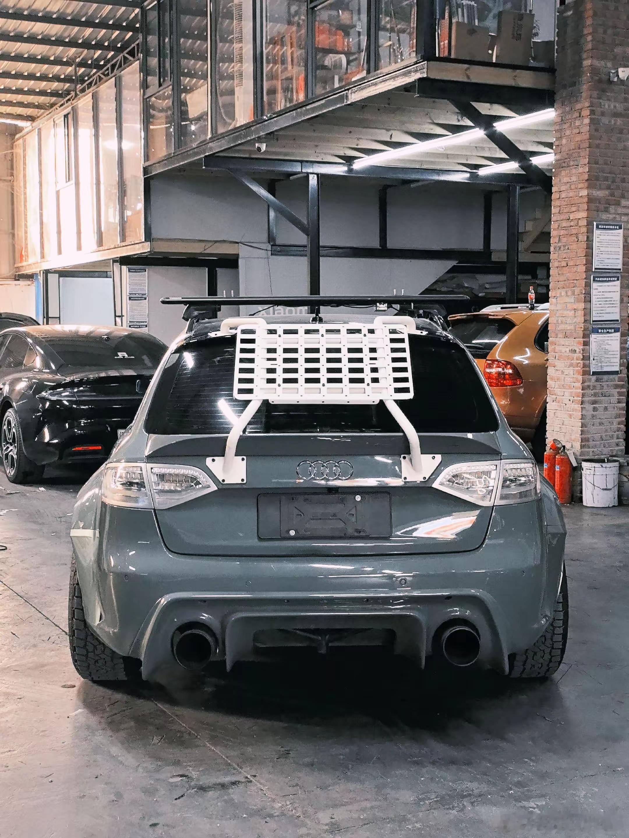 奥迪A4 Allroad尾门背架,这么一改后视镜看不见后面了,弄不好还会被交警叔蜀黍找麻烦。杀马特改装,欣赏不了这种调性。