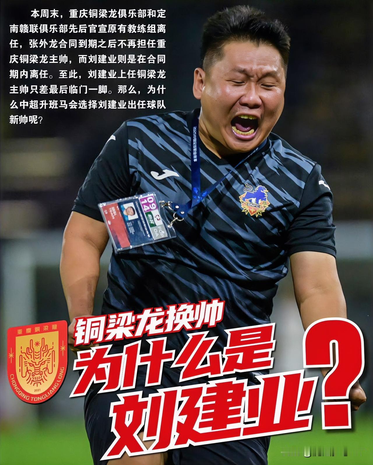 中超我最想不通的球队, 就是重庆铜梁龙了, 好不容易升到中超了,居然 选了个中甲还在合同期内的教练刘建业! 据报道,刘建业来到中超球队重庆铜梁龙出任主教练,涉及到了转会费,他目前与中甲球队定南赣联还有合同未到期。 就在这周末,中超重庆铜梁龙和中甲定南赣联两支球队各自官宣了球队主教练离任,其中张外龙在带队成功冲超且合同到期后离开铜梁龙,而刘建业却在合同还没到期就离开了定南赣联。 刘建业今年38岁,他竟然能从中甲直接升级到中超担任主帅,这让人感觉不可思议。重庆铜梁龙今年才刚升入中超,下赛季应该请一位有中超执教经验的主教练带队完成保级,至少也应该留用张外龙。 重庆铜梁龙请没有经验的刘建业出任主帅,还要支付一笔转会费,不知道球队管理层是怎么考虑的? 大家觉得重庆铜梁龙为什么要让刘建业担任球队主教练呢? 刘建业 重庆铜梁龙