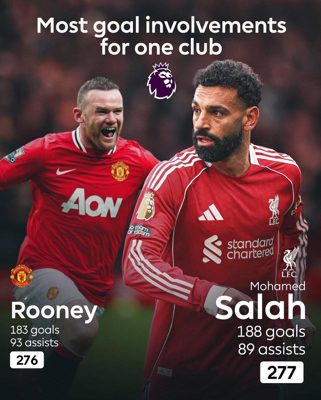 萨拉赫在对阵布莱顿的比赛中替补出场,并送出一个助攻,这使得他在利物浦的进球(188)和助攻(89)总数来到277,超越了鲁尼在曼联期间的276(183个进球+93次助攻)。