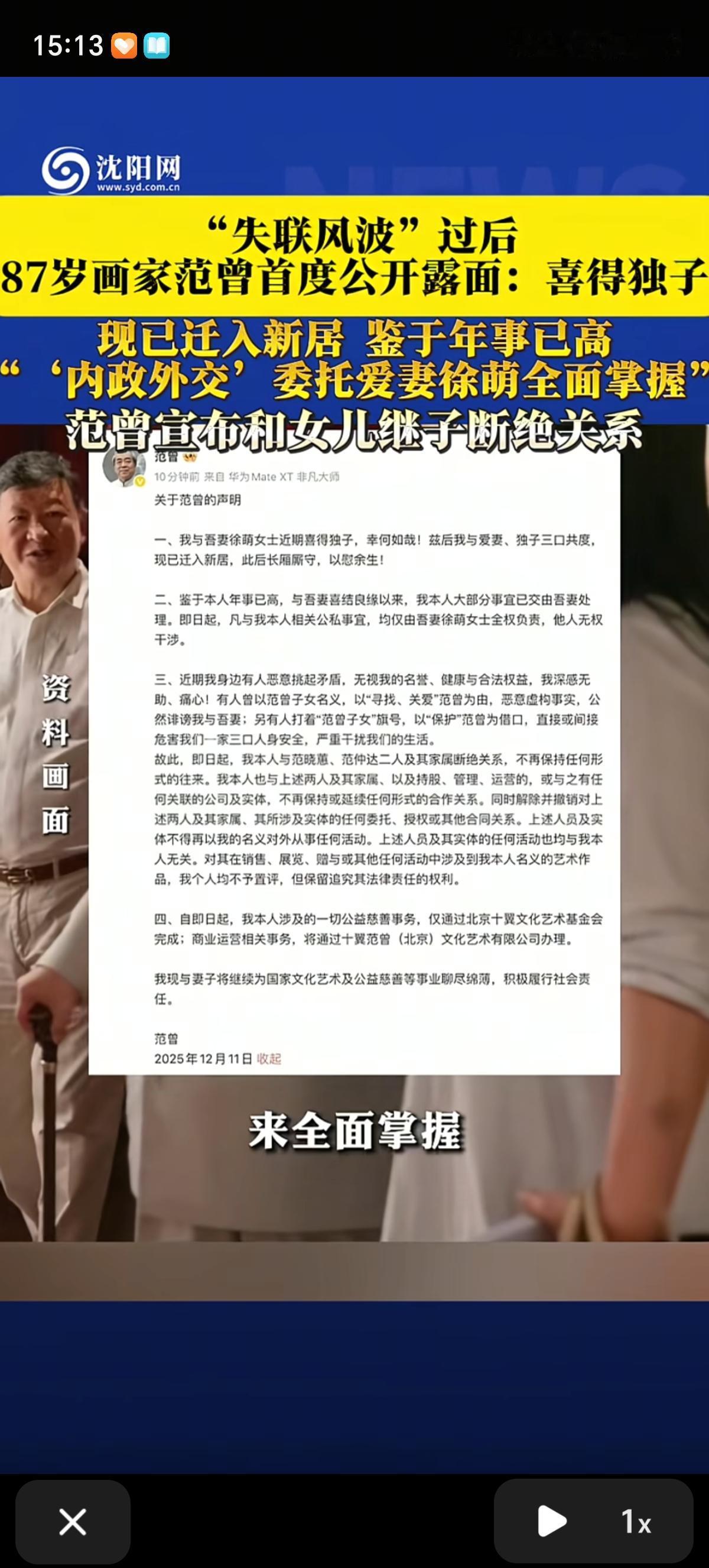 徐萌是范增的继子范仲达引荐给父亲范增的,说是看中她形象好、气质佳,做过模特和主持人,照顾自己父亲和生病的妈妈楠莉正合适,还能把父母的近况及时告知他,方便他照顾父母。 没想到徐萌表现的很出色,平时对楠莉的生活起居照顾的很周到,她把楠莉的饮食喜好、禁忌记得比家人还清楚,楠莉身体不适时,她还会整夜守在床边端水喂药、擦身按摩,照顾得无微不至。也正是这份“贴心”,不仅让周围人都夸赞徐萌,还让当时的范增对她颇有好感。 虽然徐萌照顾的挺尽心,楠莉还是在几个月后离去了。徐萌开始专心照顾范增,徐萌在照料过程中极为细心,不仅打理范增的饮食起居,还陪他聊书画、看展览,满足了他晚年对陪伴和精神共鸣的需求,没几年他们就结婚了。 新婚第二年就为范增生下了儿子,同年,范增女儿范晓蕙曾公开求助,称父亲被徐萌带离后失联,家中书画珍品疑似被转移。而范增后续发布声明,不仅官宣得子的喜讯,还宣布与女儿、继子等亲属断绝关系,将名下所有资产及相关事务全权交由徐萌负责。 徐萌是个很有能力的人,掌管公司后以持股51%成为公司的实际控股人,迅速把公司原来的管理层换掉了,工作群和公章也换了,直接接管了继子范仲达等人负责的书画生意。 徐萌接管公司后,立刻和三家上市公司谈文创合作,推出丝巾、瓷盘、NFT等衍生产品,把收益重心转向授权分润。 她还换掉了长期合作卖画的荣宝斋,并让丈夫范增发声,以后所有的合作都是妻子徐萌管理的新公司负责,和女儿、继子的公司没有关系了。