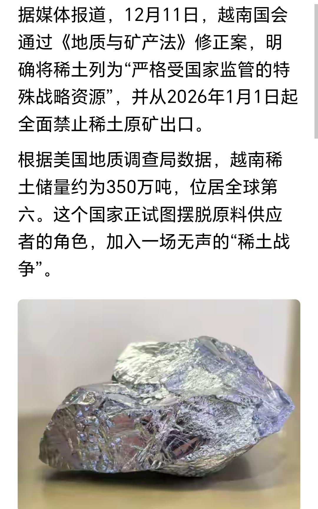 越南也禁止稀土出口了?他有提纯能力吗?如果没有,那就只是一个表态而已。 越南储量全球第六,这次禁止矿产出口,不过是想自抬身价,试图在与美国的谈判中多一个筹码而已。 美国这次确实被稀土卡脖子卡到翻白眼,满世界找稀土。 越南现在加入稀土管制,无外乎就是想要告诉美国,别老是拿关税威胁我,现在我也有你想要的东西。 其实,越南真的能解决美国的稀土需求吗?不重要,只要能让美国相信就可以了。 点右上角关注我,我们一起去看这个魔幻的世界