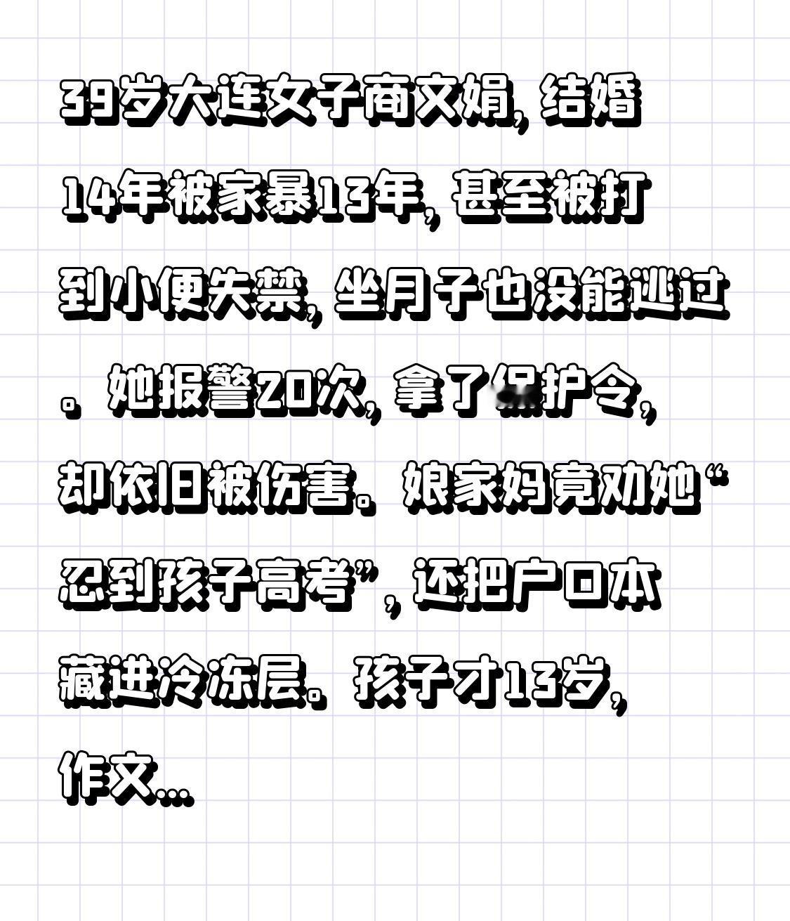 39岁大连女子商文娟,结婚14年被家暴13年,甚至被打到小便失禁,坐月子也没能逃过。她报警20次,拿了保护令,却依旧被伤害。娘家妈竟劝她“忍到孩子高考”,还把户口本藏进冷冻层。孩子才13岁,作文里满是对爸爸家暴的恐惧。 她不是不想逃,工资卡被丈夫拿着,微信转账限额,花呗被透支。家暴理由千奇百怪,菜咸、拖鞋摆歪都能成为挨打的借口。“家丑不可外扬”害了太多人,幻想对方忏悔也是徒劳。家暴不是家务事,必须要勇敢站出来反抗!