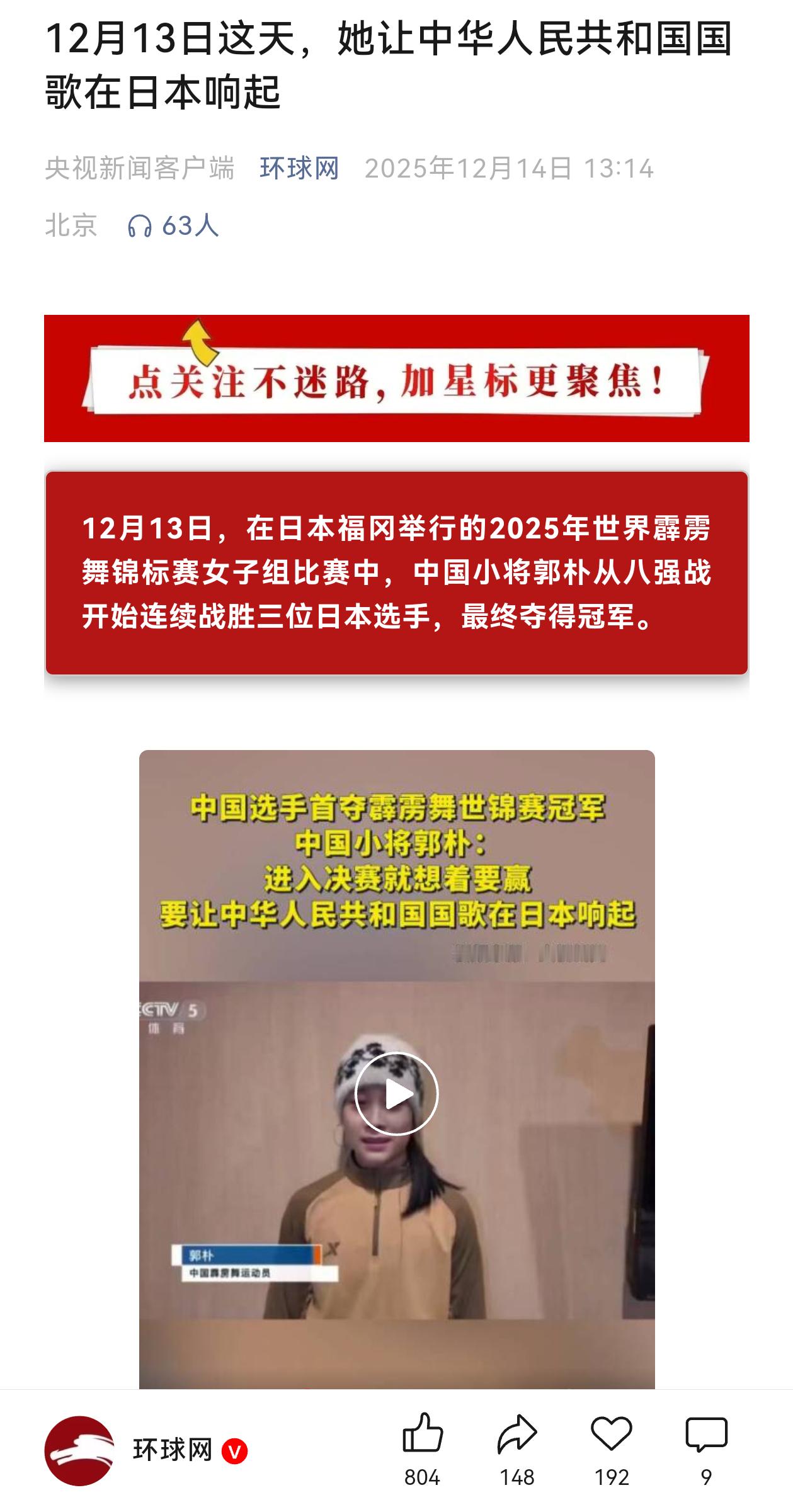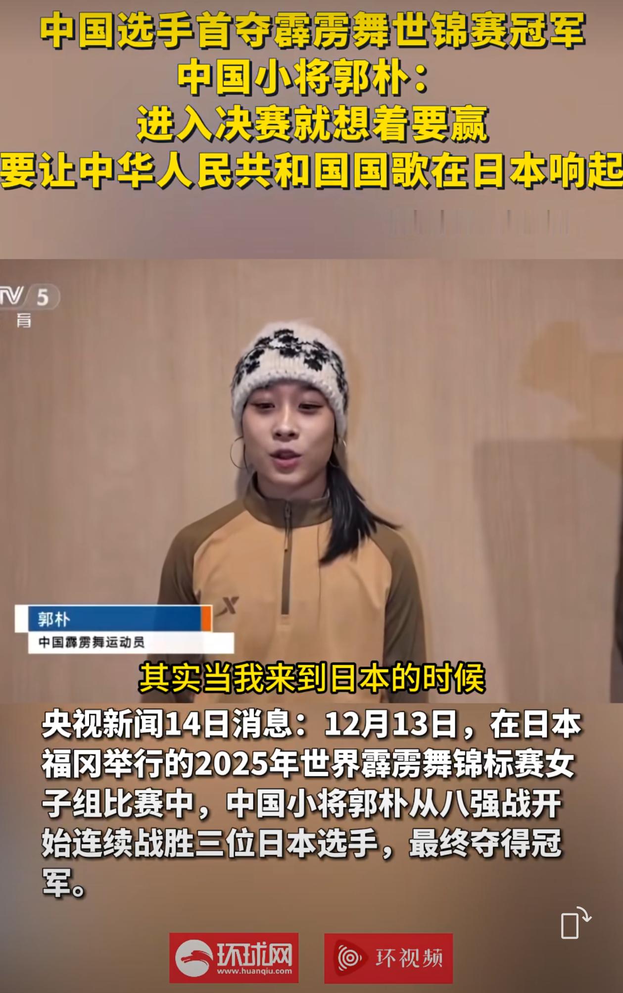 抗日名场面+1——中国小将郭朴从八强战开始连续战胜三位日本选手,最终夺得2025年世界霹雳舞锦标赛女子组冠军,让中国国歌在12月13号在日本响起。热点观点