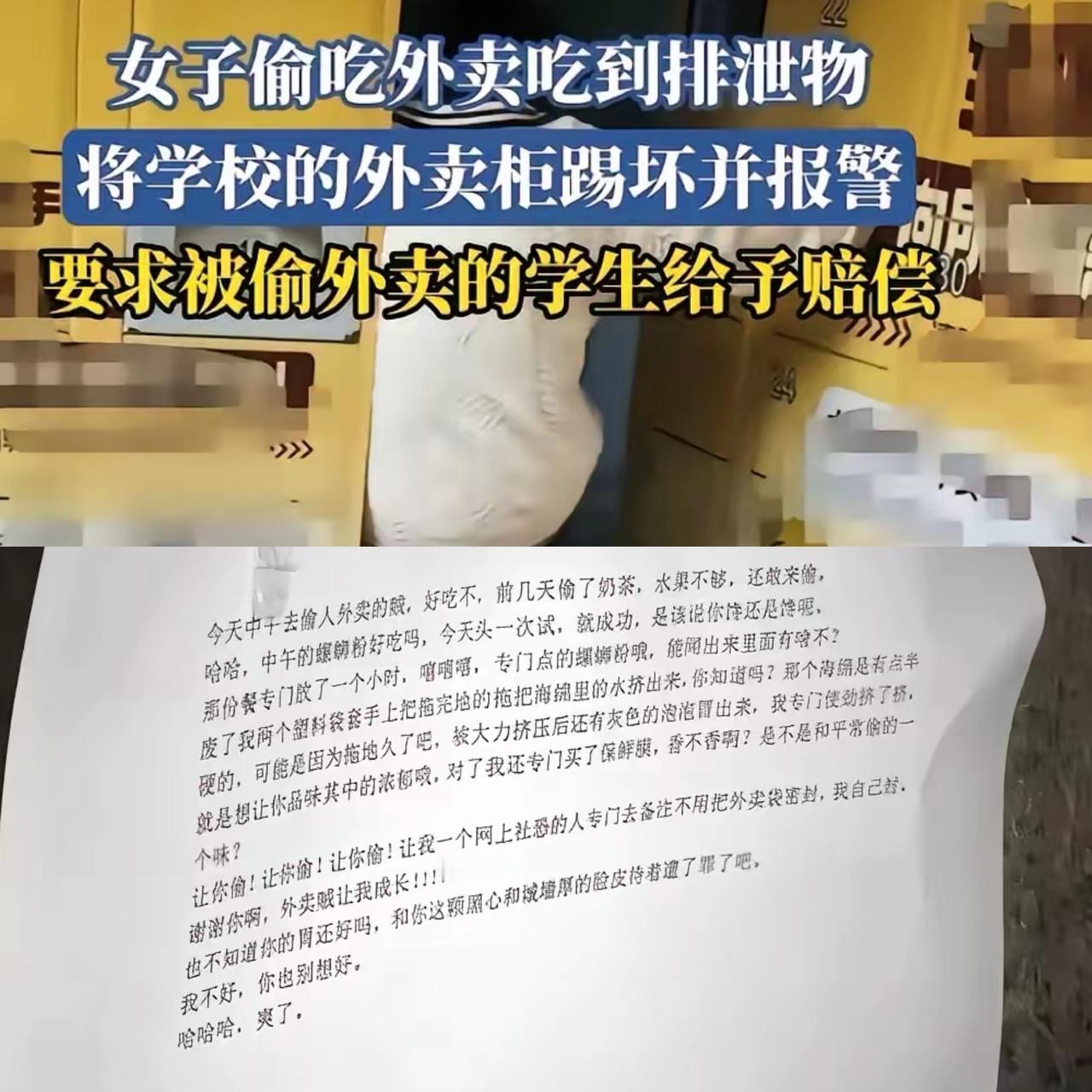 这是我见过最爽的惩治偷外卖的方法!广西某高校一女子偷外卖,这次偷到加过粪便的外卖,她吃了后发现不对看到汤底后才发现是排泄物——然后把气都撒在快递柜身上。 学校这名偷外卖的女子,绝对想不到自己偷的螺蛳粉里藏着“大招”。被偷的同学忍无可忍,用排泄物加料去反击,就是要治治她的嚣张气焰。 她偷吃完才发现不对的她,居然还有脸去砸快递柜、还找民警索赔,这厚脸皮真的是刷新三观。 偷外卖本就是没底线的贪小便宜,被反制纯属自食恶果。但必须说,这种私自制裁的方式真的不可取,很容易触犯法律,把维权变成违法,得不偿失。 对付惯犯,解气从来不是第一位,守住法律底线才是正道。 真正能根治偷外卖的,从来不是以恶制恶,而是让小偷付出应有的代价。 你觉得高校里该怎么从根源上杜绝外卖被盗的问题?评论区聊聊外卖盗窃 广东女偷外卖 ~