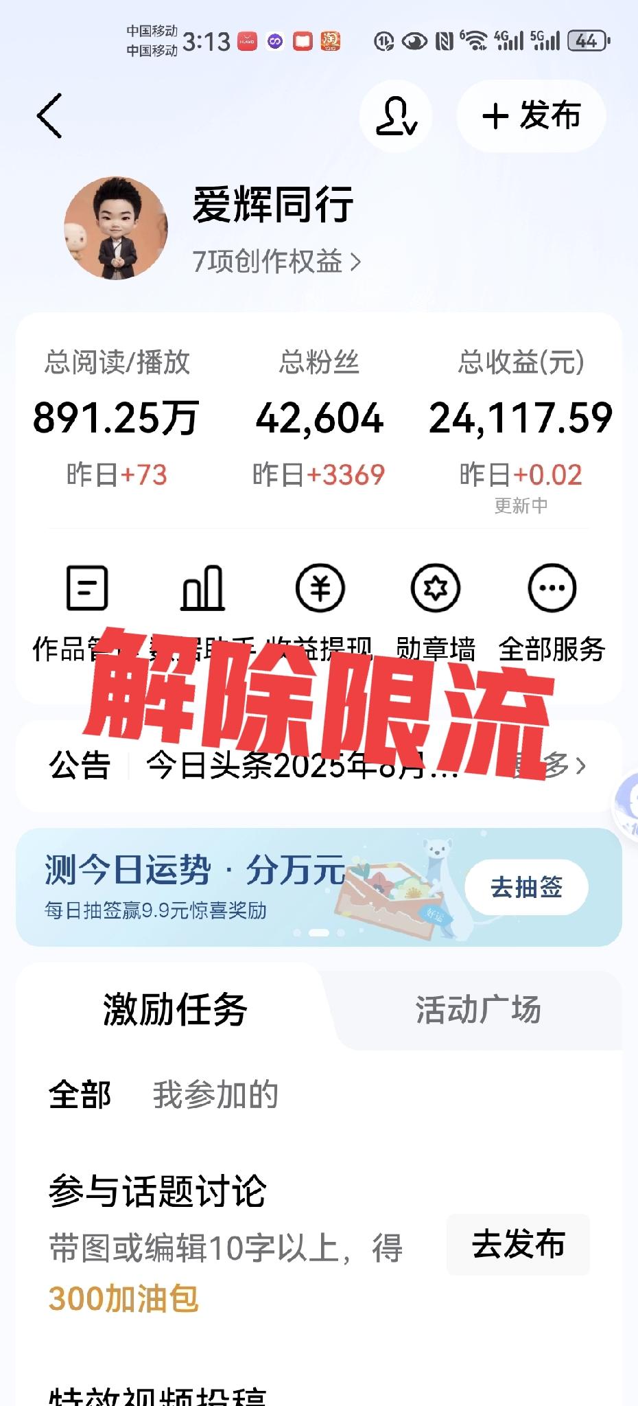 刚刚说要注销这个账号,头条粉丝一天之内就上涨了3000多个,而且目前粉丝已经涨到了4.2万,真的是令人感到瞠目结舌。难道是头条平台要挽留我吗?粉丝上涨没什么,关键是要有流量呀,发出去的作品没有流量,要那么多的粉丝又有何用,希望头条平台能够解除限流。让我的作品有流量呀,我的作品都是原创作品,每一篇文章都是纯手搓! 从开始创作到目前为止,已经有两年的时间了,这两年时间里,一共创作出了1000多篇作品,真的是很辛苦的,如今却被限流,真的是令人感到无言以对,痛苦不堪! 想创作,但是没有空间,想写文章,但是没有流量,这就是两难的境地! 希望头条平台能够给老作者一些流量,解除限流状态,真的是不知道什么原因被限流!