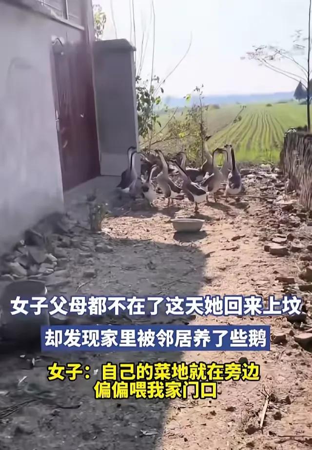 安徽,女子父母都不在了,她回家上坟,发现大门口被邻居用铁丝网围住,养了一大群鹅,鹅屎糊了一地。女子非常气愤:他家菜地就在旁边,凭什么在我家门口喂鹅? 女子攥着给父母准备的纸钱,一步步往老宅走时,心里还揣着对双亲的思念。可刚拐过村口的老槐树,她就被眼前的景象呛得红了眼——自家老宅的大门被黑色铁丝网拦了个严实,网子里几十只大白鹅伸着脖子嘎嘎叫,地上的鹅屎混着烂菜叶,踩上去黏糊糊的,连台阶上都溅满了污秽。 这宅子是父母留下的念想,自从二老走后,她每次回来上坟都要仔仔细细把院子扫一遍,就盼着老宅能留着点家里的味道。可邻居倒好,仗着宅子平时没人住,直接把这儿当成了养鹅场。女子顺着铁丝网往旁边看,邻居家的菜地就在几步远的地方,地里还种着绿油油的青菜,明明有地方养鹅,却偏偏选了她家门口,这明摆着是欺负人。 她气冲冲地找邻居理论,对方却满不在乎地摆摆手,说“不过是养几只鹅,又没弄坏你家东西,至于这么较真吗?”这话更让女子心寒,父母不在了,老宅就成了她心里最后的根,邻居不仅不体恤这份情分,反倒借着宅子空置占起了便宜,说到底,是没把她这个孤女放在眼里,也没把别人家的私宅当回事。 乡村邻里本应是互相照拂的情分,可这位邻居的做法,却把“远亲不如近邻”的老话踩得稀碎。私宅再空,也是主人的地盘,别说用铁丝网围起来养鹅,就算是放个杂物,也该先跟主人打声招呼。退一步说,就算真有临时用一下的需求,也该保持基本的整洁,把鹅屎弄得满地都是,既是对他人财产的不尊重,也是做人基本素养的缺失。 更让人觉得膈应的是,邻居明明有自家菜地可以利用,却偏要选别人的家门口,这背后藏着的,恐怕是觉得女子父母不在,她一个外嫁的女儿好欺负的心思。这种借着别人的难处占便宜的行为,比单纯的不讲理更让人反感,既寒了邻里情,也丢了乡村里最该有的厚道。 女子的气愤,不只是因为家门口被弄脏,更是因为这份被轻视、被欺负的委屈。父母留下的老宅,是她对故乡最后的牵挂,邻居的做法,无异于在她的心上扎了一根刺。邻里之间,哪怕做不到互帮互助,也该守好边界,别让自己的便利,建立在别人的委屈之上。 各位读者你们怎么看?欢迎在评论区讨论。