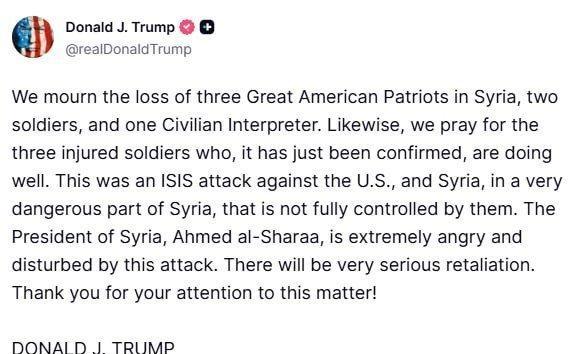美军在叙利亚遭伏击3人死亡,特朗普表示将报复,有何看法? 当地时间12月13号,美国五角大楼发言人发文表示,2名美国士兵和1名美国翻译在叙利亚帕尔米拉执行反恐任务时遭ISIS伏击死亡,另有3人受伤。 特朗普对记者表示,他将和他口中的叙利亚新总统合作,对ISIS进行报复。 ------------------------------------ △天空新闻网报道,3位叙利亚官员向媒体披露,周六发生在该国中部城市帕尔米拉袭击美军男子是叙利亚安全部队的成员。1位叙利亚内政部发言人对叙利亚电视新闻频道"新闻"表示,袭击者并未在安全部队中担任领导职位,但未说明其是否为低级军官。 △天空新闻网另一篇报道披露,一位要求不透露身份的军事官员表示,枪击事件发生在叙利亚军官和美国官员在叙利亚历史古城帕尔米拉的安全部队总部会面时。据美国方面透露,周六在叙利亚遭袭击时有3名美国人被杀,他们是两名美军士兵和一名平民,是在“武装分子设伏”中被杀的。美国方面指出“发动袭击的武装分子属于达伊沙恐怖组织”。中东美军司令部(中央司令部)也宣布另外3名士兵在这次袭击中受伤,并指出枪手已被击毙。 △美国军队一直在叙利亚不同地区保持存在,包括在霍姆斯省中部的坦夫营地,以培训其他部队,尤其是叙利亚东部美军至今部署了数百名军人。美军频繁对所谓的极端组织动武,就在周日美国军方还曾宣布,在与叙利亚军队的合作下,于11月24日至27日发动数次空袭和地面袭击,炸掉位于叙利亚南部“达伊沙”组织的15个武器仓库,摧毁了超过130枚迫击炮和导弹,以及许多攻击性步枪、机枪、反坦克地雷和自制简易爆炸装置的材料。 太巧了吧(安排妥当),上周鲁比奥在Fox News就“激进伊斯兰”专访,前几天库尔德人问题升温。