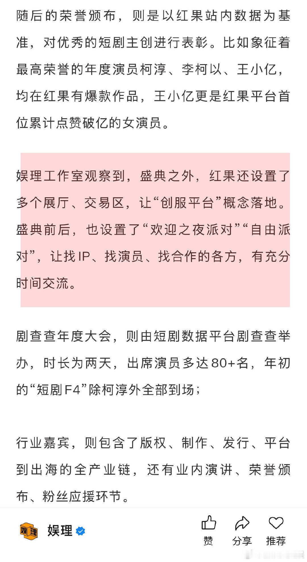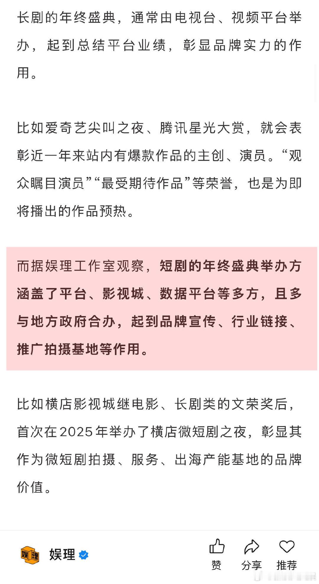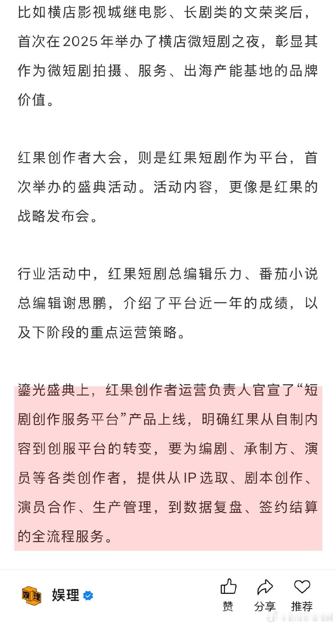 唐诡导演不认同短剧看多了就不看长剧 周星驰2022年就注意到了短剧 横店影视城继电影、长剧类的文荣奖后,首次在2025年举办了横店微短剧之夜,彰显其作为微短剧拍摄、服务、出海产能基地的品牌价值。红果创作者大会更像是红果的战略发布会。在鎏光盛典上,红果创作者运营负责人官宣了“短剧创作服务平台”产品上线,明确红果从自制内容到创服平台的转变…娱理独家↓